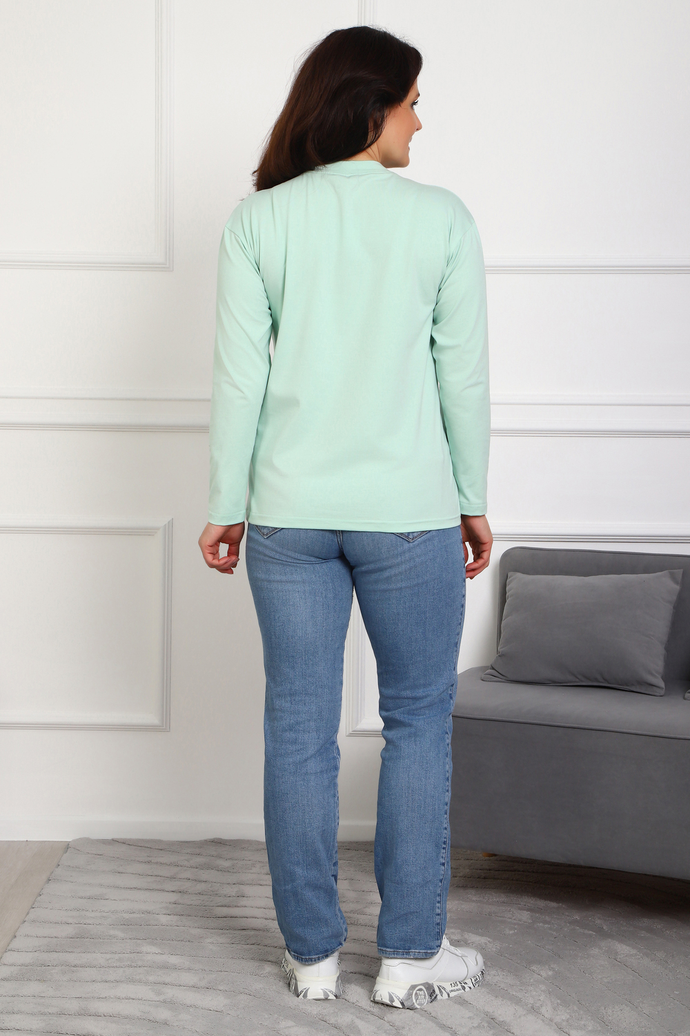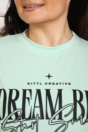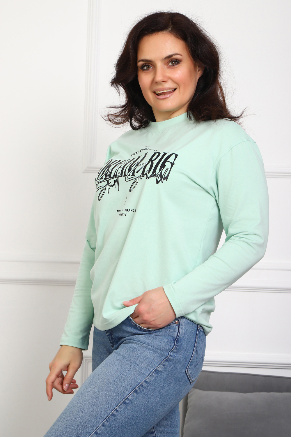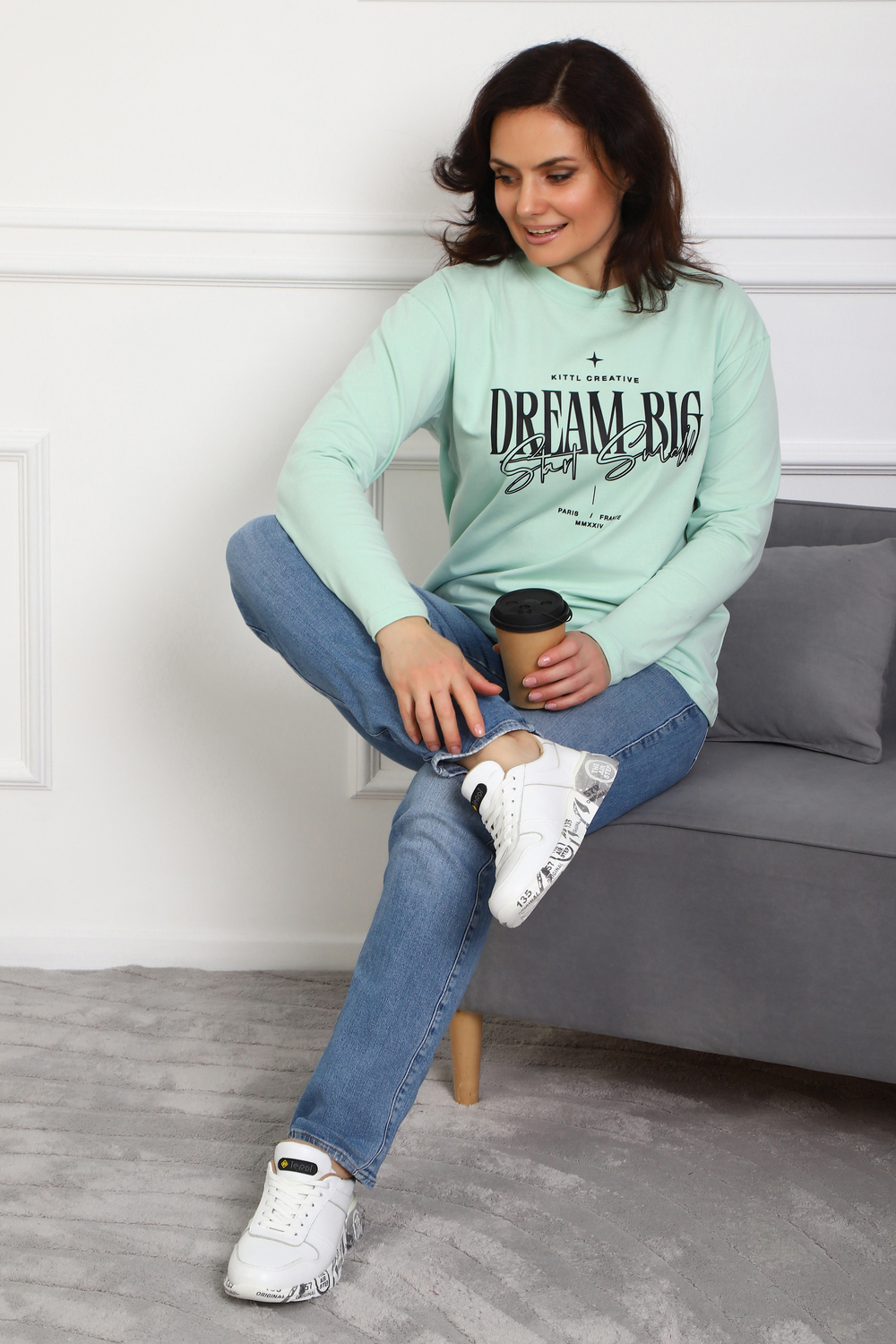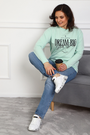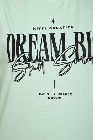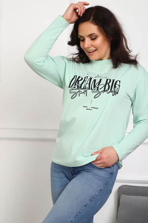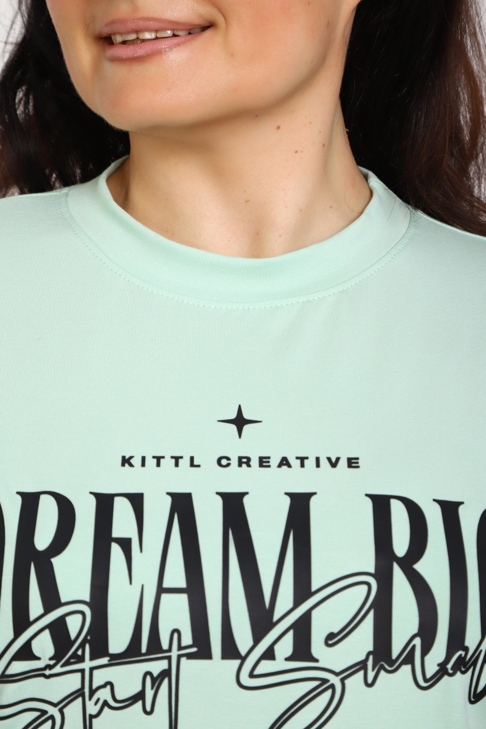 (Лонгслив женский DREAM BIG) Женский лонгслив свободного кроя выполнен из натуральной кулирки, состоящей из качественного хлопка (95%) и эластичной лайкры (5%). Прямой удлинённый силуэт модели подчёркивает комфорт и свободу движений, а мягкие длинные рукава обеспечивают дополнительное тепло и уют. Округлый вырез горловины дополняет лаконичный дизайн изделия. Центральный элемент образа — оригинальный принт на груди с мотивирующей надписью "Dream Big Start Small", вдохновляющий мечтать масштабно и начинать уверенно даже с малого шага. Этот универсальный лонгслив станет отличным выбором для повседневного стиля, сочетаясь как с джинсами, так и спортивными брюками.