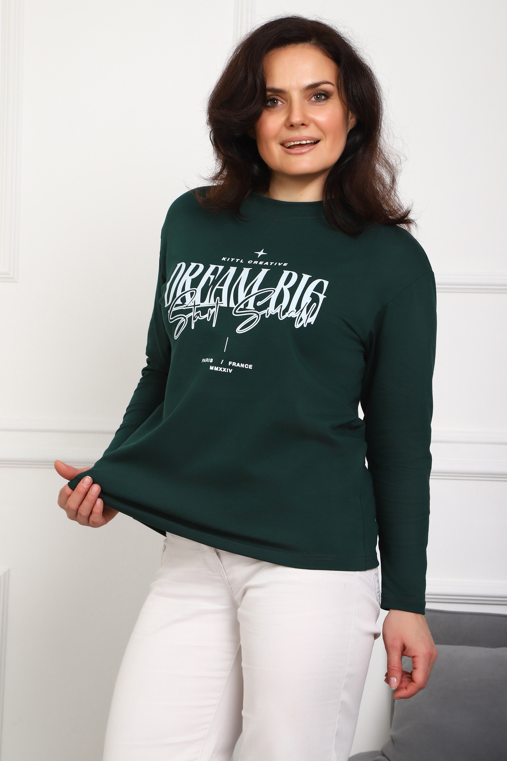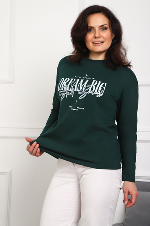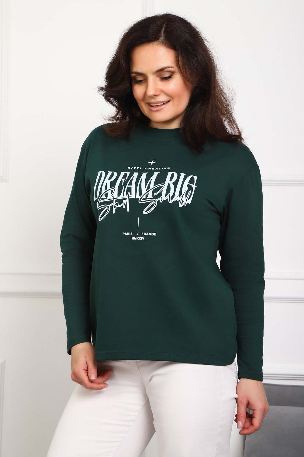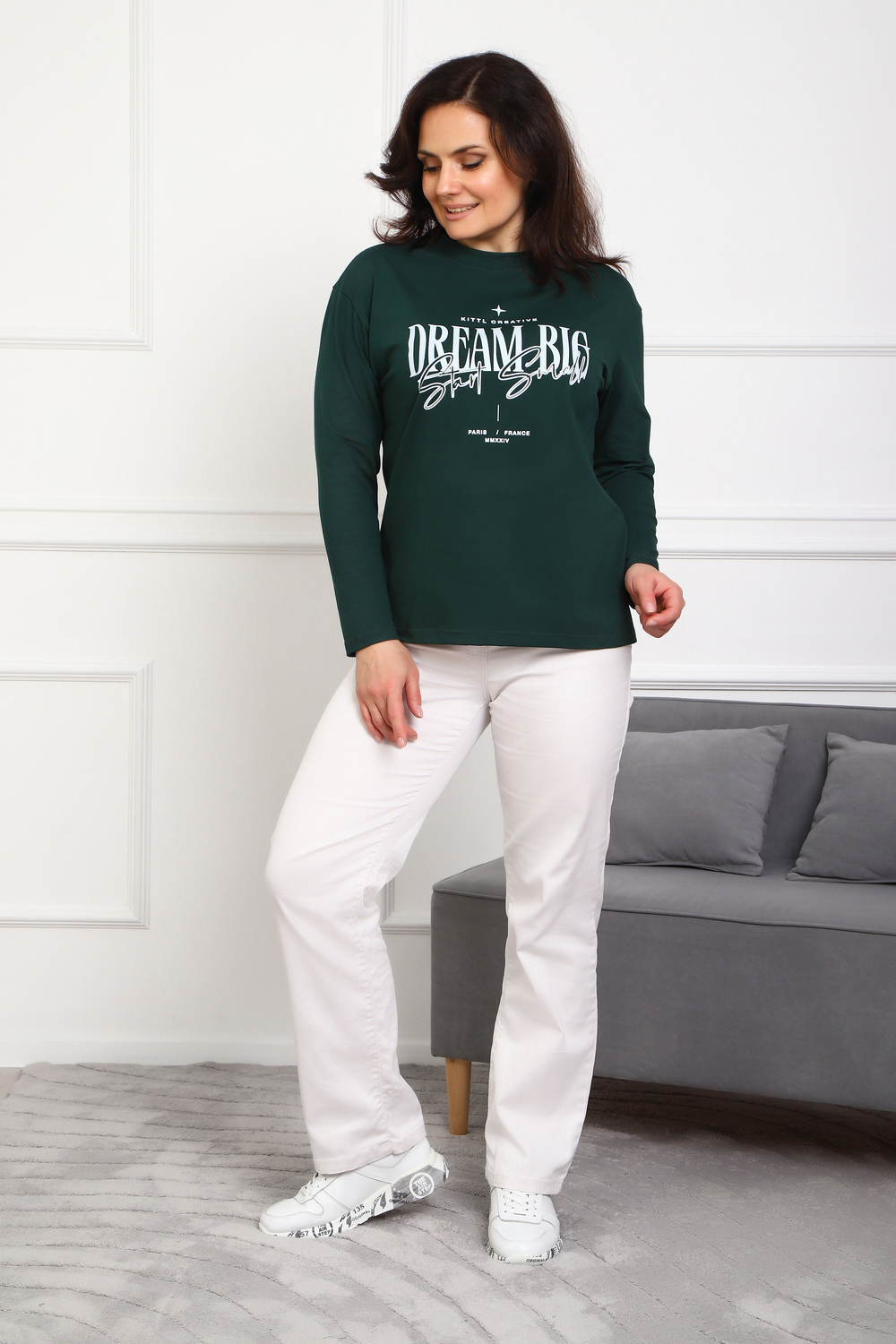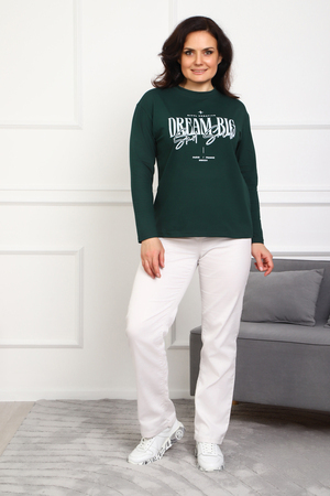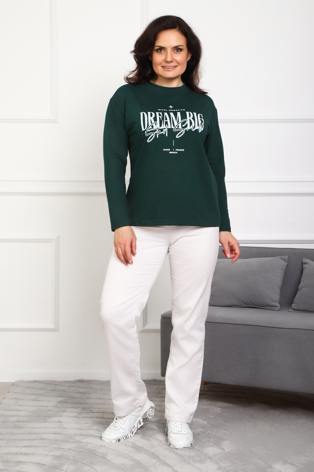 (Лонгслив женский DREAM BIG) Женский лонгслив свободного кроя выполнен из натуральной кулирки, состоящей из качественного хлопка (95%) и эластичной лайкры (5%). Прямой удлинённый силуэт модели подчёркивает комфорт и свободу движений, а мягкие длинные рукава обеспечивают дополнительное тепло и уют. Округлый вырез горловины дополняет лаконичный дизайн изделия. Центральный элемент образа — оригинальный принт на груди с мотивирующей надписью "Dream Big Start Small", вдохновляющий мечтать масштабно и начинать уверенно даже с малого шага. Этот универсальный лонгслив станет отличным выбором для повседневного стиля, сочетаясь как с джинсами, так и спортивными брюками.