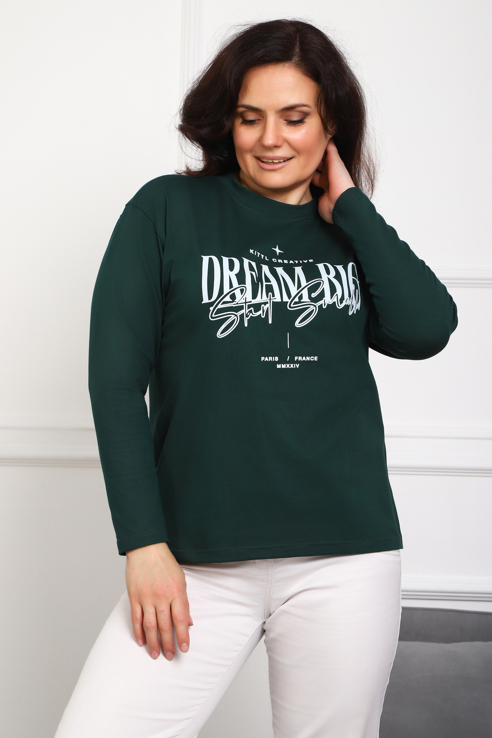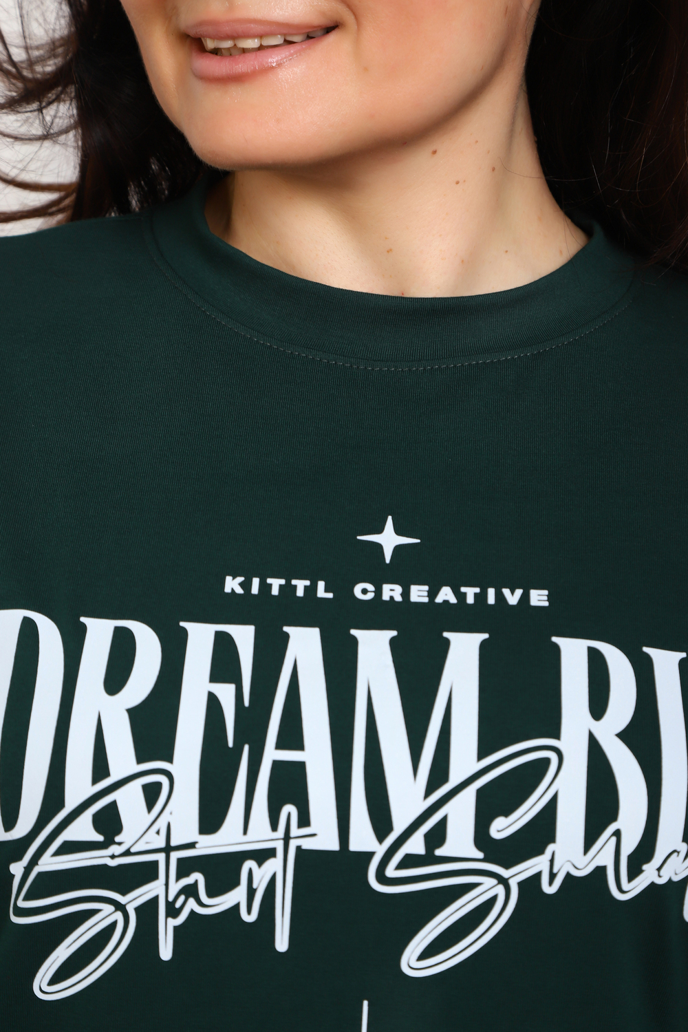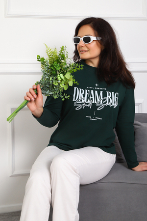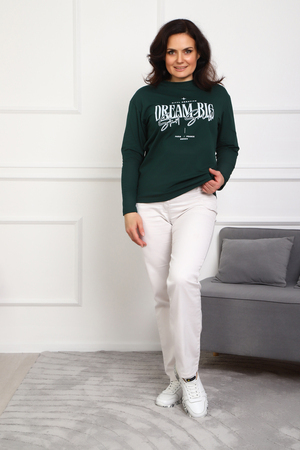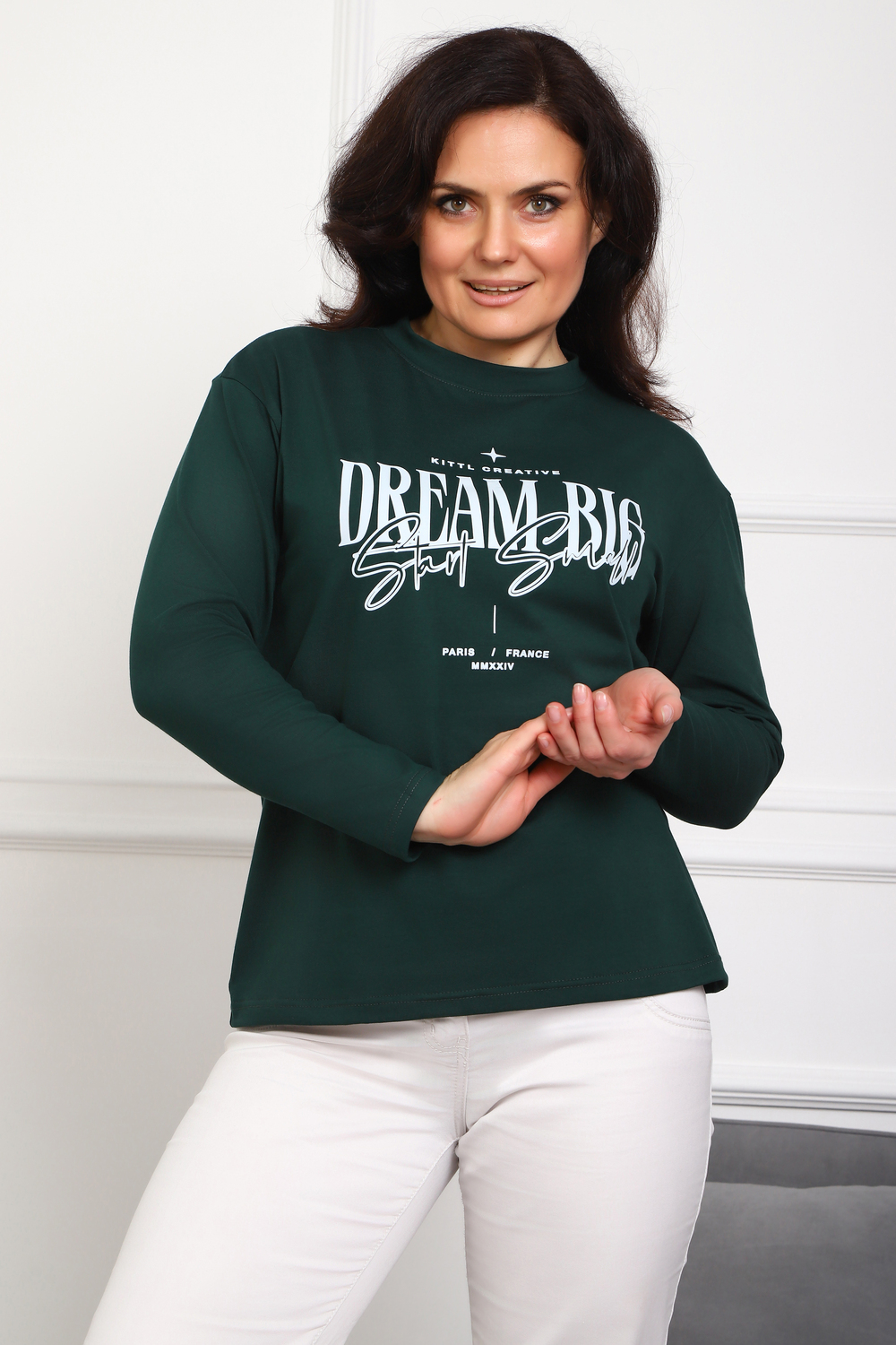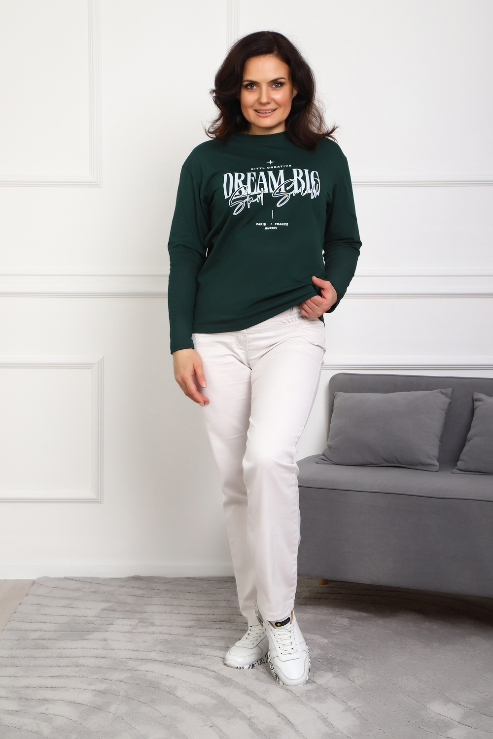 (Лонгслив женский DREAM BIG) Женский лонгслив свободного кроя выполнен из натуральной кулирки, состоящей из качественного хлопка (95%) и эластичной лайкры (5%). Прямой удлинённый силуэт модели подчёркивает комфорт и свободу движений, а мягкие длинные рукава обеспечивают дополнительное тепло и уют. Округлый вырез горловины дополняет лаконичный дизайн изделия. Центральный элемент образа — оригинальный принт на груди с мотивирующей надписью "Dream Big Start Small", вдохновляющий мечтать масштабно и начинать уверенно даже с малого шага. Этот универсальный лонгслив станет отличным выбором для повседневного стиля, сочетаясь как с джинсами, так и спортивными брюками.