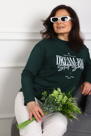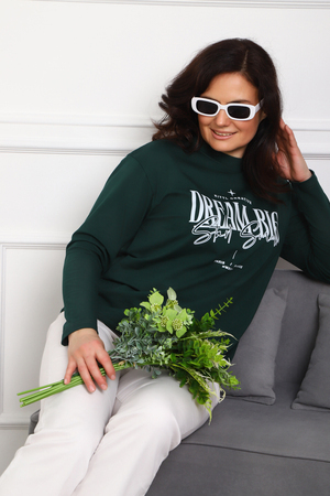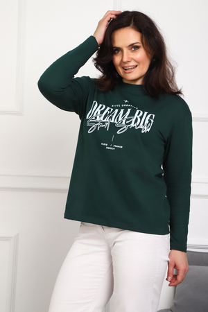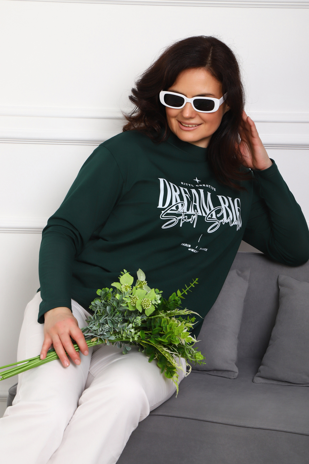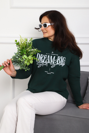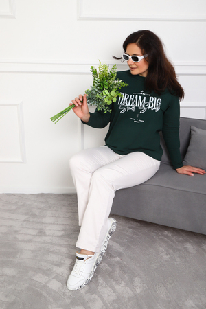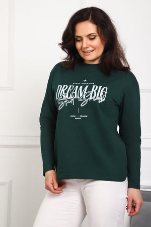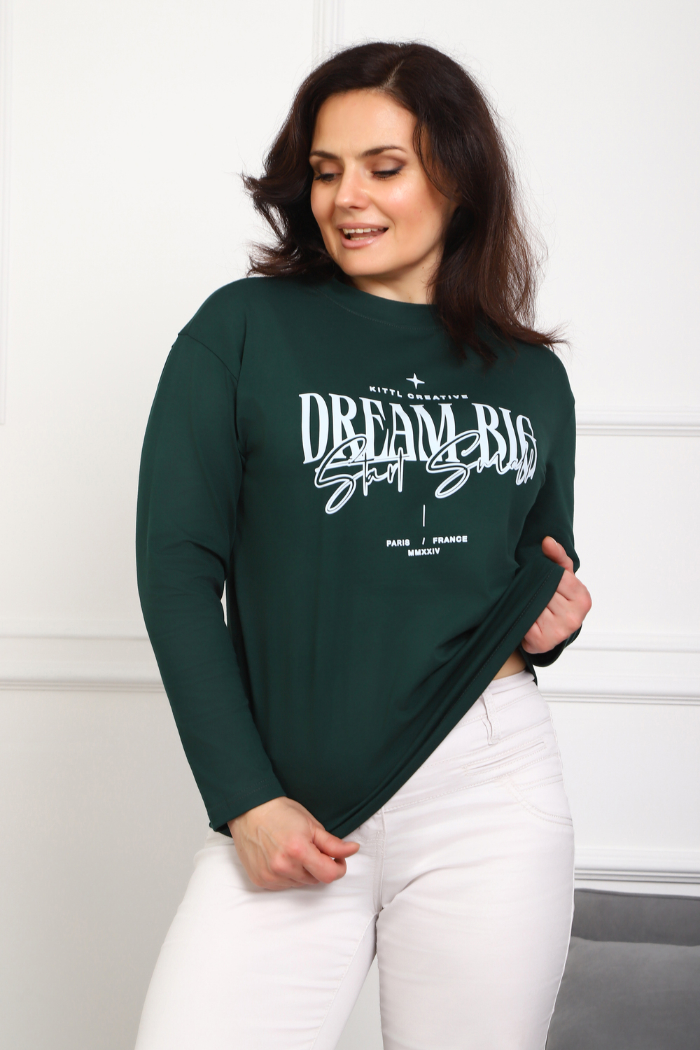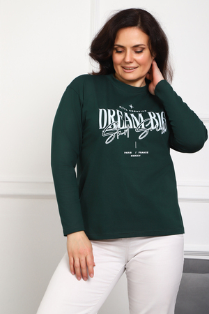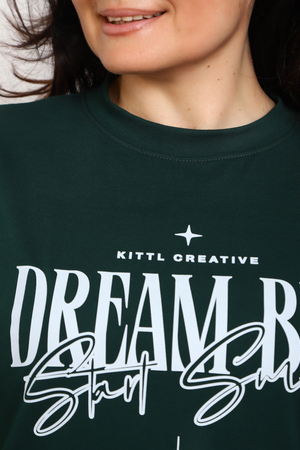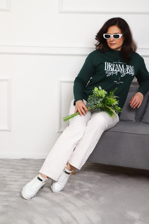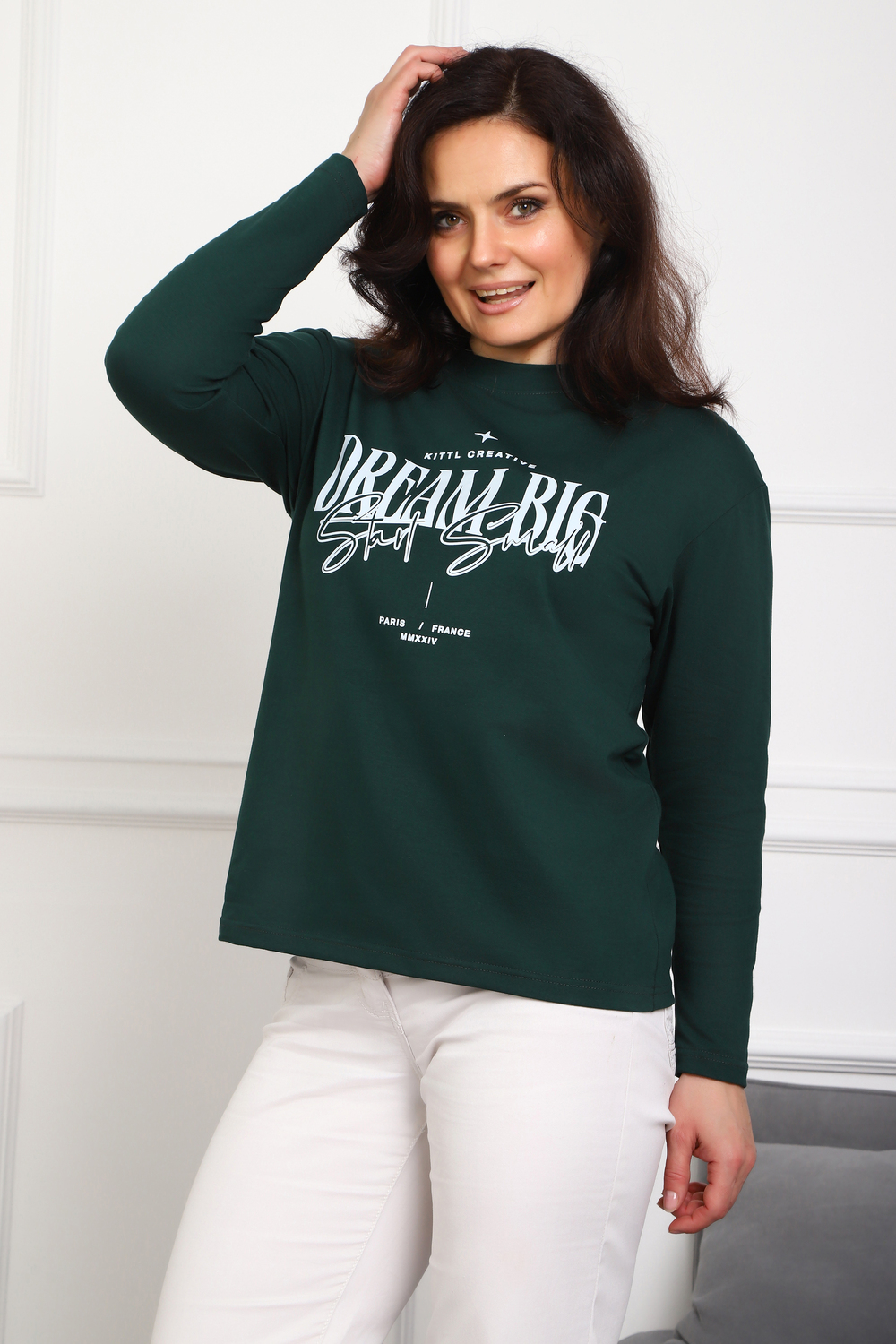 (Лонгслив женский DREAM BIG) Женский лонгслив свободного кроя выполнен из натуральной кулирки, состоящей из качественного хлопка (95%) и эластичной лайкры (5%). Прямой удлинённый силуэт модели подчёркивает комфорт и свободу движений, а мягкие длинные рукава обеспечивают дополнительное тепло и уют. Округлый вырез горловины дополняет лаконичный дизайн изделия. Центральный элемент образа — оригинальный принт на груди с мотивирующей надписью "Dream Big Start Small", вдохновляющий мечтать масштабно и начинать уверенно даже с малого шага. Этот универсальный лонгслив станет отличным выбором для повседневного стиля, сочетаясь как с джинсами, так и спортивными брюками.