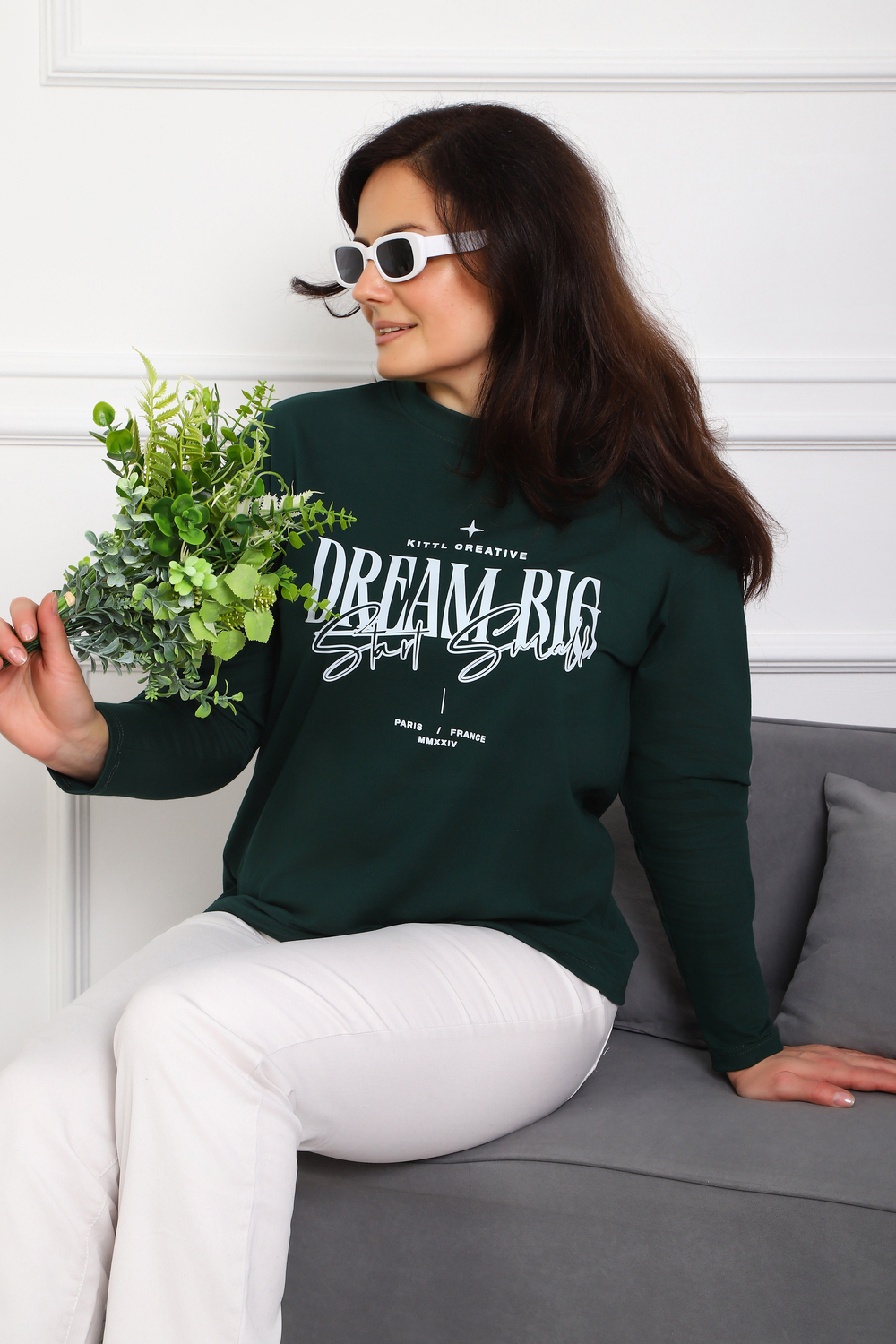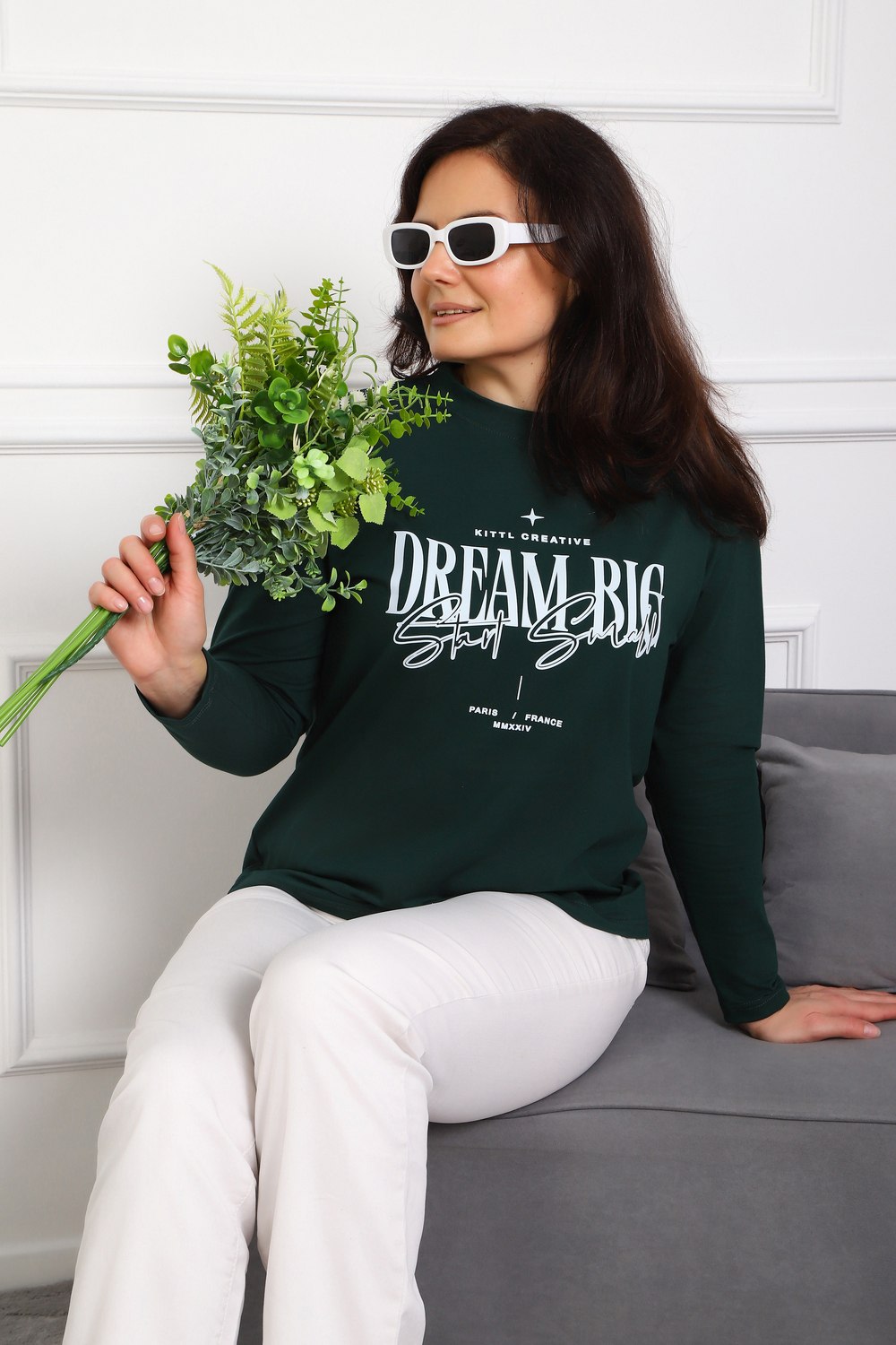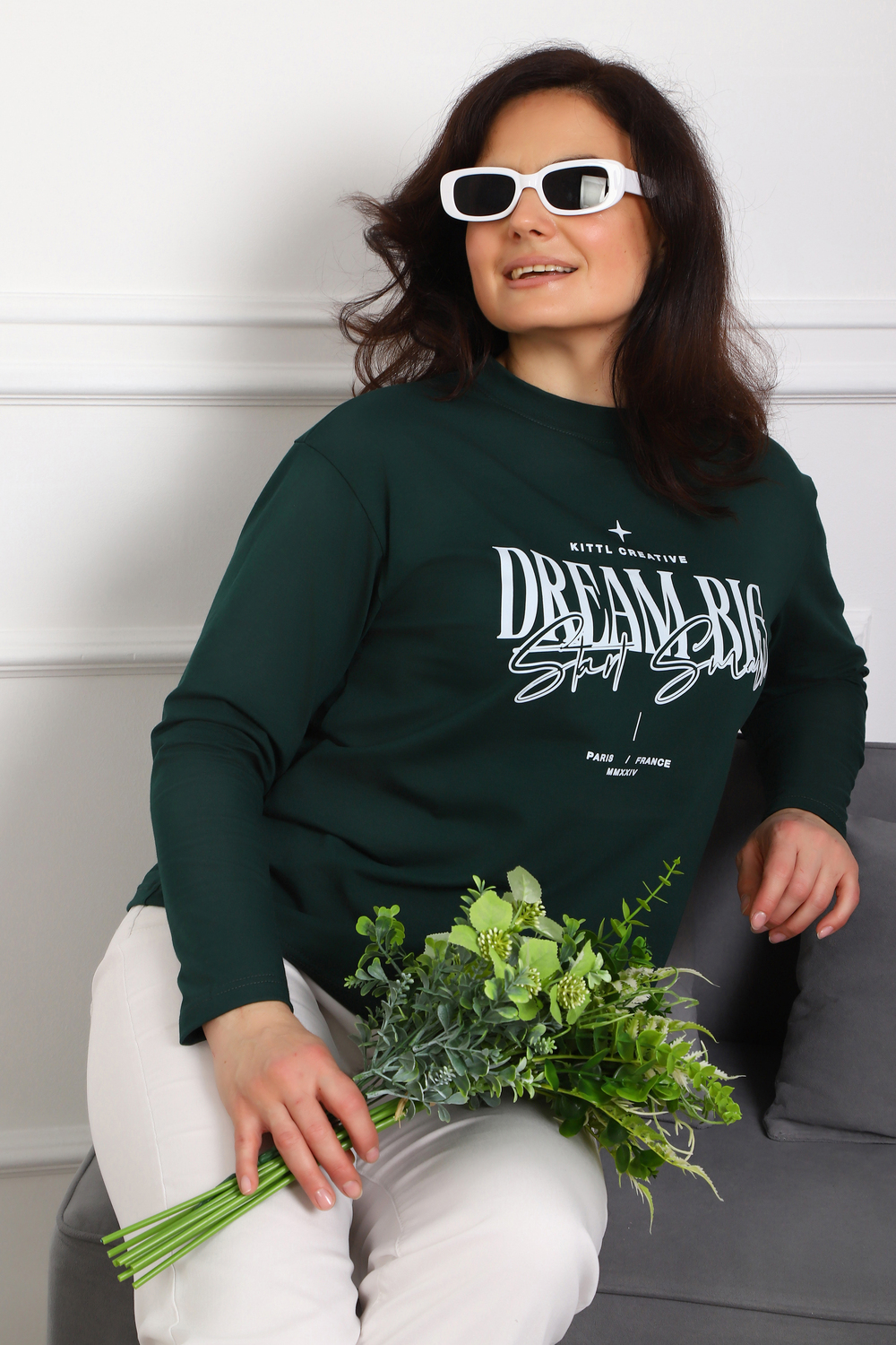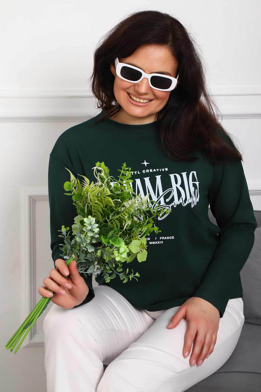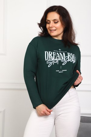 (Лонгслив женский DREAM BIG) Женский лонгслив свободного кроя выполнен из натуральной кулирки, состоящей из качественного хлопка (95%) и эластичной лайкры (5%). Прямой удлинённый силуэт модели подчёркивает комфорт и свободу движений, а мягкие длинные рукава обеспечивают дополнительное тепло и уют. Округлый вырез горловины дополняет лаконичный дизайн изделия. Центральный элемент образа — оригинальный принт на груди с мотивирующей надписью "Dream Big Start Small", вдохновляющий мечтать масштабно и начинать уверенно даже с малого шага. Этот универсальный лонгслив станет отличным выбором для повседневного стиля, сочетаясь как с джинсами, так и спортивными брюками.