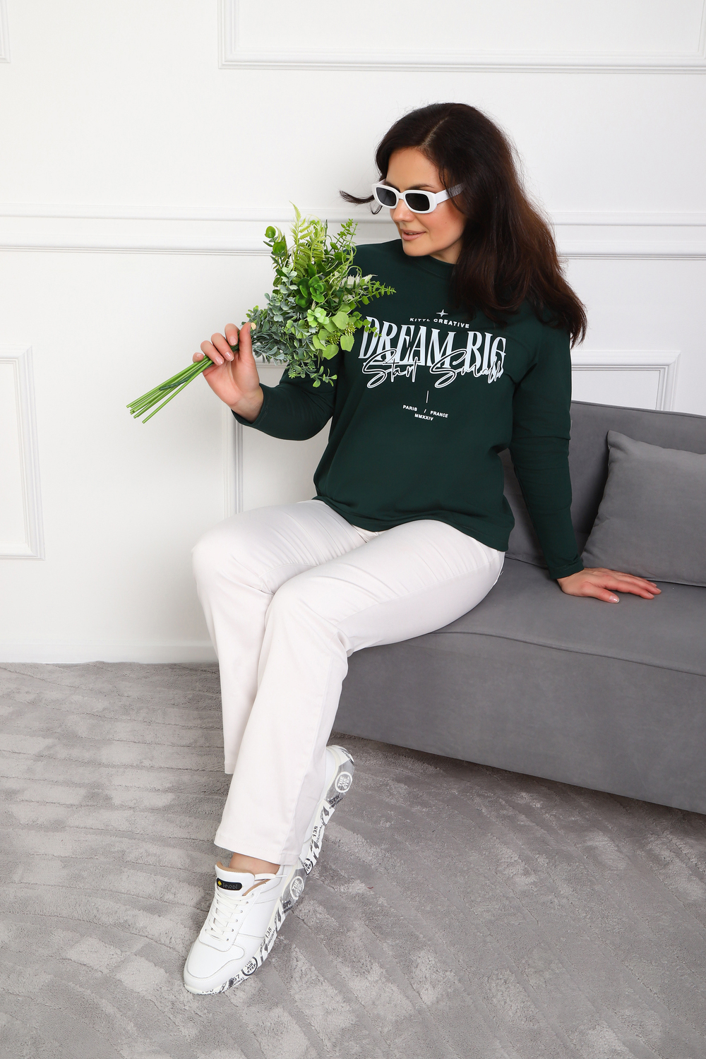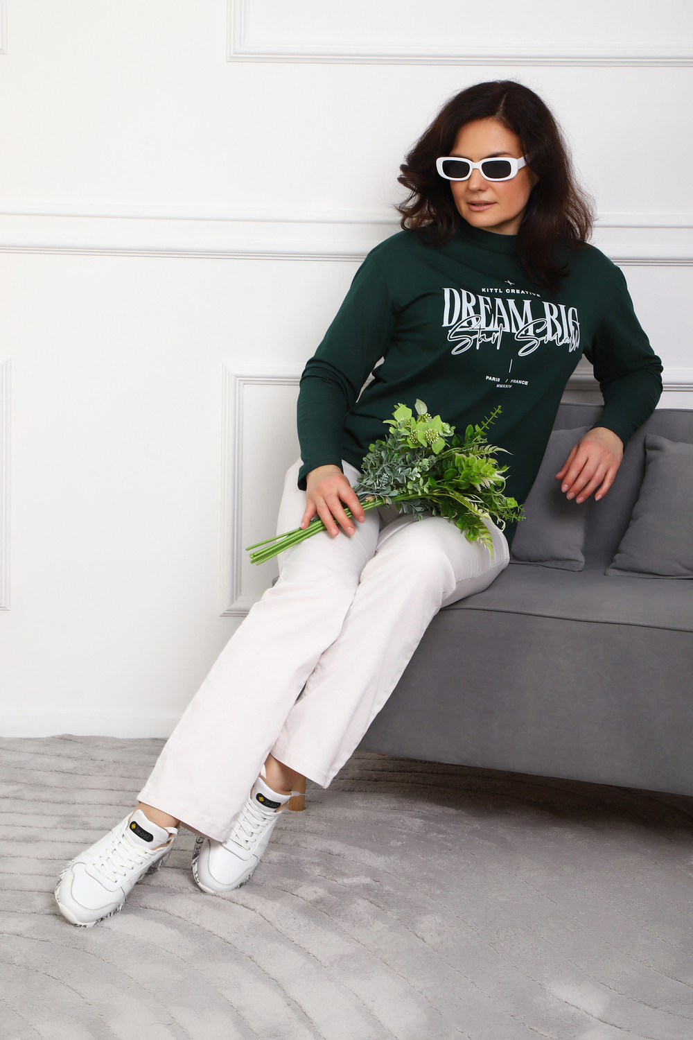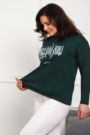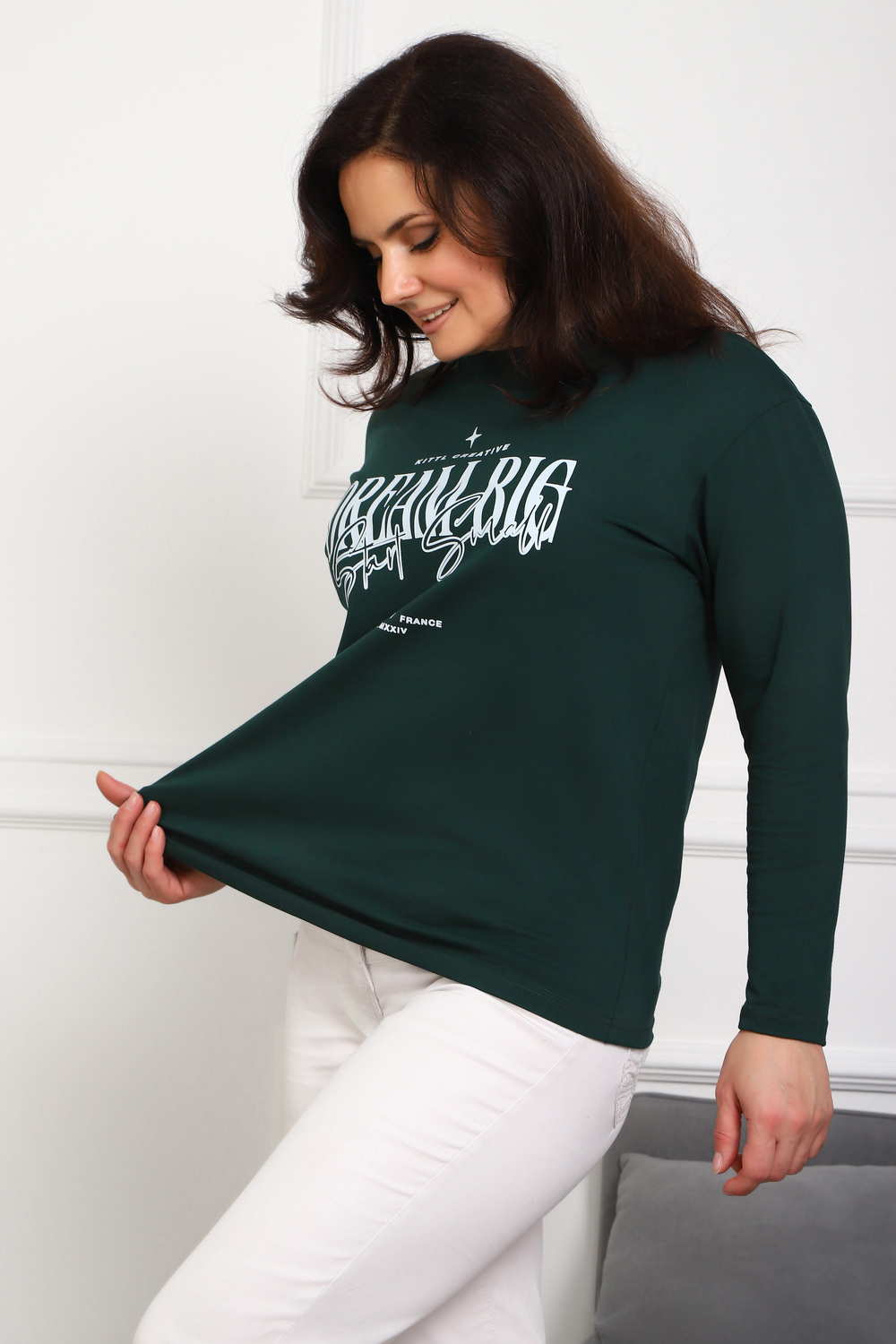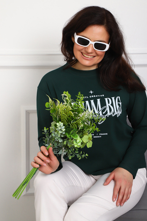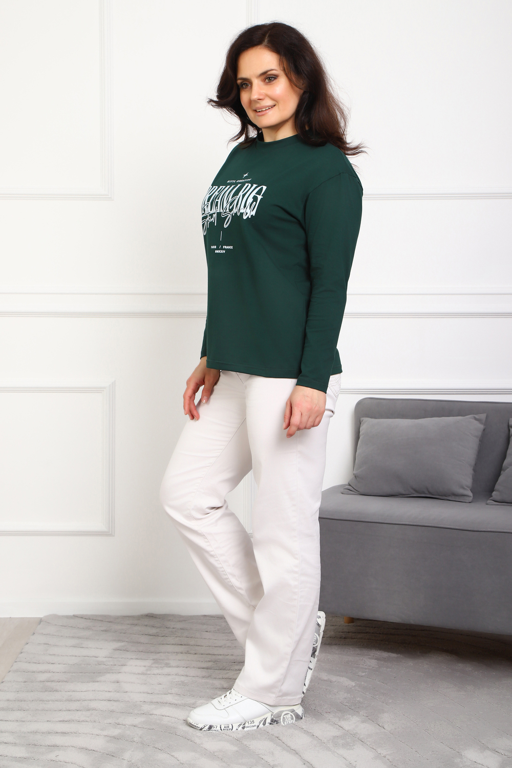 (Лонгслив женский DREAM BIG) Женский лонгслив свободного кроя выполнен из натуральной кулирки, состоящей из качественного хлопка (95%) и эластичной лайкры (5%). Прямой удлинённый силуэт модели подчёркивает комфорт и свободу движений, а мягкие длинные рукава обеспечивают дополнительное тепло и уют. Округлый вырез горловины дополняет лаконичный дизайн изделия. Центральный элемент образа — оригинальный принт на груди с мотивирующей надписью "Dream Big Start Small", вдохновляющий мечтать масштабно и начинать уверенно даже с малого шага. Этот универсальный лонгслив станет отличным выбором для повседневного стиля, сочетаясь как с джинсами, так и спортивными брюками.