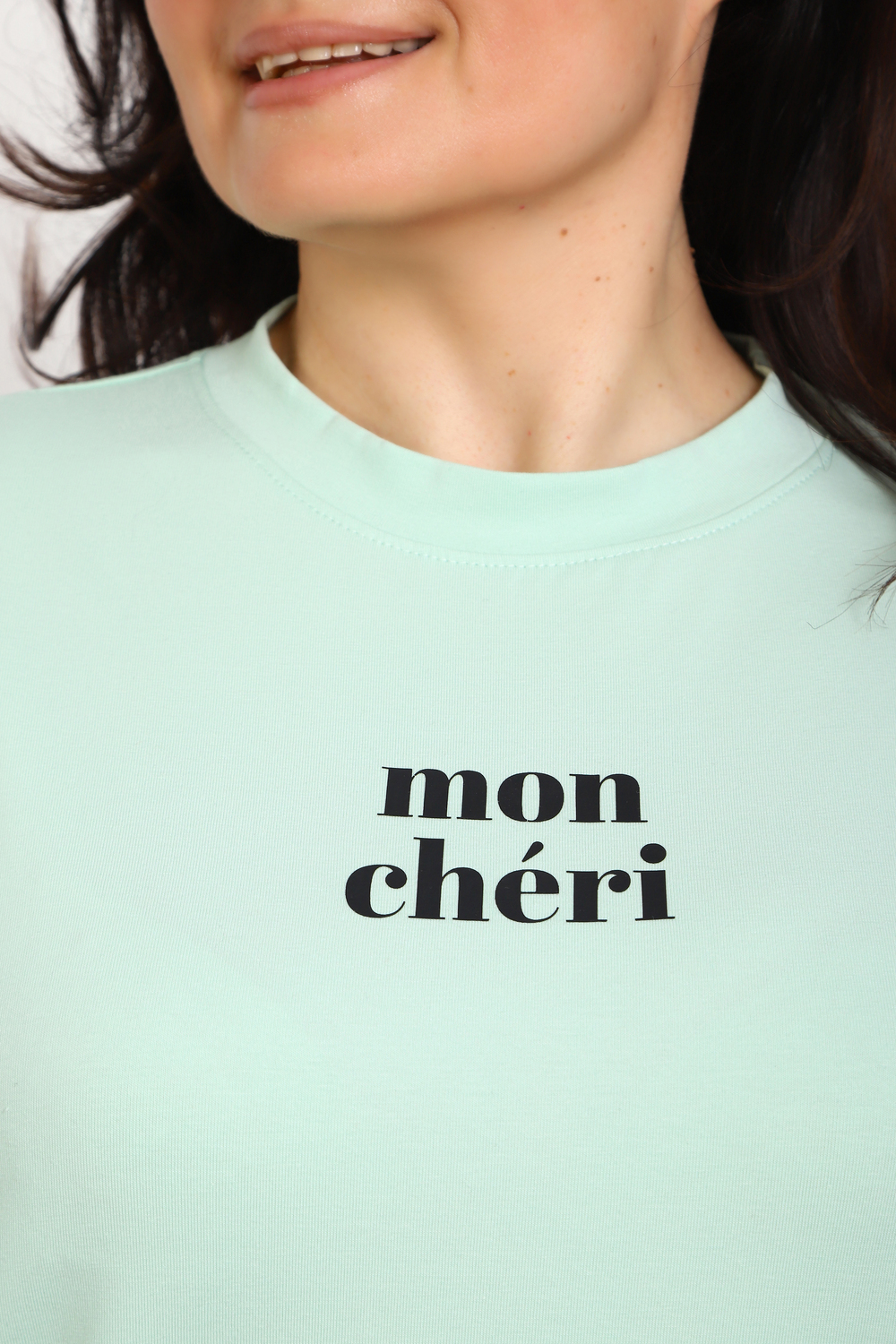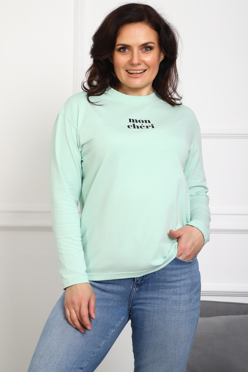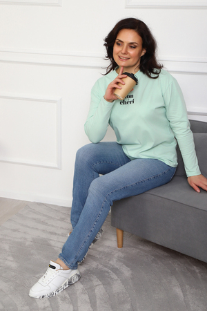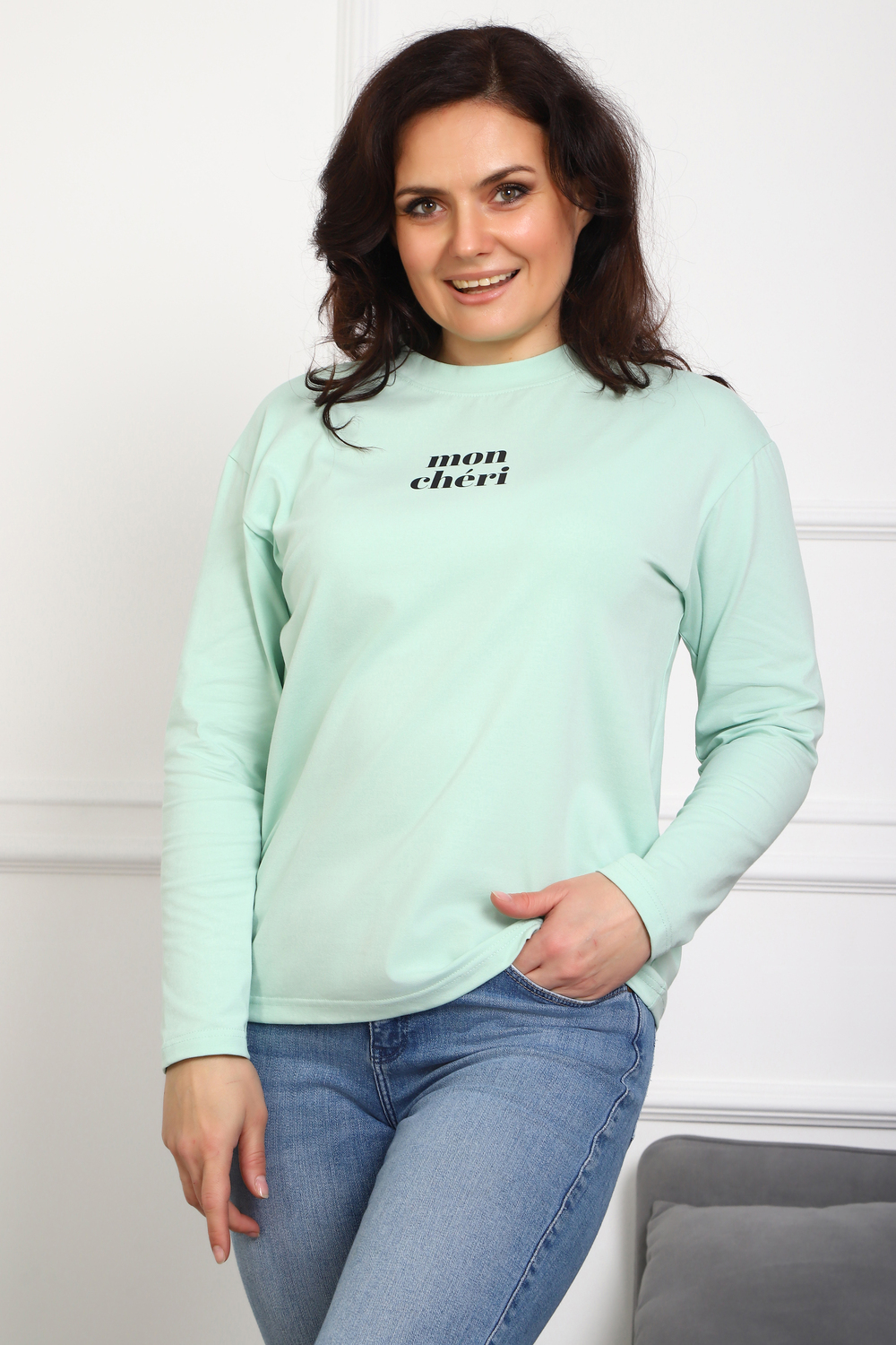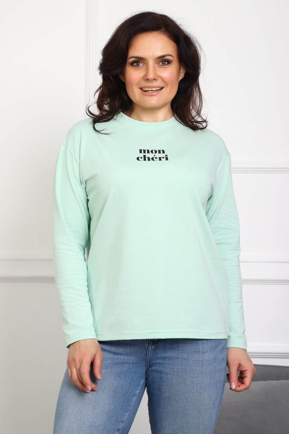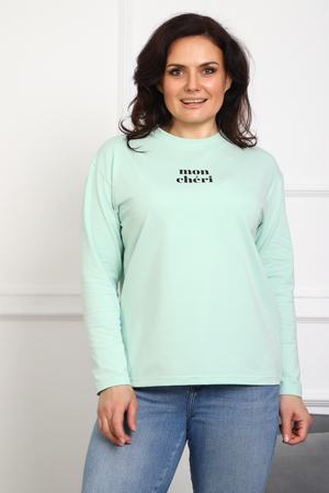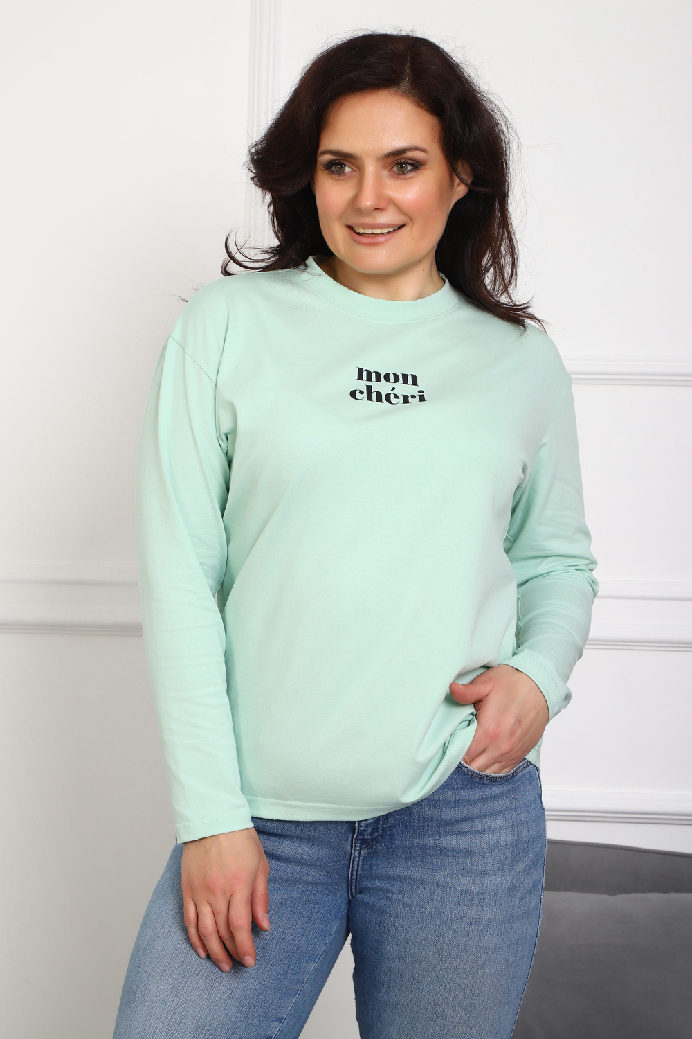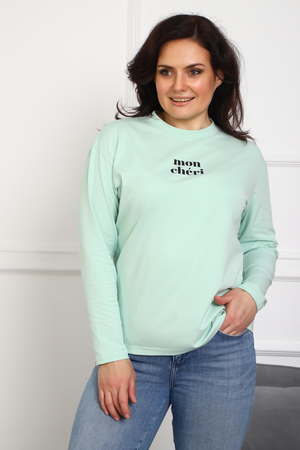 Лонгслив женский MON CHERI Женский лонгслив свободой посадки изготовлен из мягкой и приятной к телу кулирки, которая состоит из высококачественного хлопка (95%) и небольшого процента лайкры (5%), обеспечивающей лёгкую эластичность и долговечность изделия. Свободный прямой и удлиненный крой подчеркивает удобство и расслабленный стиль, позволяя носить его ежедневно. Длинные рукава и круглая горловина создают гармоничный внешний вид, подчеркивая женственность и утончённость. Элегантный минималистичный принт на груди с романтичным французским выражением "Mon Cheri" привносит особую атмосферу романтики и легкости в образ. Важным преимуществом является сдвоенный размер, позволяющий комфортно подобрать модель каждой женщине, независимо от особенностей фигуры. Данный лонгслив станет идеальным выбором для тех, кто ценит сочетание комфорта, удобства и современного дизайна.