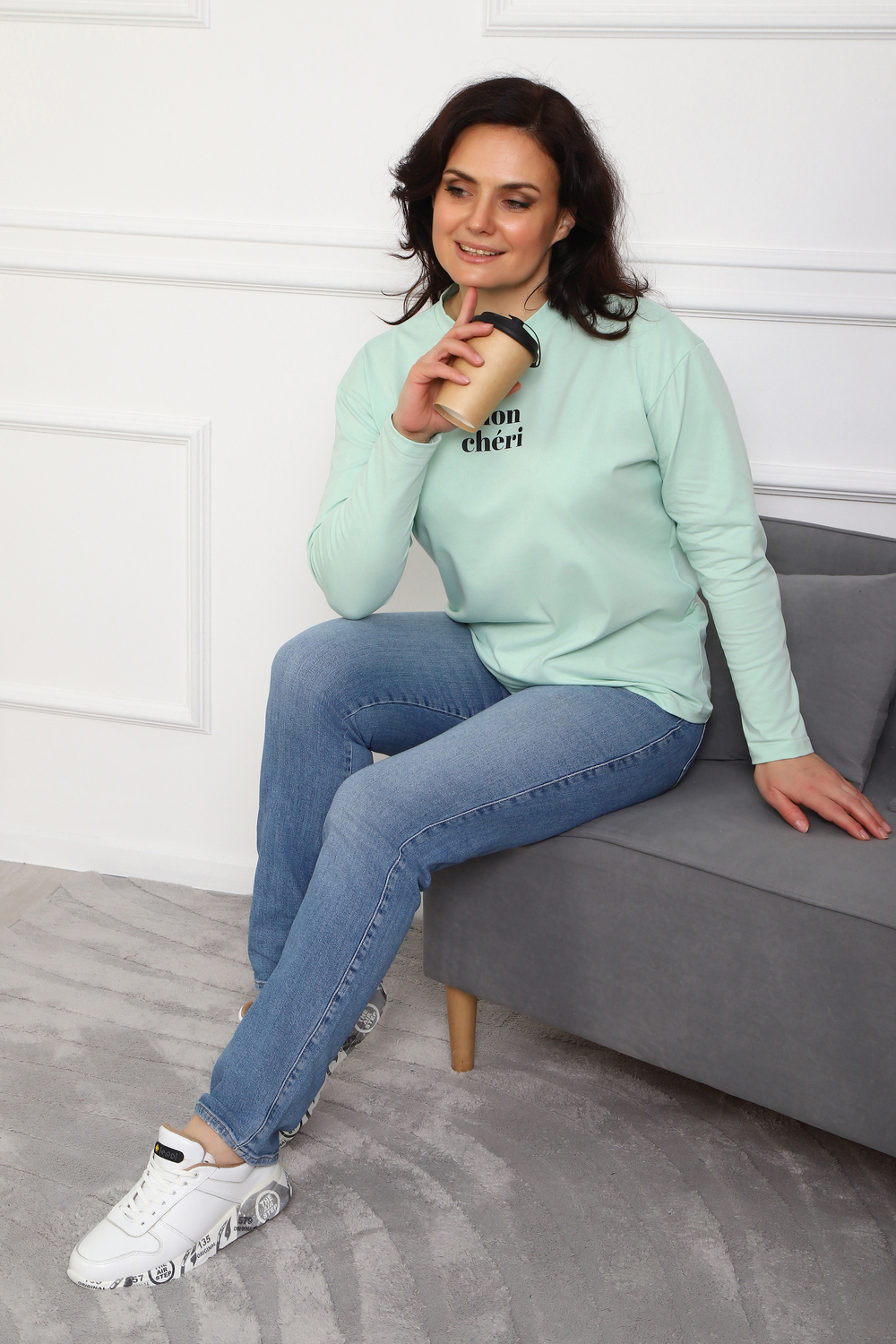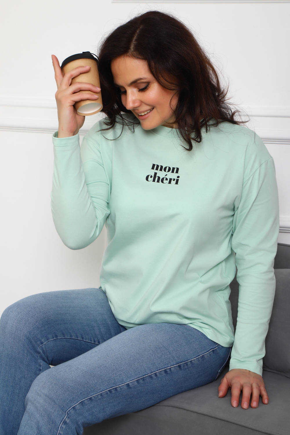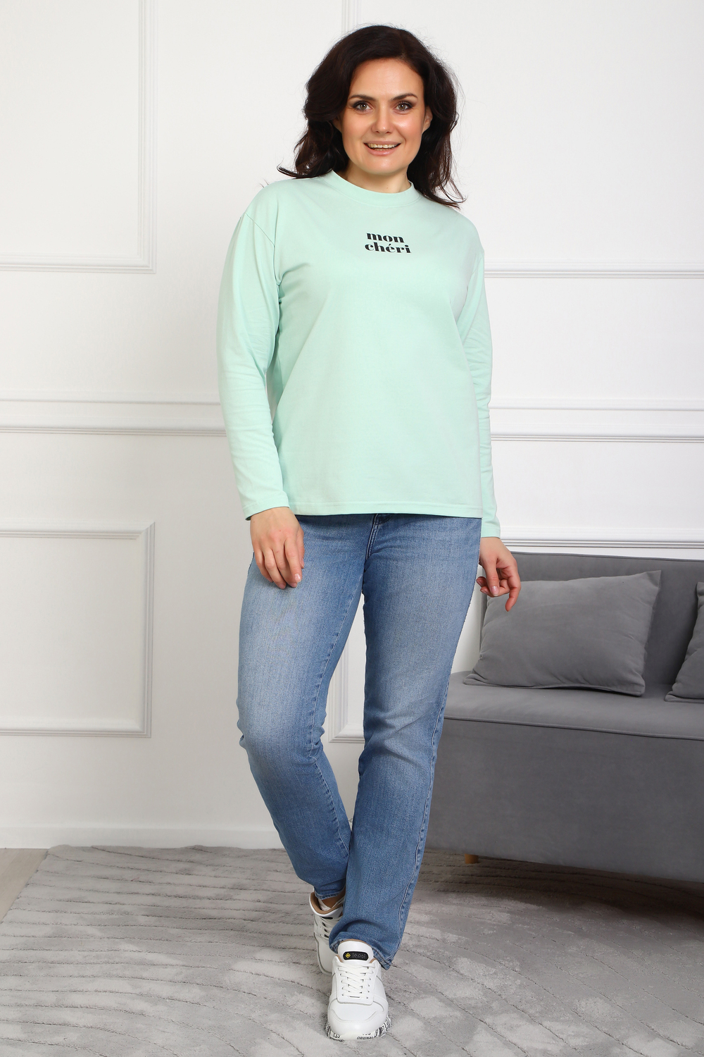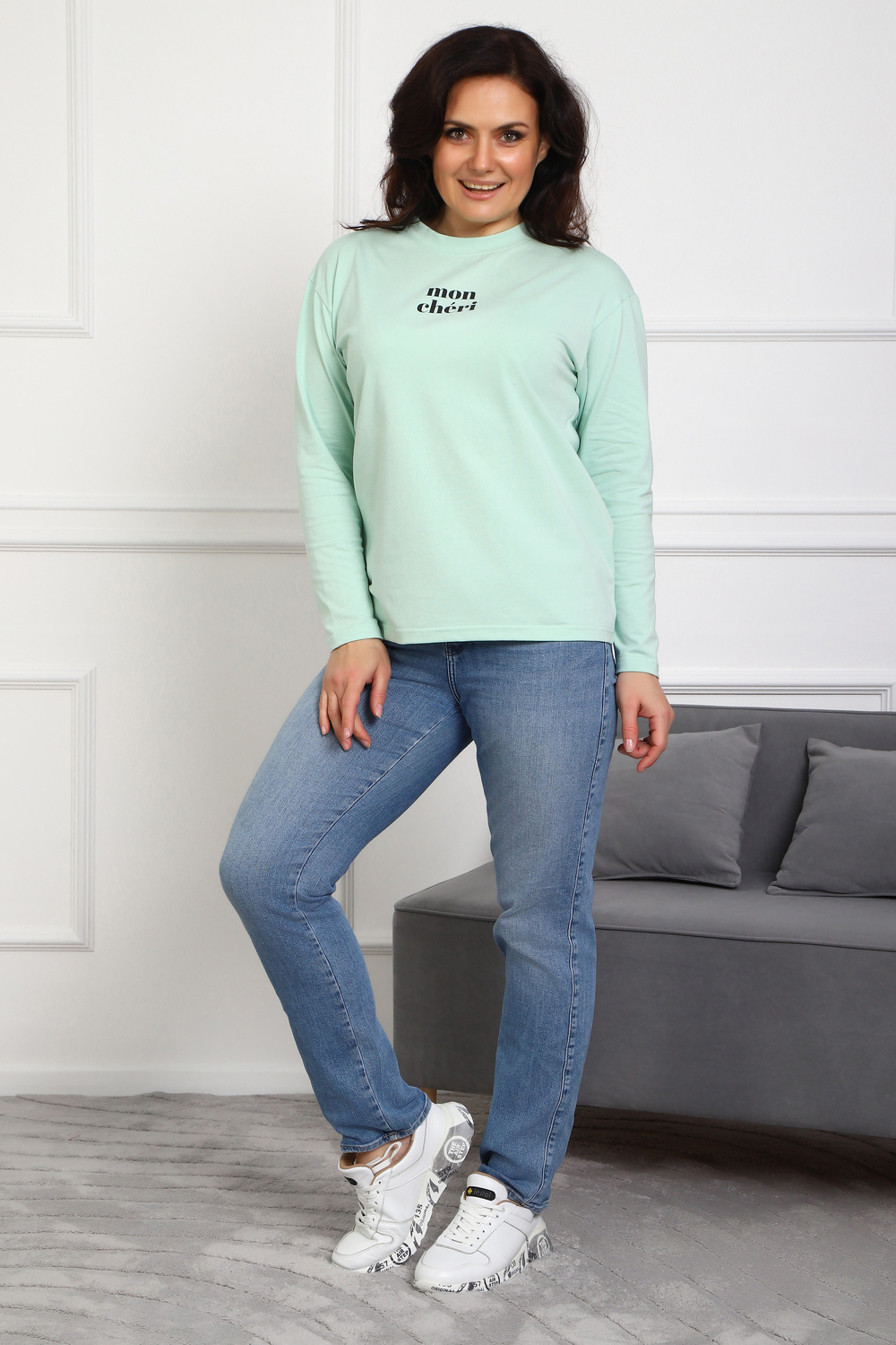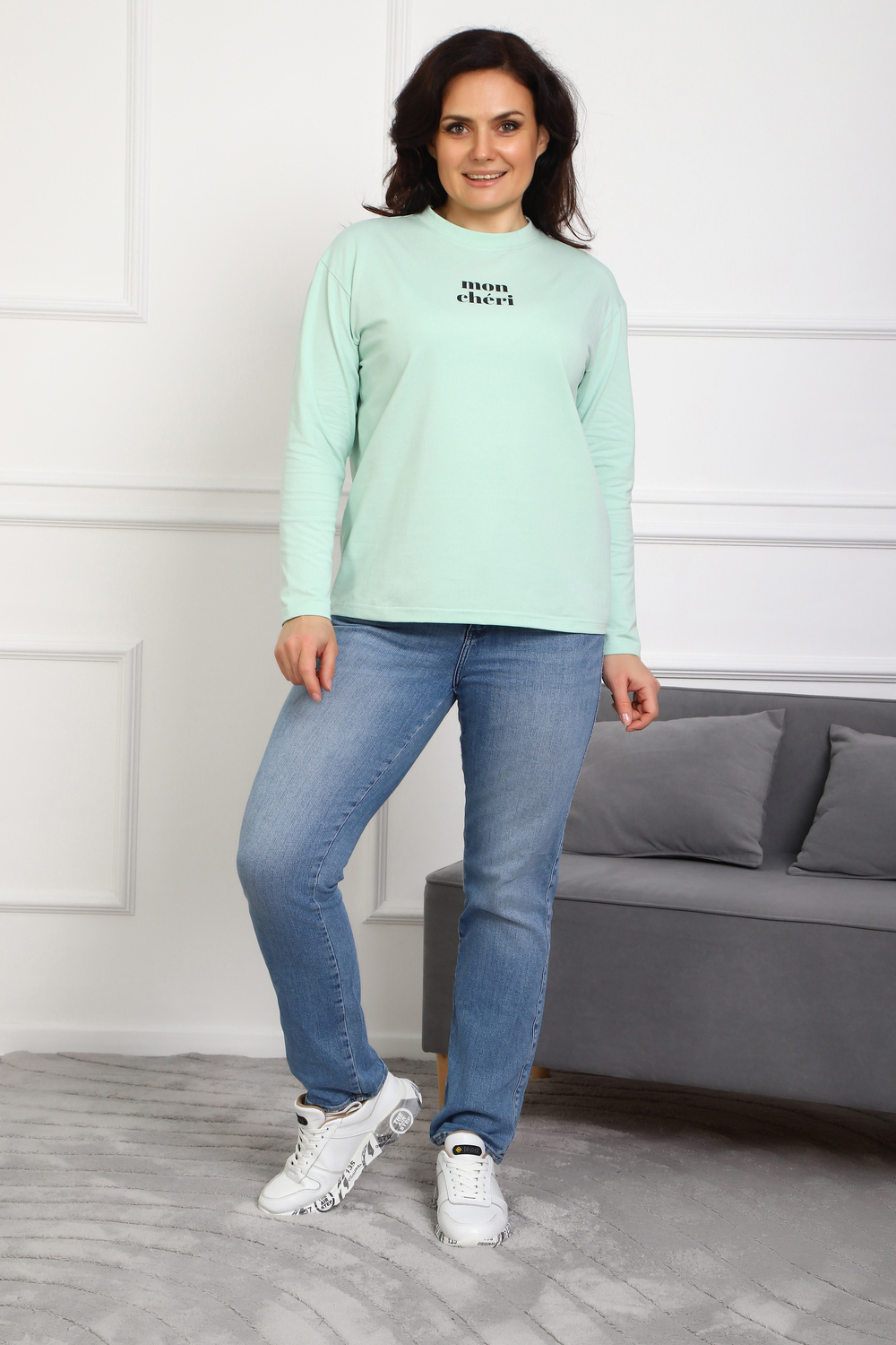 Лонгслив женский MON CHERI Женский лонгслив свободой посадки изготовлен из мягкой и приятной к телу кулирки, которая состоит из высококачественного хлопка (95%) и небольшого процента лайкры (5%), обеспечивающей лёгкую эластичность и долговечность изделия. Свободный прямой и удлиненный крой подчеркивает удобство и расслабленный стиль, позволяя носить его ежедневно. Длинные рукава и круглая горловина создают гармоничный внешний вид, подчеркивая женственность и утончённость. Элегантный минималистичный принт на груди с романтичным французским выражением "Mon Cheri" привносит особую атмосферу романтики и легкости в образ. Важным преимуществом является сдвоенный размер, позволяющий комфортно подобрать модель каждой женщине, независимо от особенностей фигуры. Данный лонгслив станет идеальным выбором для тех, кто ценит сочетание комфорта, удобства и современного дизайна.