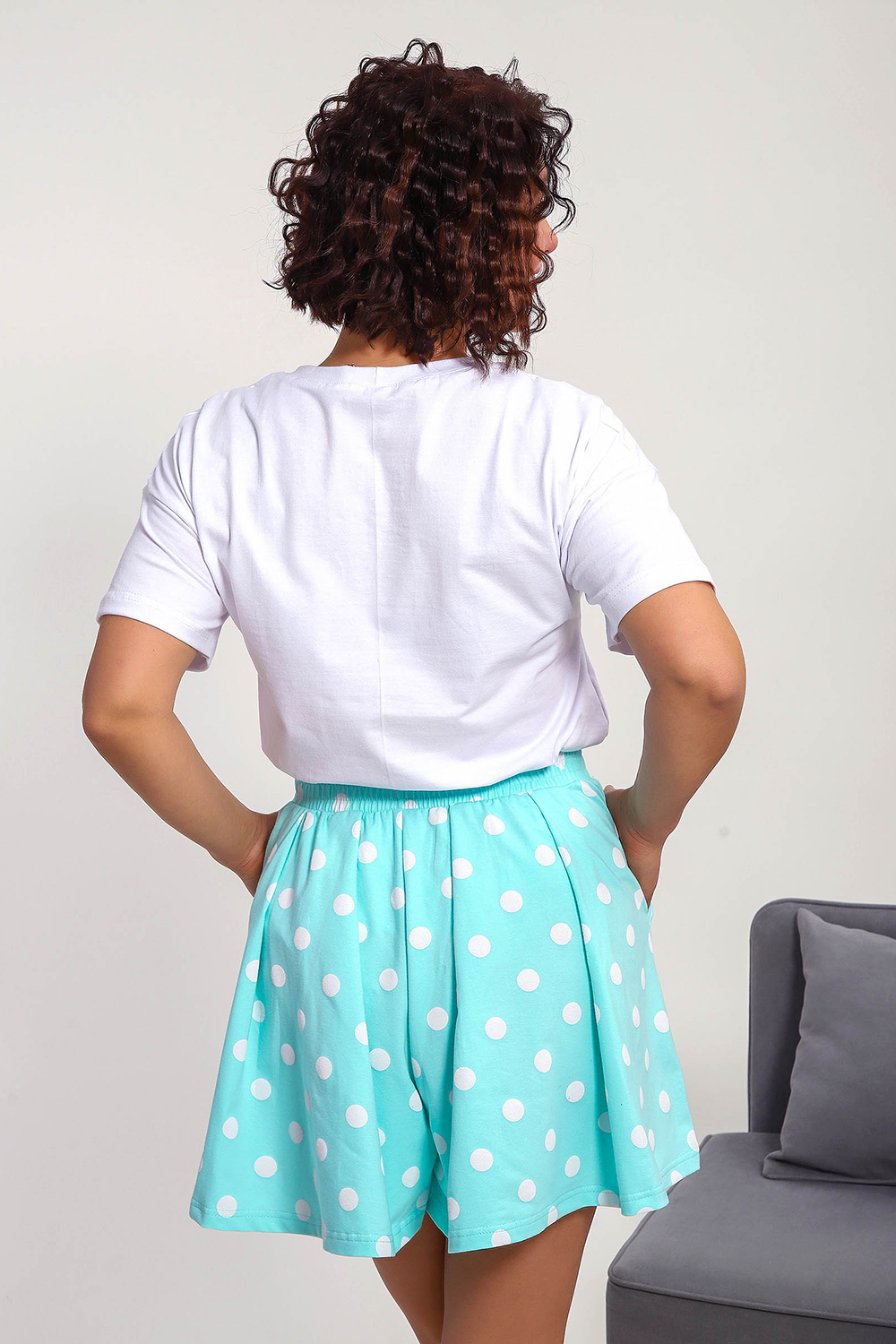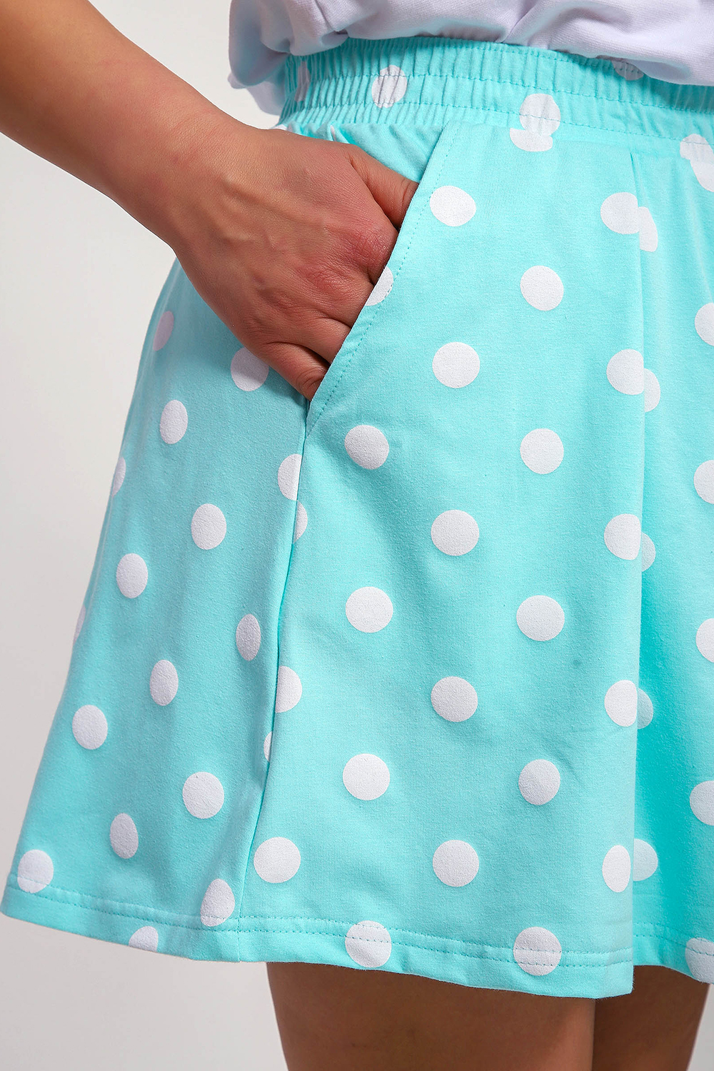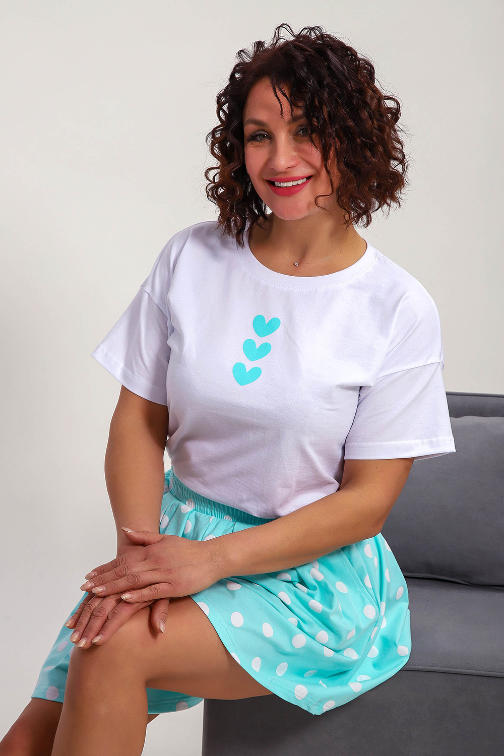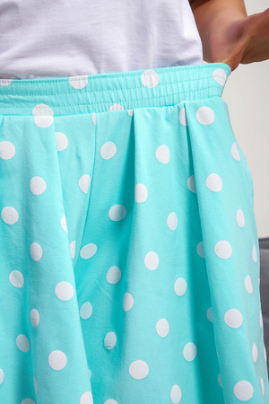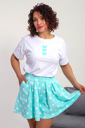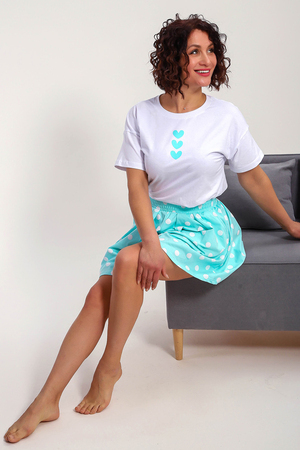 Пижама женская с шортами-юбка и футболкой со спущеным рукавом. Данная модель выполнена из эластичного трикотажного полотна кулирка ( хлопок 96%, лайкра 4%). На футболке присутствует принт. Шорты с поясом и карманами. Складки на шортах придают воздушность и комфорт, свобода в движениях. Пижама порадует вас.