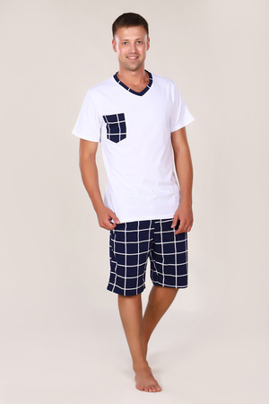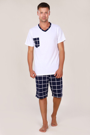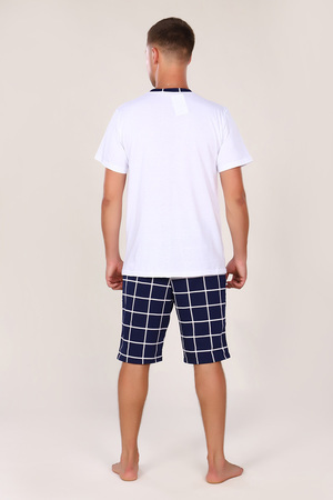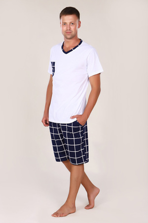 Этот мужской костюм представляет собой комплект для повседневного или домашнего использования, состоящий из белой футболки свободного кроя и темно-синих шорт в клетку.