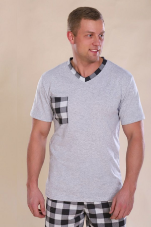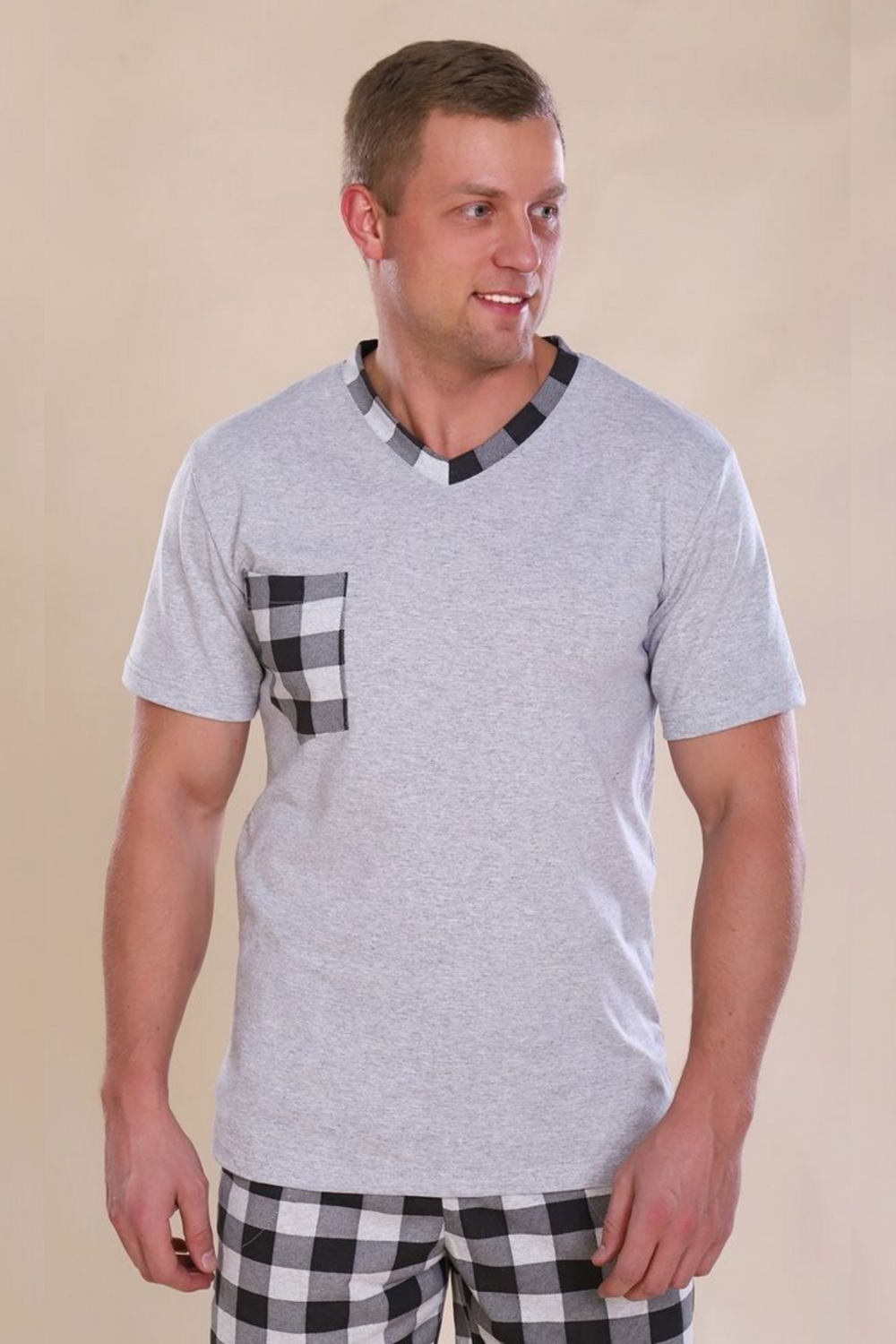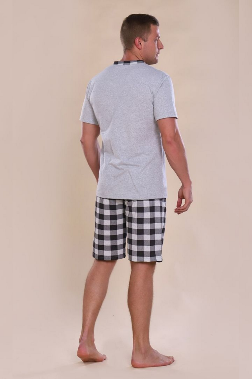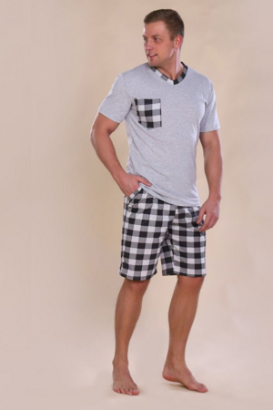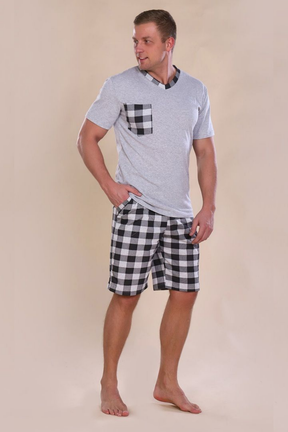 Этот мужской костюм представляет собой комплект для повседневного или домашнего использования, состоящий из белой футболки свободного кроя и темно-синих шорт в клетку.