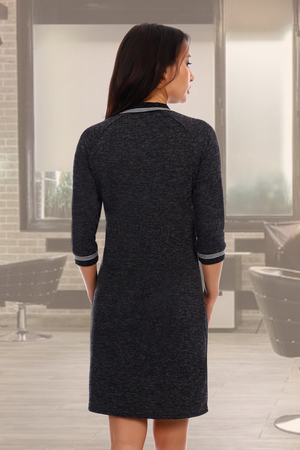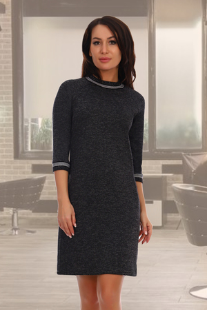 Модель выполнена из мягкого приятного телу трикотажа джерси. Платье приталенного силуэта с отделкой из люрекса на горловине и рукавах. Рукав реглан 3/4, длина модели чуть выше колена. Платье выглядит строго и лаконично, но в тоже врямя женственно и утонченно