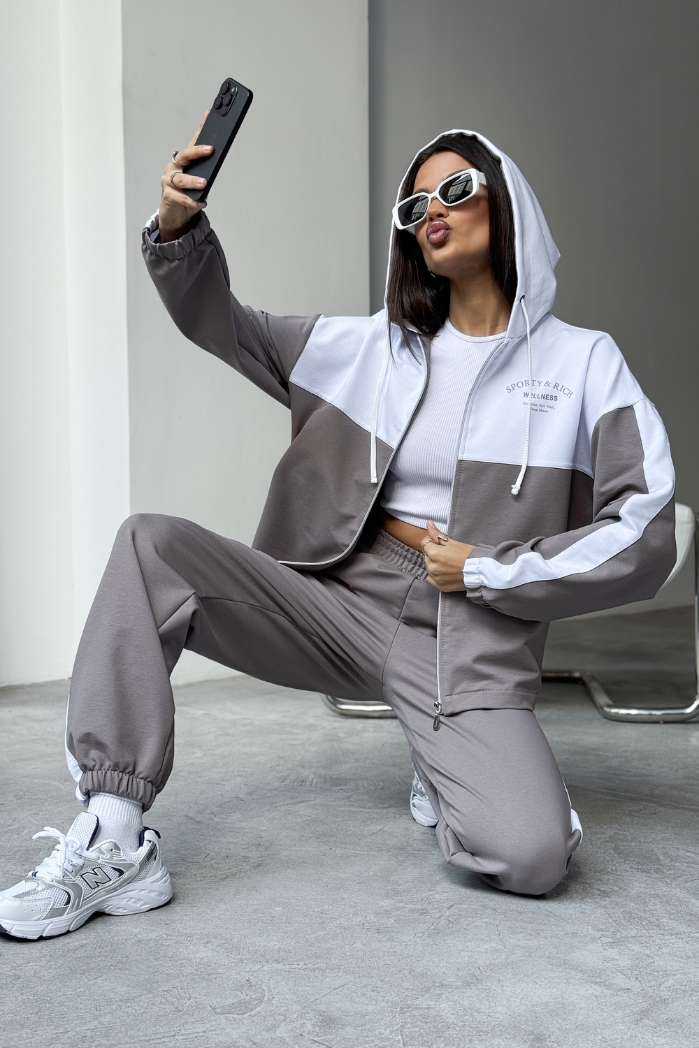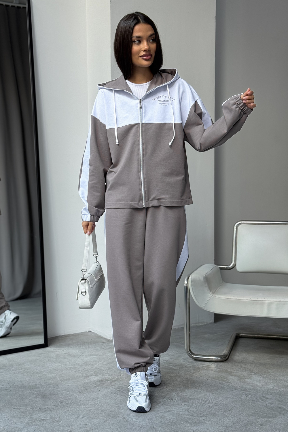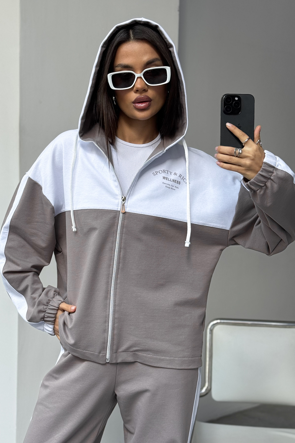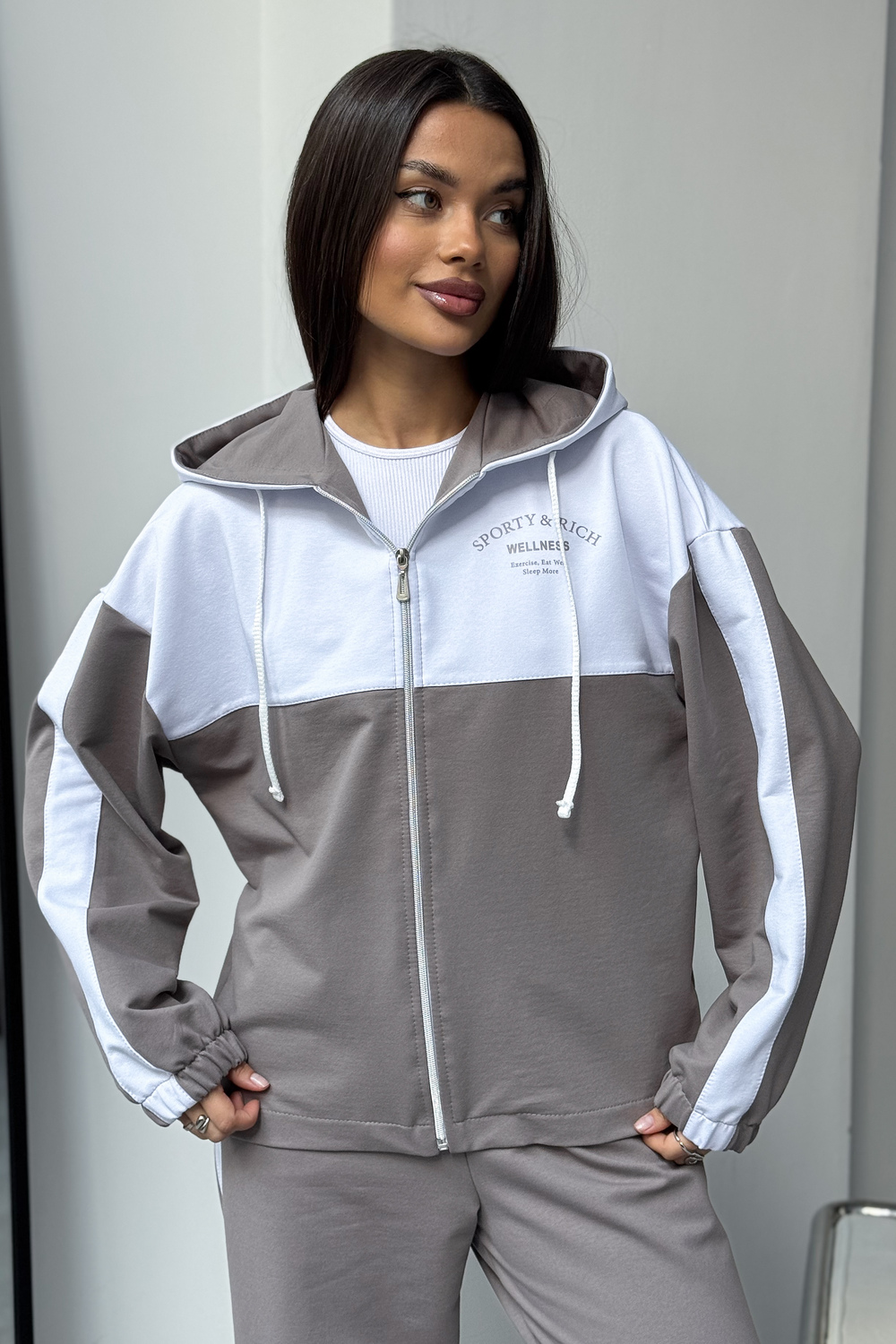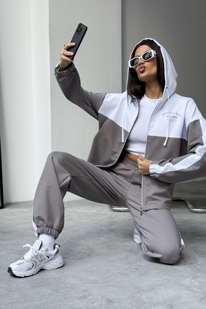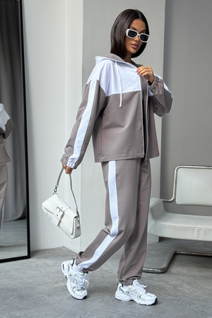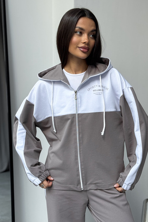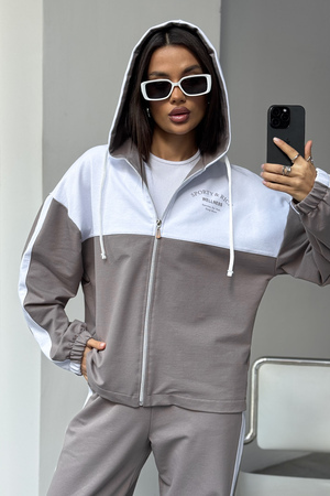 Женский спортивный костюм из трикотажа — идеальный выбор для тренировок, активных прогулок, дома или спортзала. Двойка состоит из худи на молнии с капюшоном и практичными брюками. Изделие выполнено из мягкого хлопка, что обеспечивает легкий и комфортный уход за вещью и удобство на каждый день.