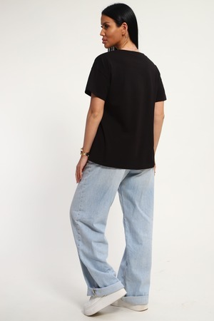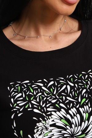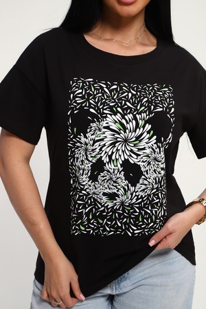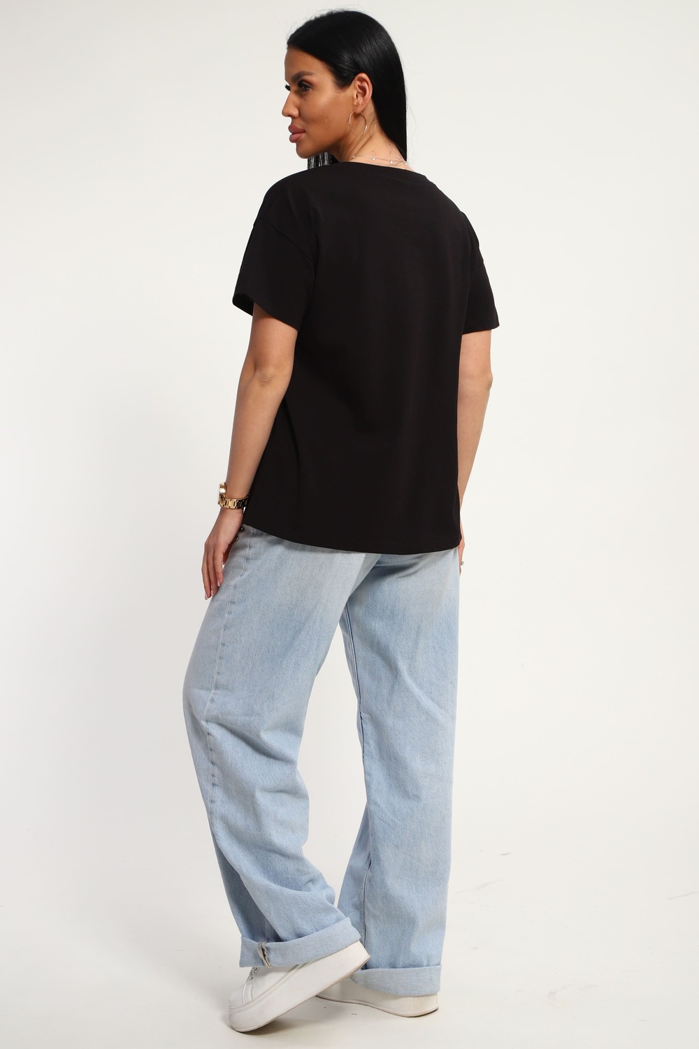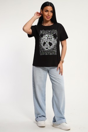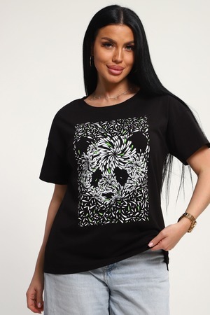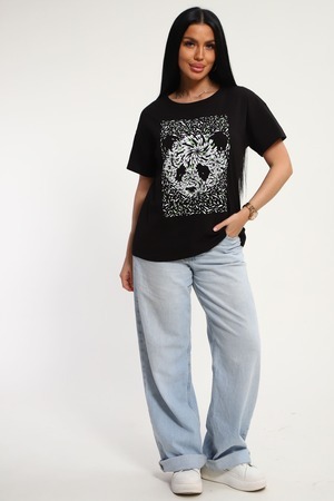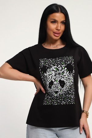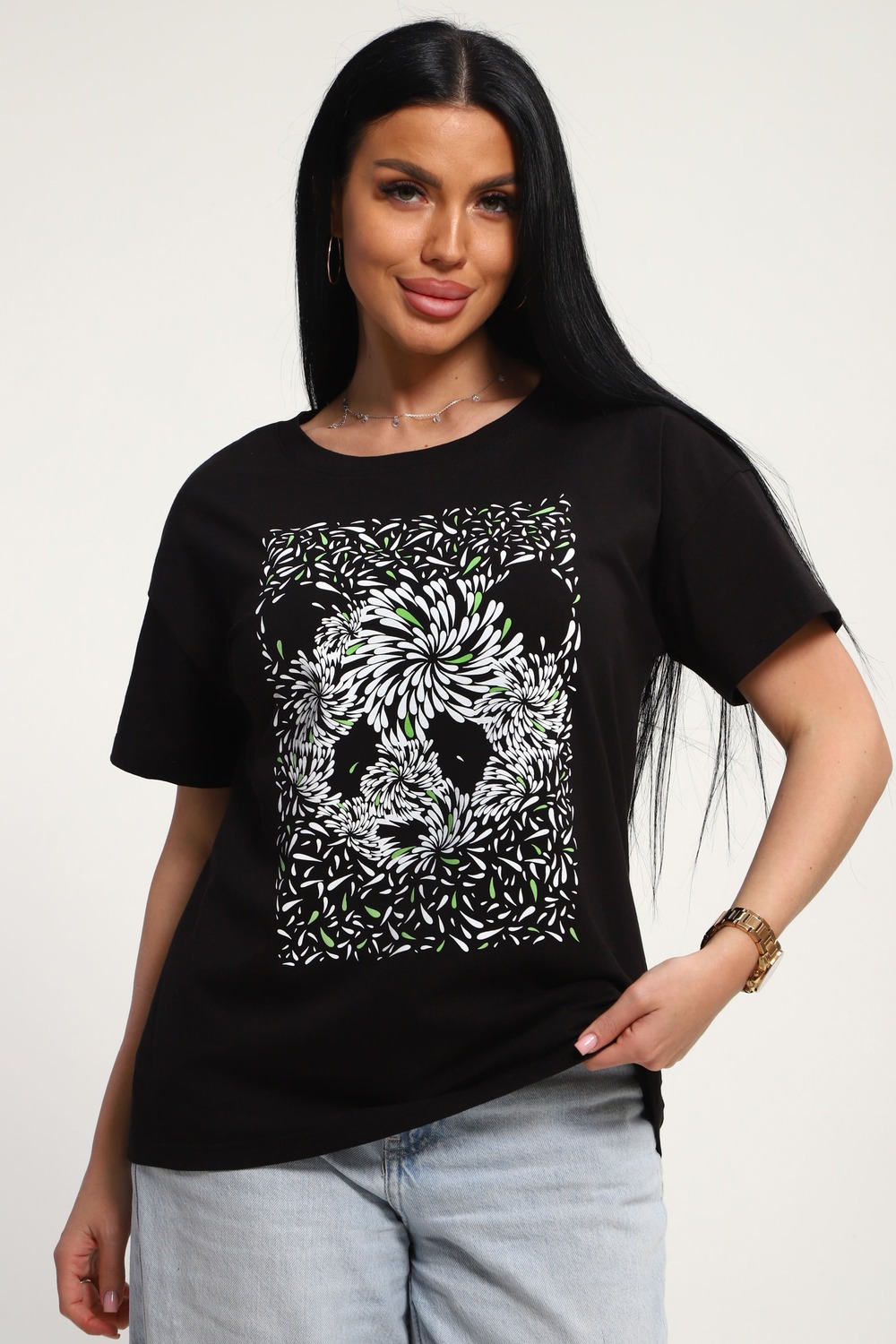 Футболка женская из гладкокрашенного трикотажа, хлопок 100%. Прямого силуэта, свободного облегания. горловина круглой формы. Рукав короткий. Низ изделия прямой. На полочке принт, шелкография.