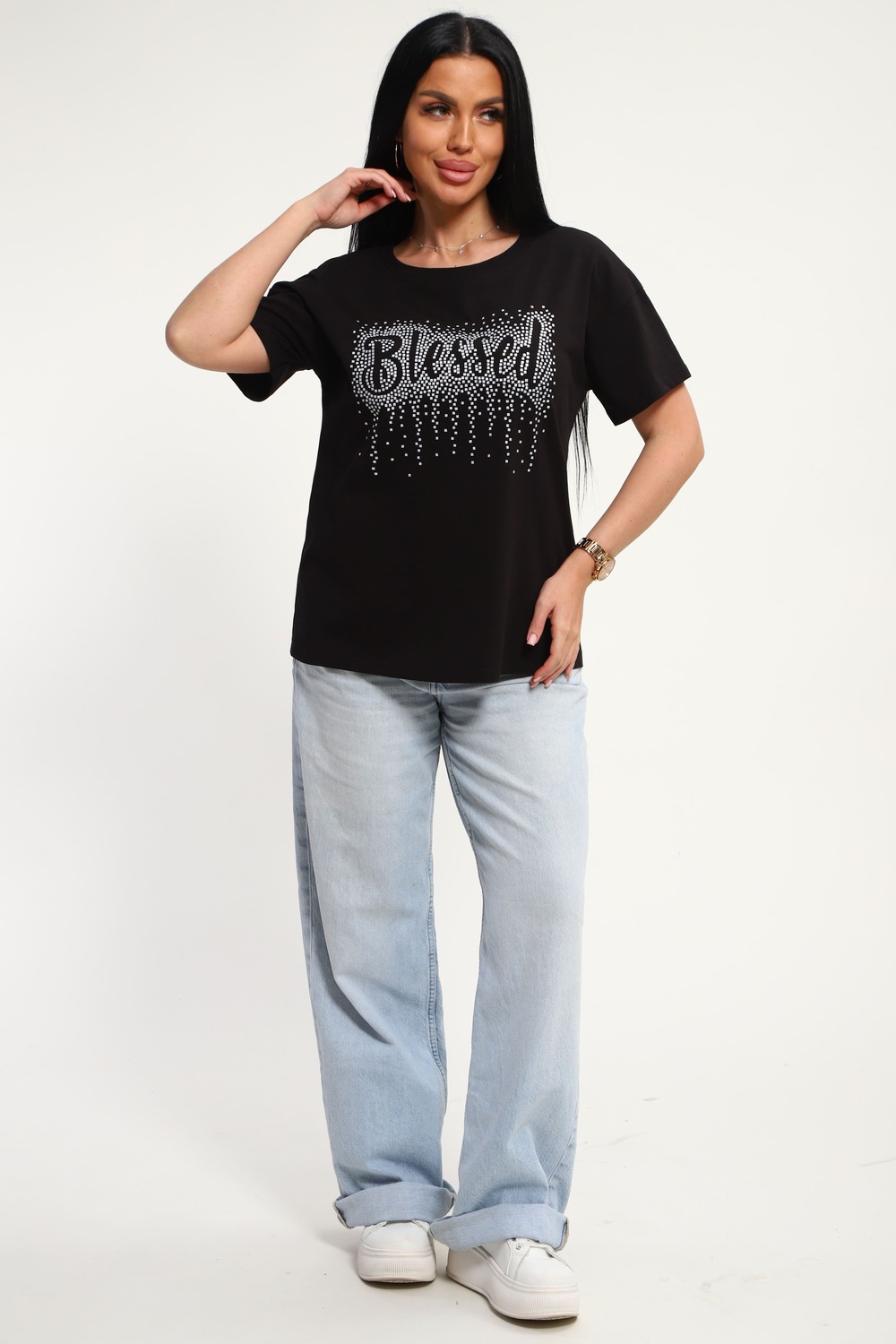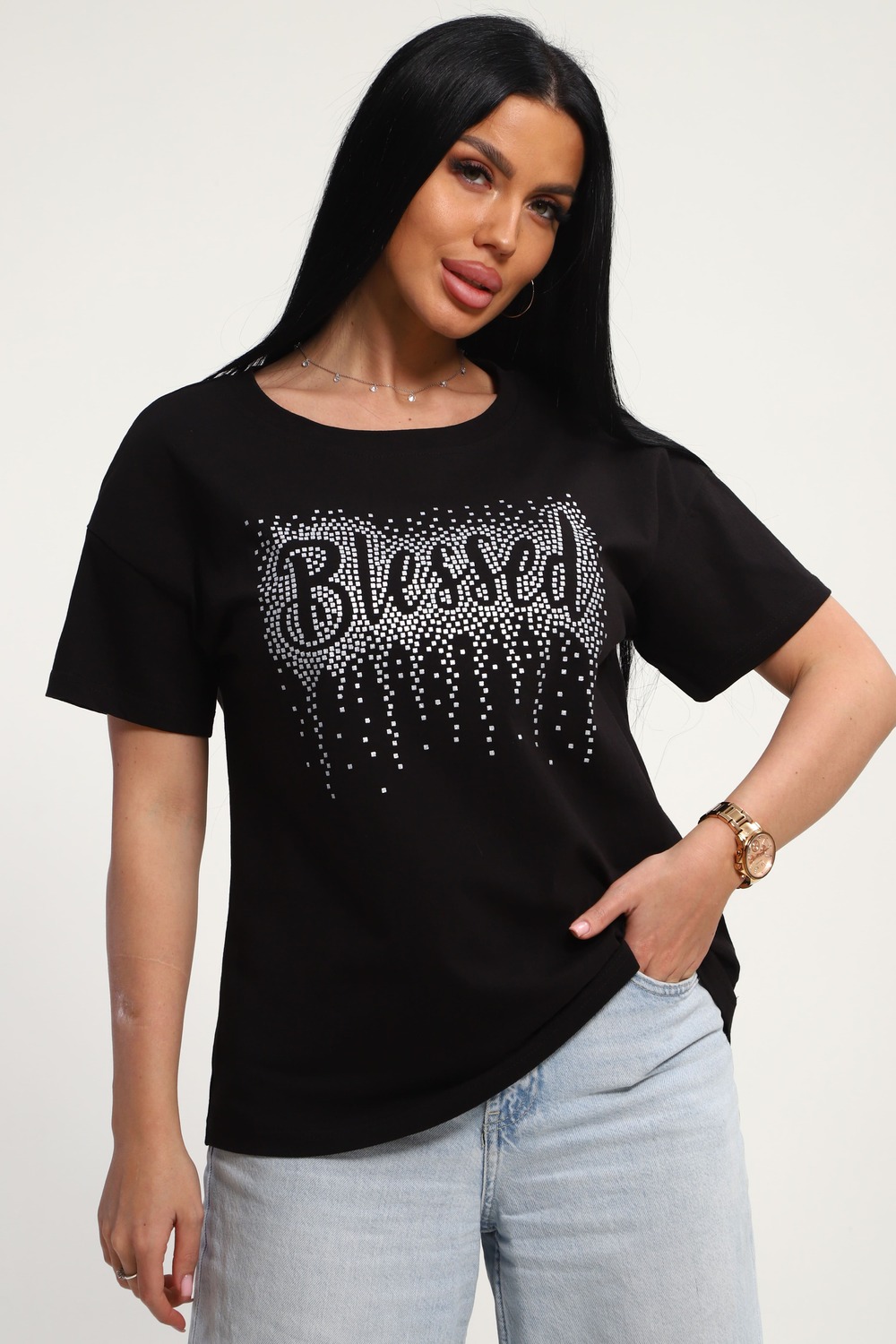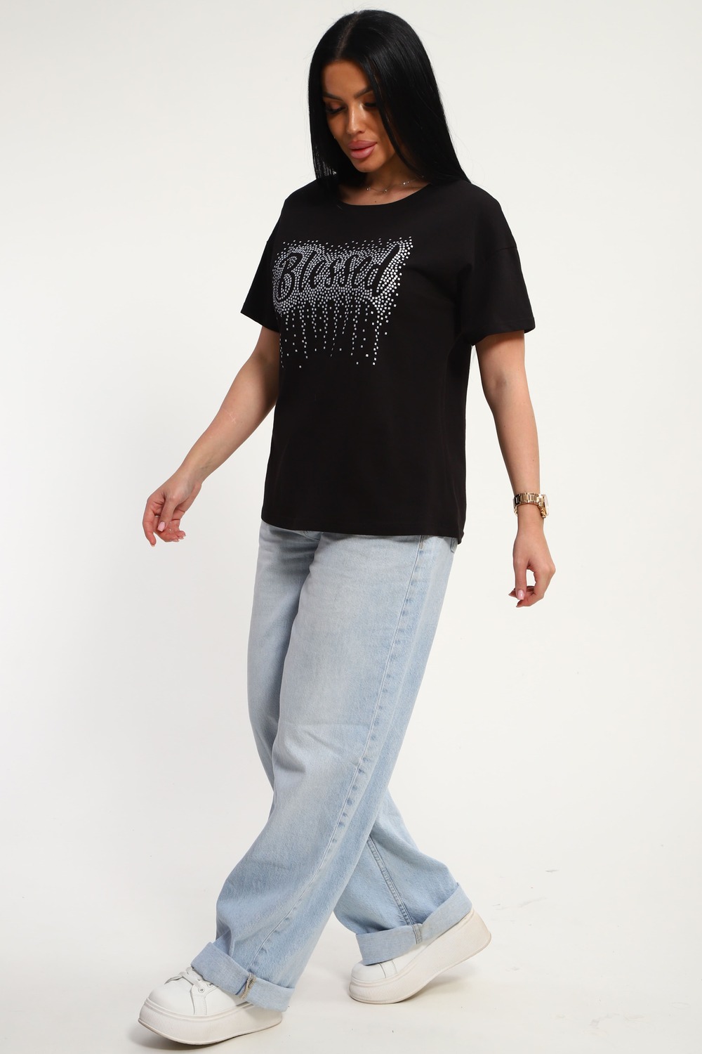 Футболка женская из гладкокрашенного трикотажа, хлопок 100%. Прямого силуэта, свободного облегания. горловина круглой формы. Рукав короткий. Низ изделия прямой. На полочке принт, шелкография.