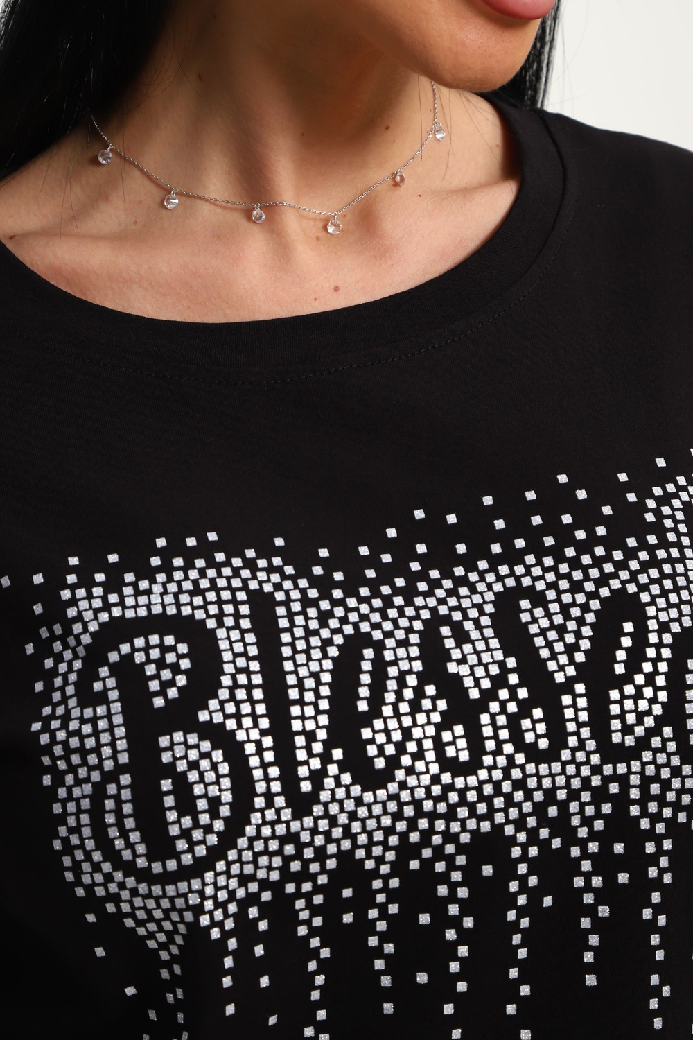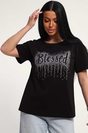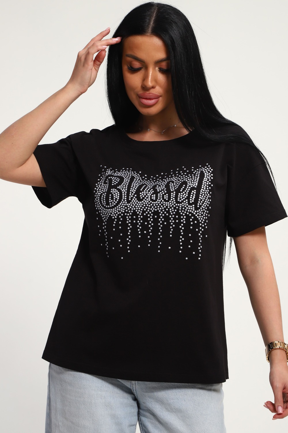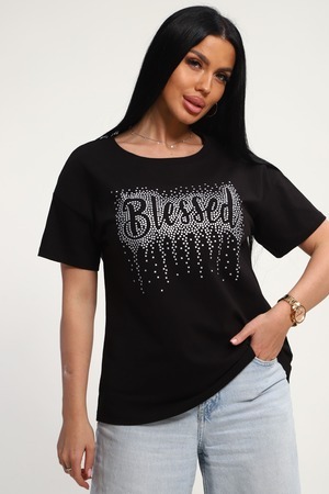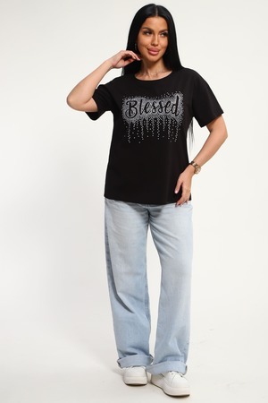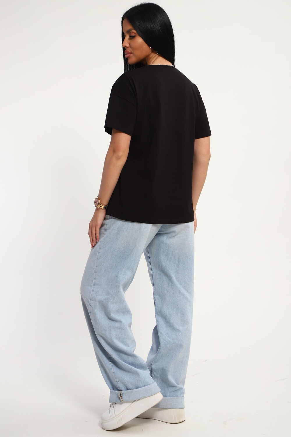 Футболка женская из гладкокрашенного трикотажа, хлопок 100%. Прямого силуэта, свободного облегания. горловина круглой формы. Рукав короткий. Низ изделия прямой. На полочке принт, шелкография.