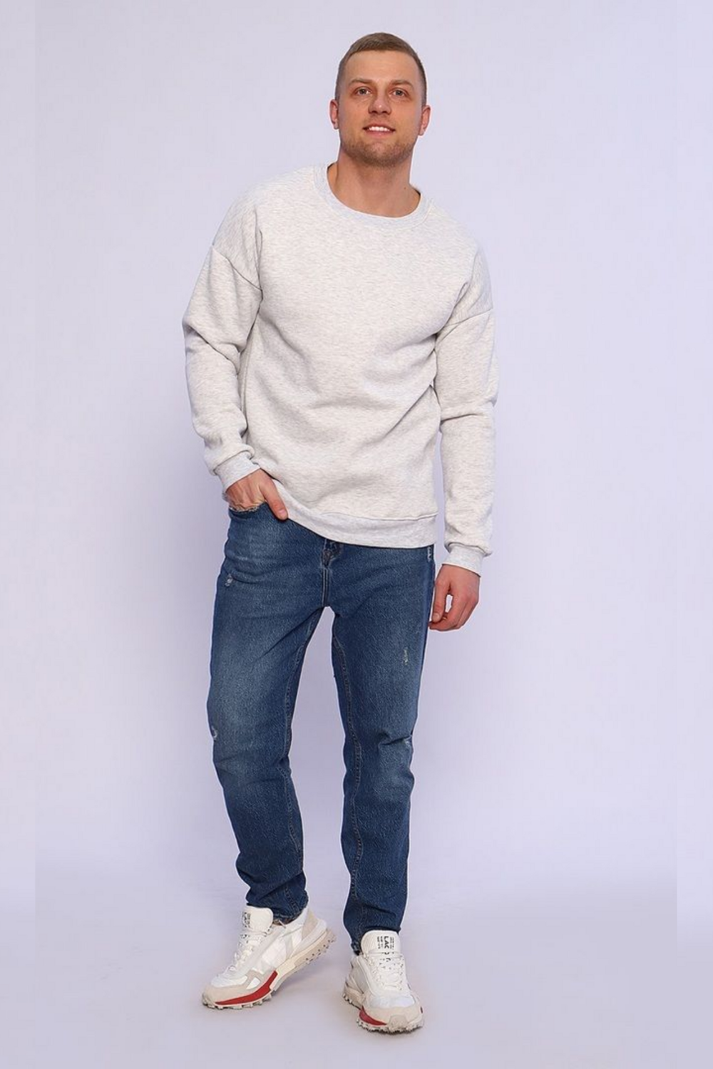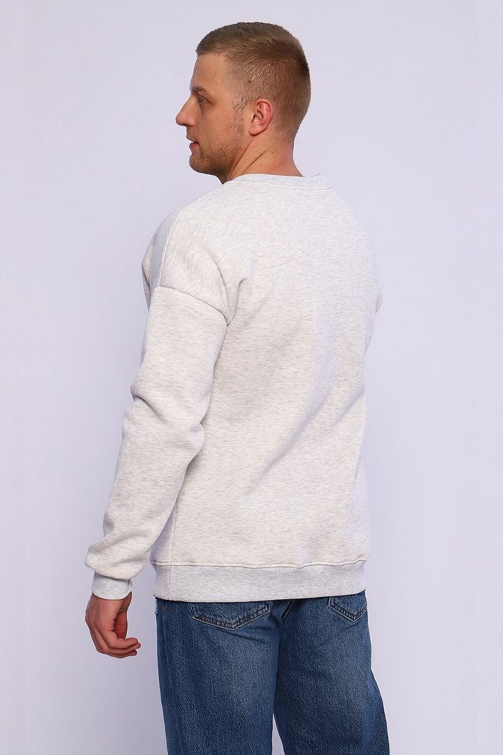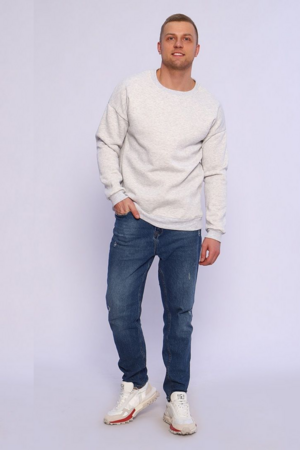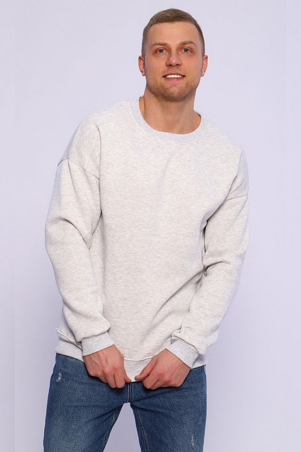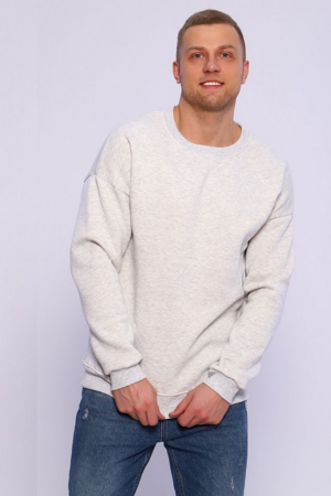 Мужской свитшот в цвете серый меланж — это базовая модель свободного кроя (оверсайз), выполненная из плотного футера с начесом. Такая одежда хорошо удерживает тепло и подходит для прохладной погоды.