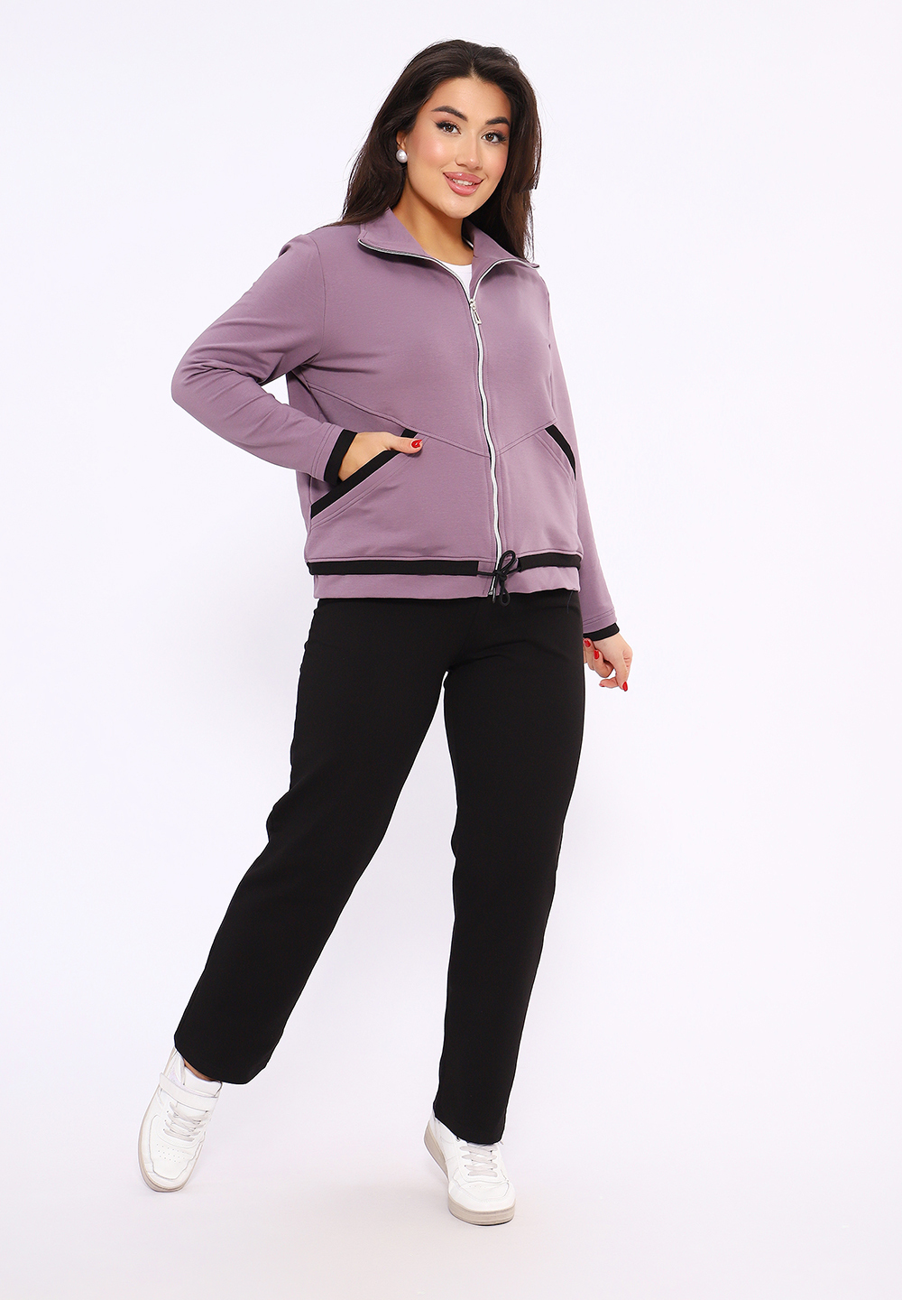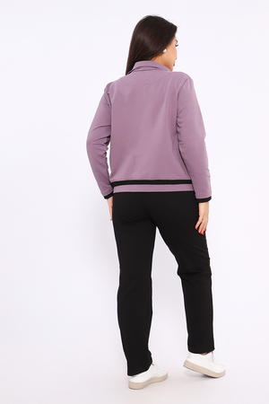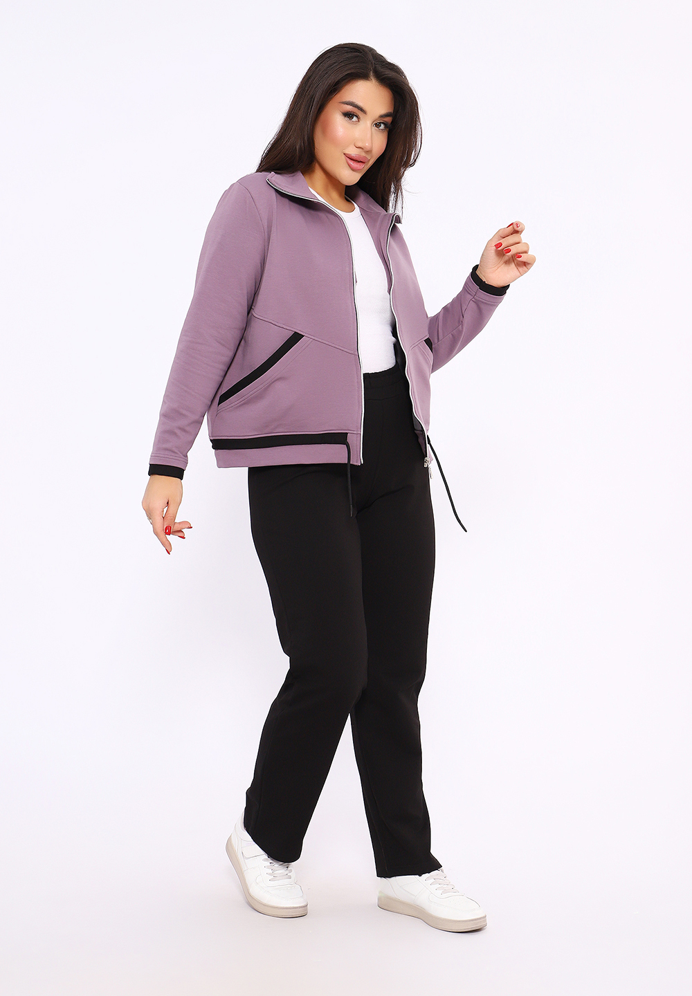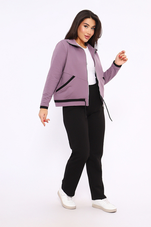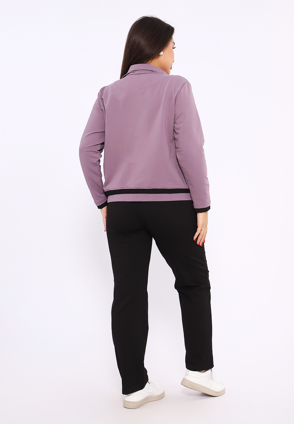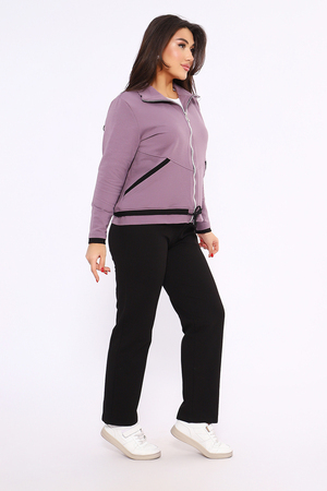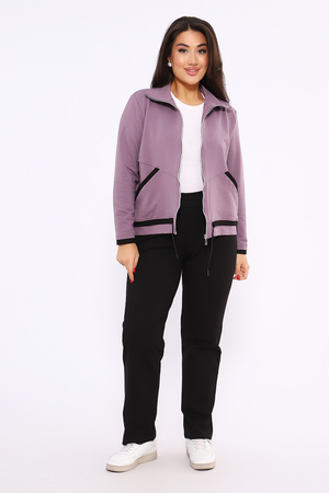 Этот женский спортивный костюм состоит из олимпийки на молнии с воротником-стойкой и черных спортивных брюк, изготовленных из мягкого и прочного материала футер 2-х нитка