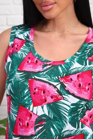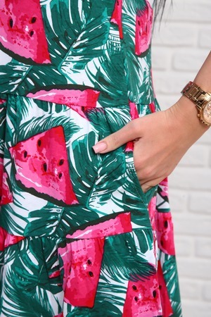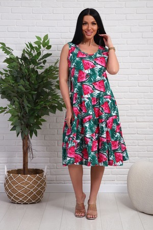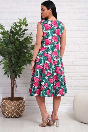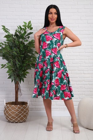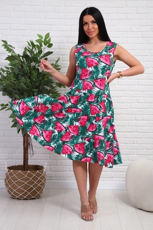 Платье-сарафан из натурального набивного трикотажа. Лиф приталенного силуэта. Юбка трёхъярусная , пышная. Горловина круглой формы. Рукавов нет. в боковых швах карманы.