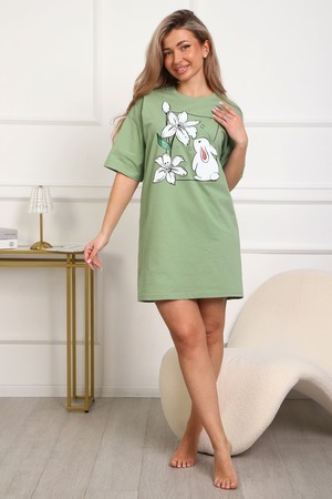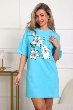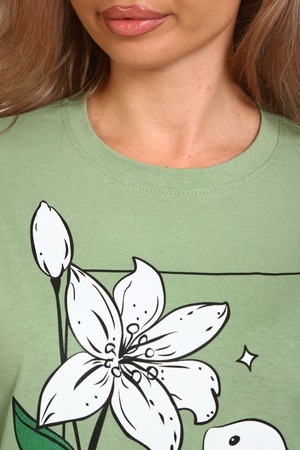 Туника женская прямого силуэта. Низ изделия прямой. Длинна выше колена, плечо спущенное, рукав короткий. Горловина круглой формы, обработана планкой с отделочной строчкой по шву притачивания. Принт (шелкография) располагается по центру переда.
