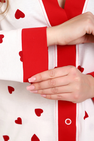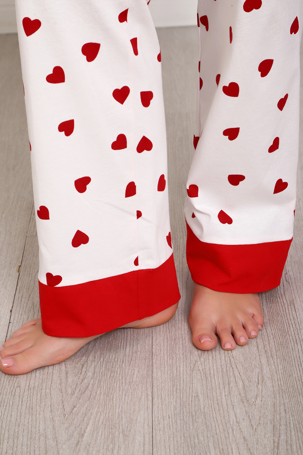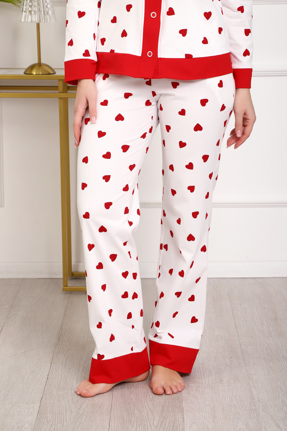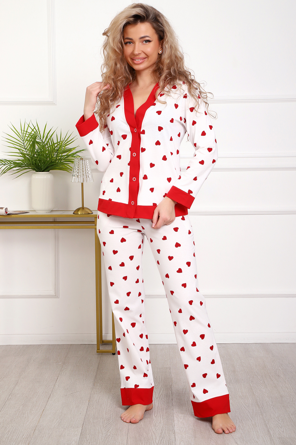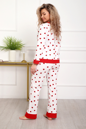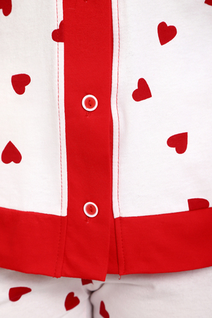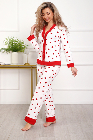 Пижама с брюками представлена в двух расцветках: лёгкий белый цвет с красными сердечками и классическая клетка на красном. Кофта с длинным рукавом с манжетами, низ изделия и застежка обработаны контрастной обтачкой. Кофта с застёжкой на пуговицы, с элегантным V-образным вырезом. брюки с "ленинградскими" боковыми карманами, притачной пояс, низ брюк обработан контрастными манжетами.