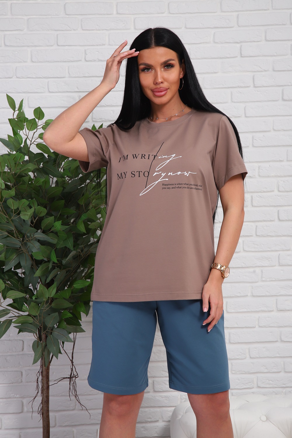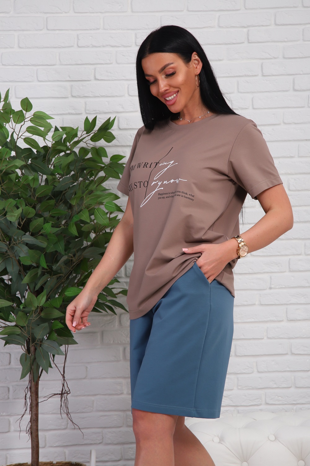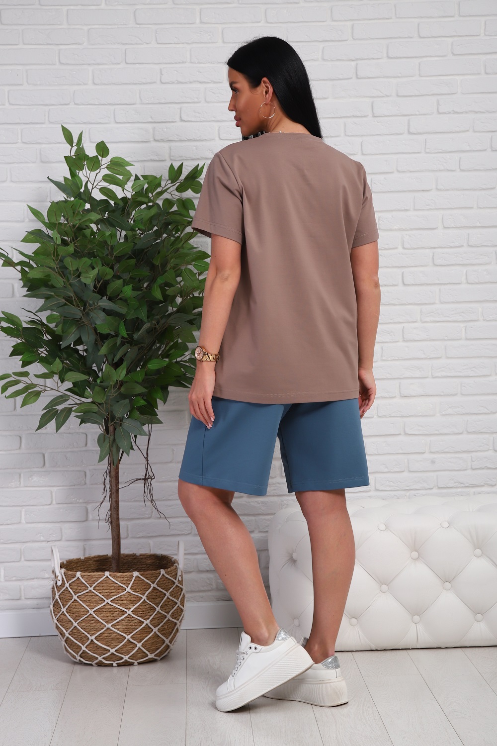 Костюм женский - футболка с короткими рукавами и шорты с боковыми карманами.