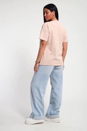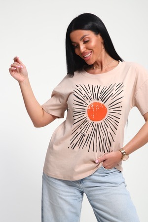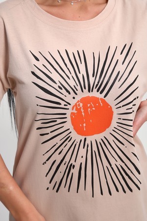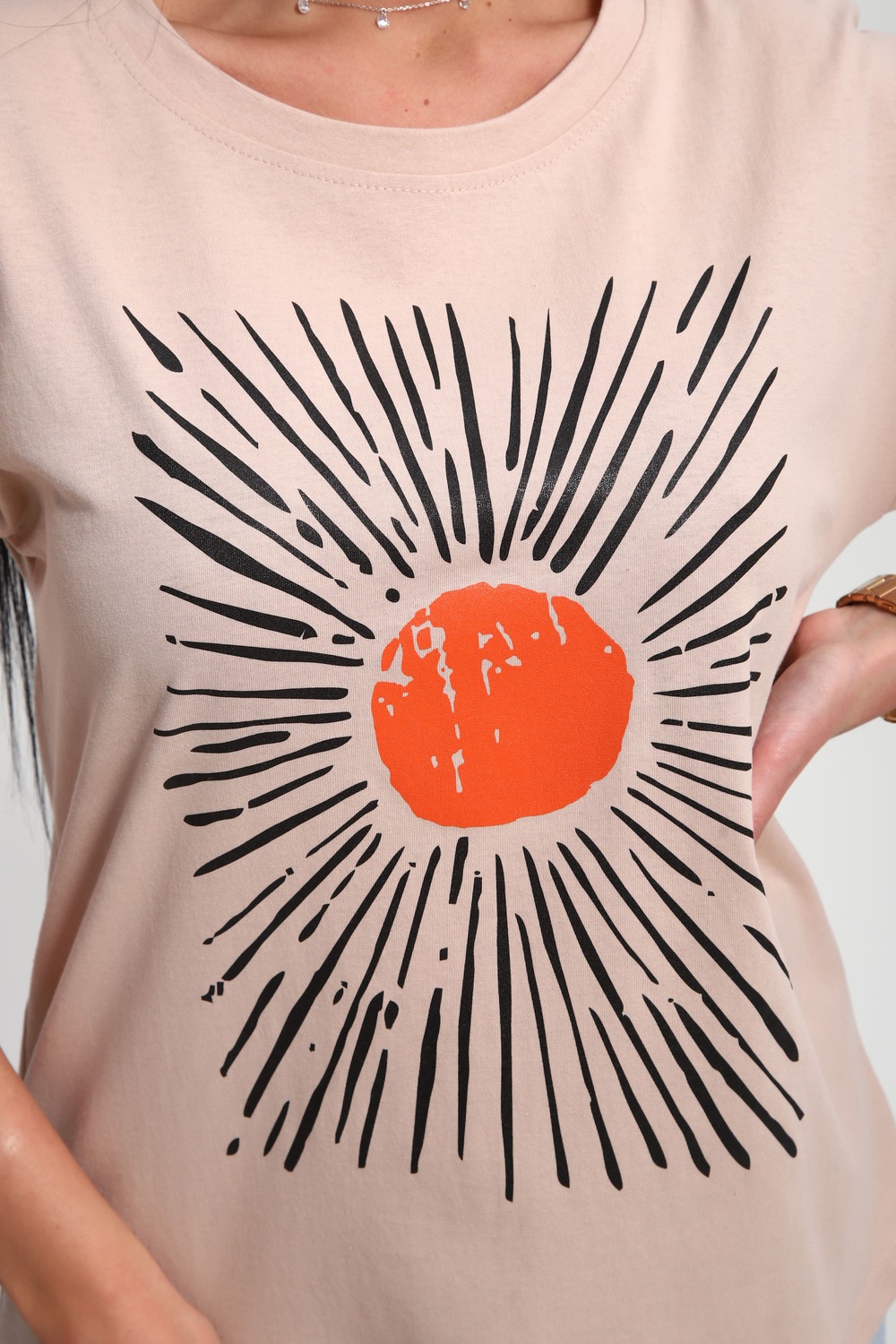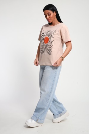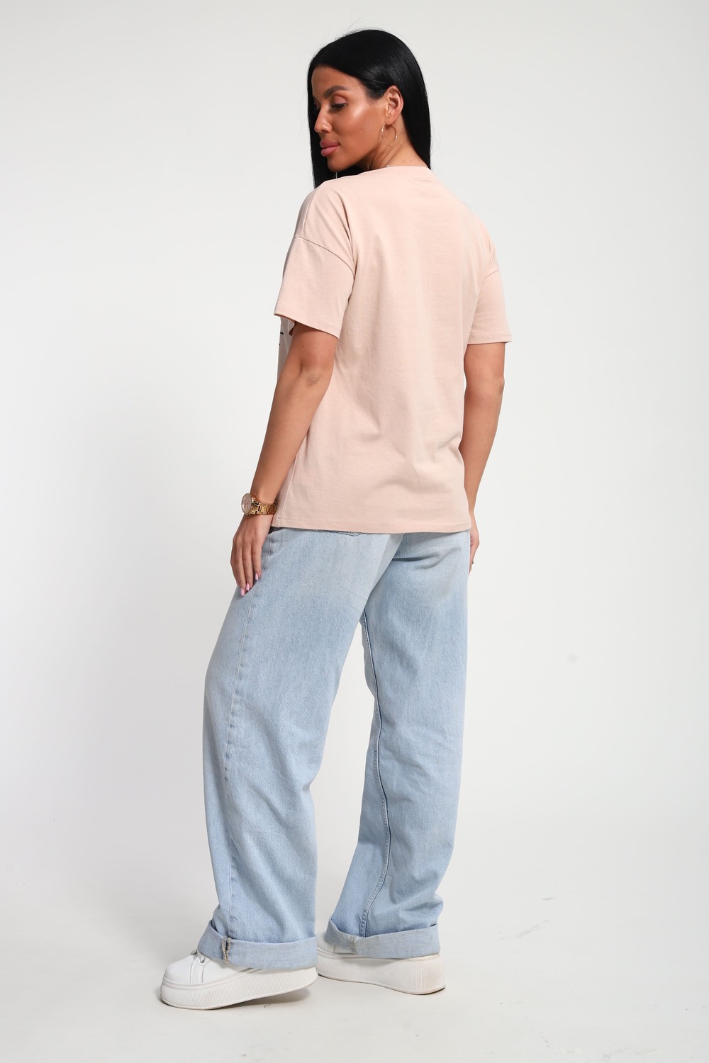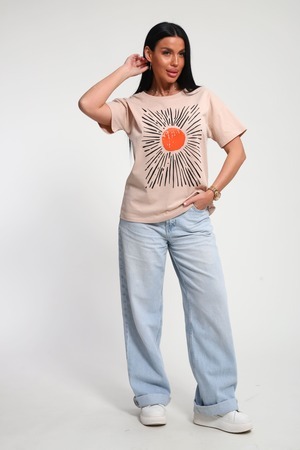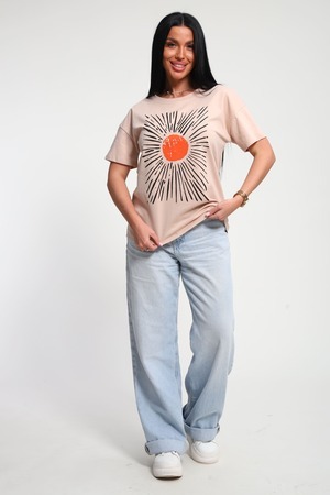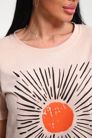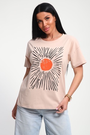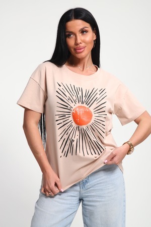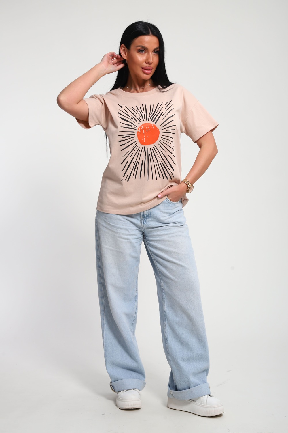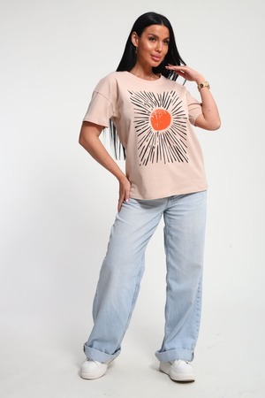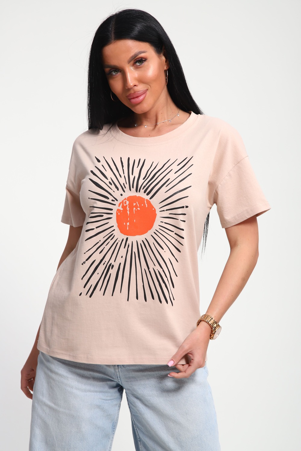 Футболка женская из гладкокрашенного трикотажа, хлопок 100%. Прямого силуэта, свободного облегания. горловина круглой формы. Рукав короткий. Низ изделия прямой. На полочке принт, шелкография.