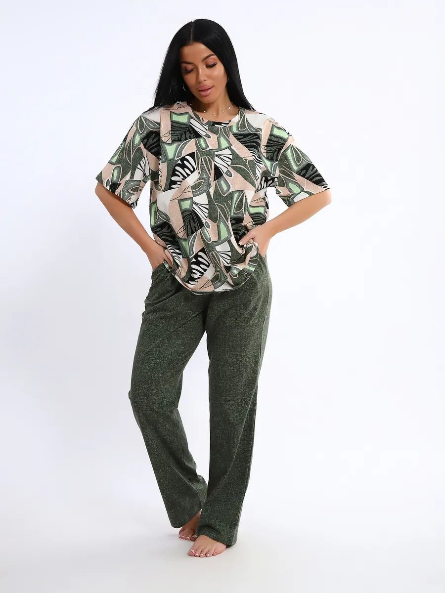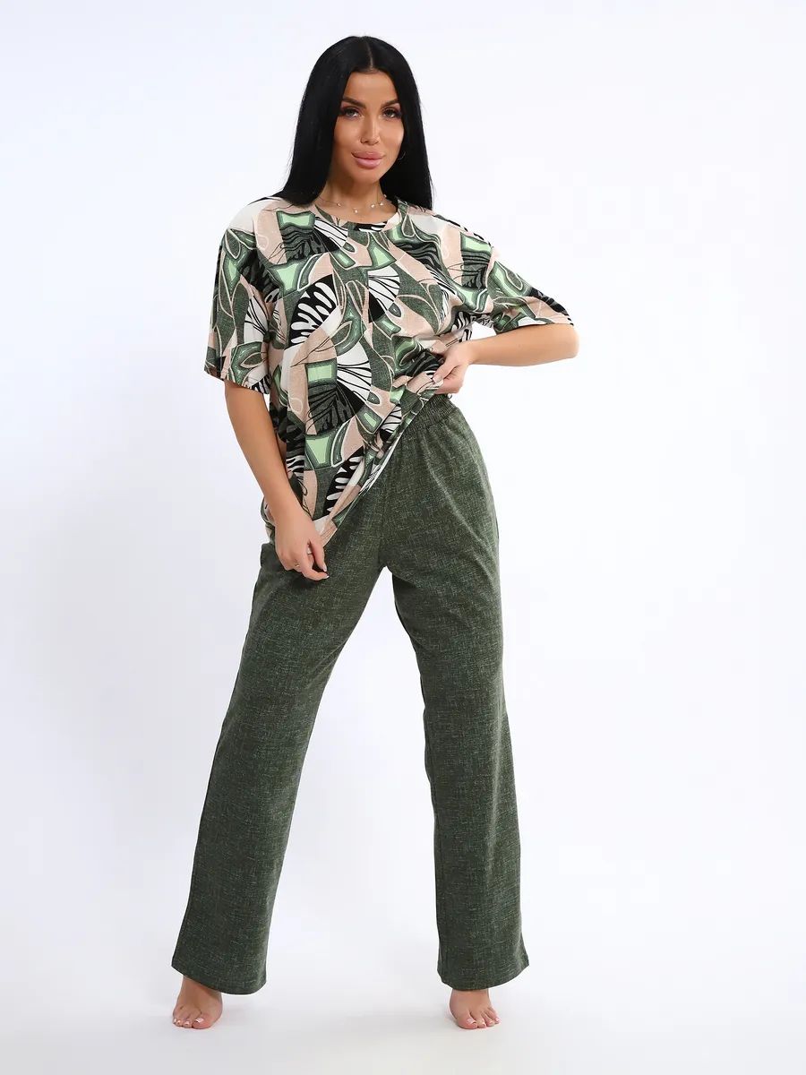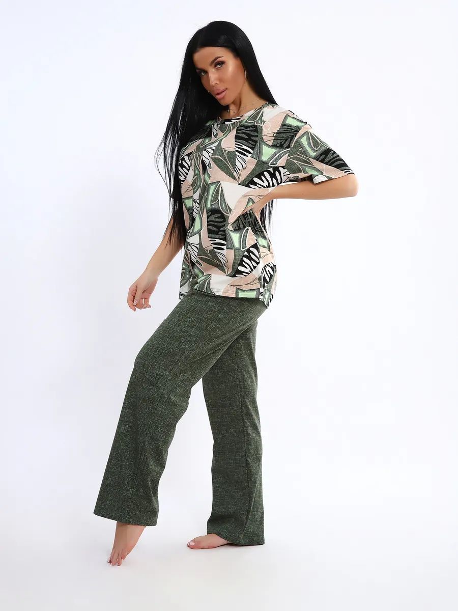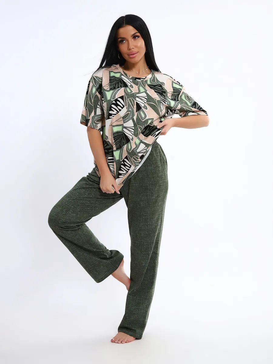 Женская пижама со штанами  – идеальный вариант для комфортного отдыха дома. Этот домашний костюм выполнен из мягкого трикотажного хлопка, что обеспечивает приятные ощущения при носке. Пижамка состоит из футболки с коротким рукавом и легких штанов с карманами, которые свободно облегают тело, не сковывая движений. Хлопковая ткань позволяет коже дышать, что особенно важно в жаркую погоду, обеспечивая свежесть и комфорт во время сна.