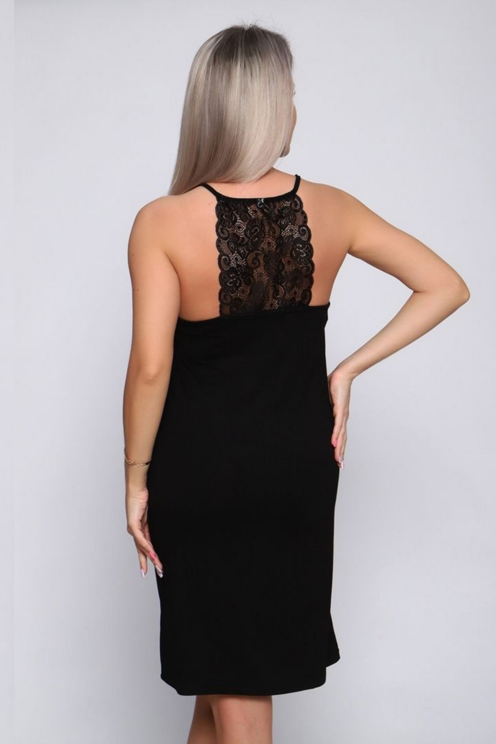 Кружевная отделка: Кружево на спинке придает изделию женственность и изысканность, делая его более привлекательным и сексуальным, чем обычная пижама. Дизайн может варьироваться: от тонких кружевных вставок до полностью кружевных кокеток или бретелей, которые могут перекрещиваться на спине.