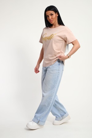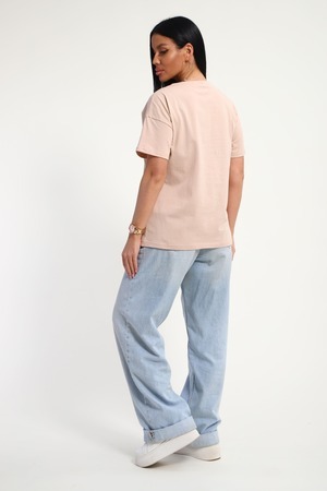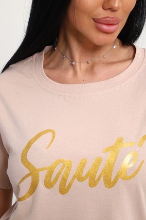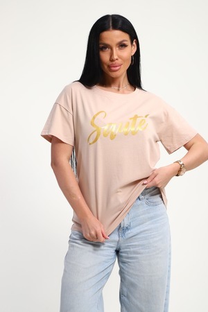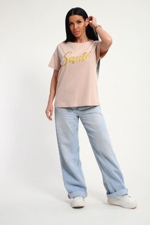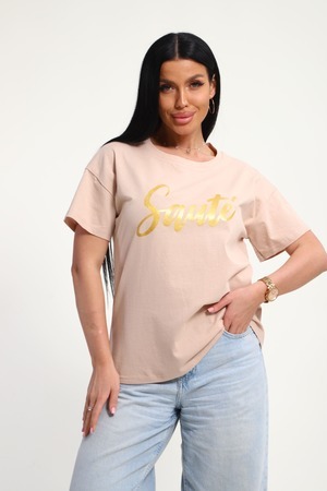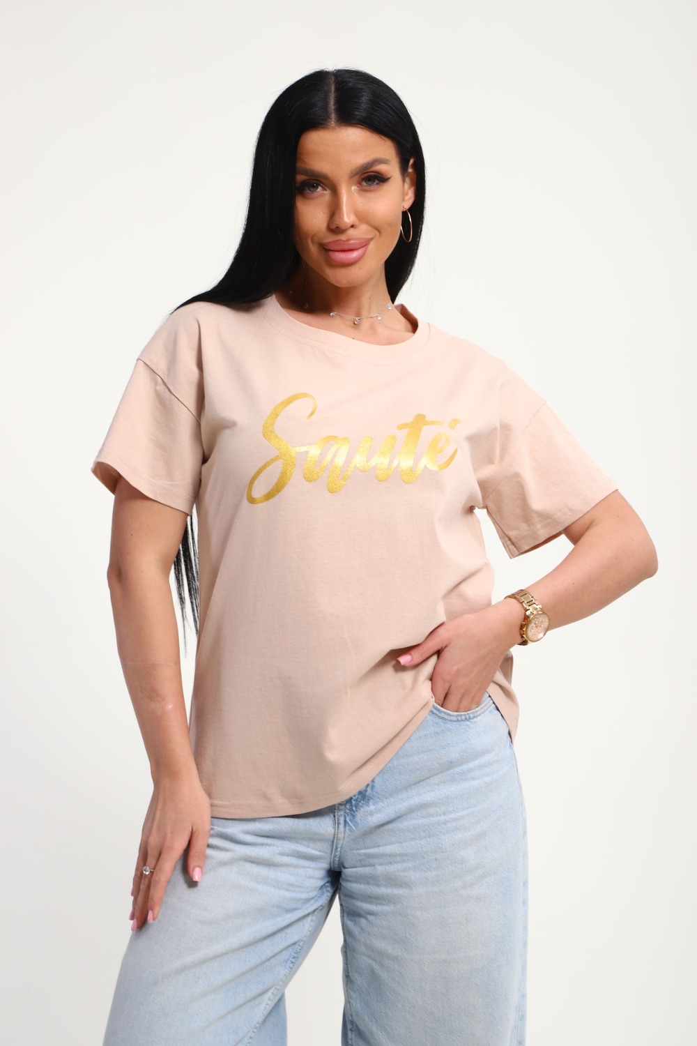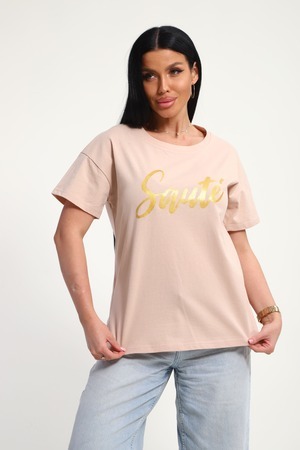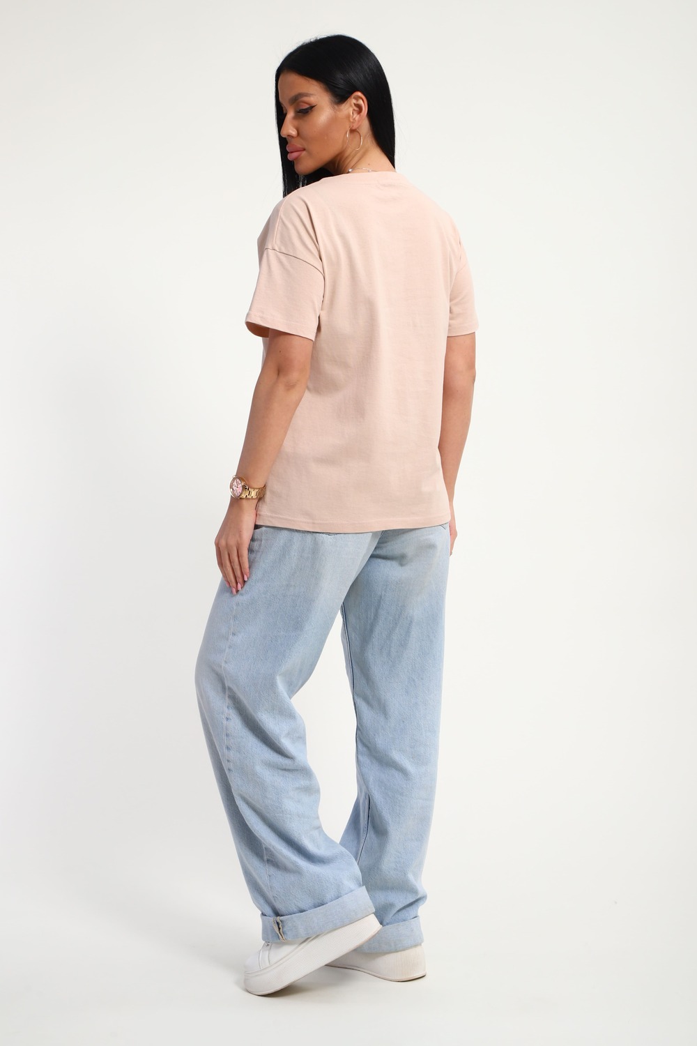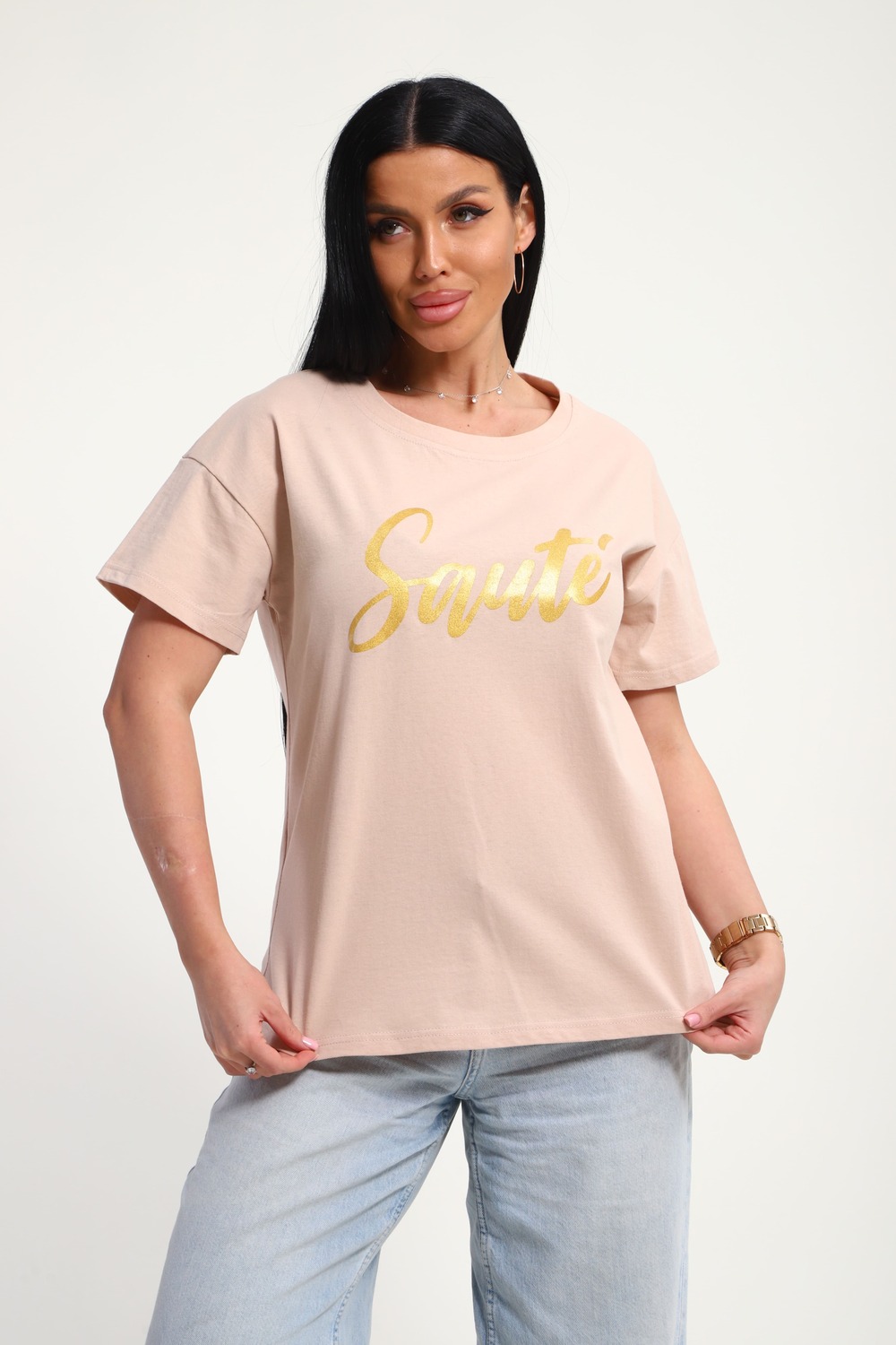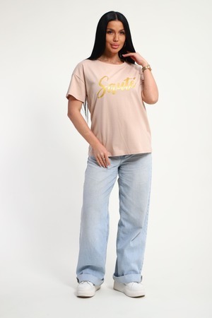 Футболка женская из гладкокрашенного трикотажа, хлопок 100%. Прямого силуэта, свободного облегания. горловина круглой формы. Рукав короткий. Низ изделия прямой. На полочке принт, шелкография.