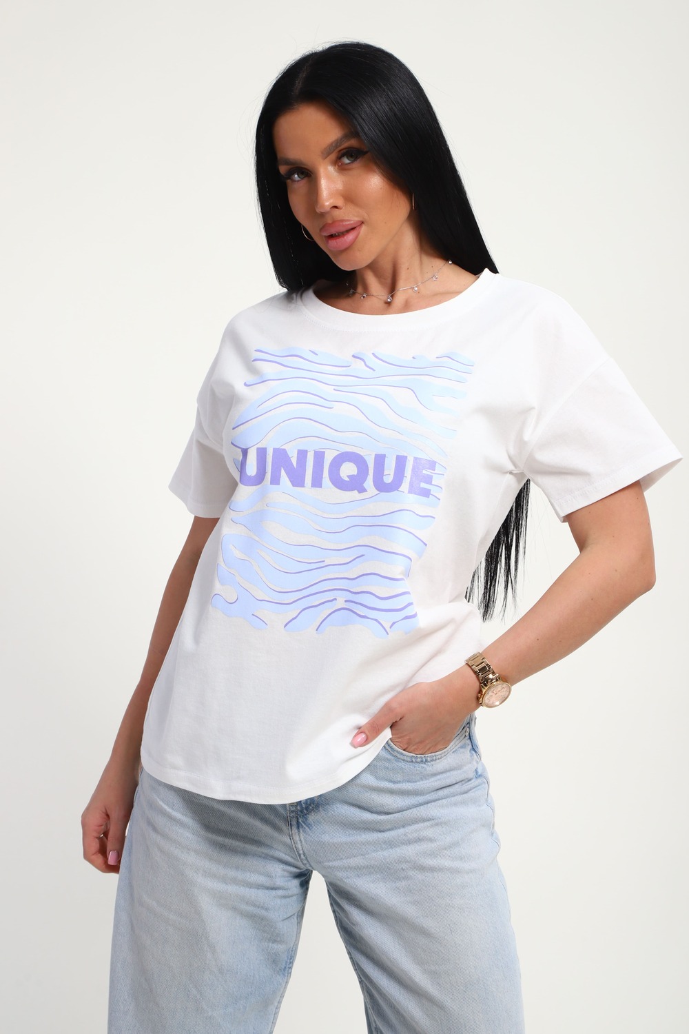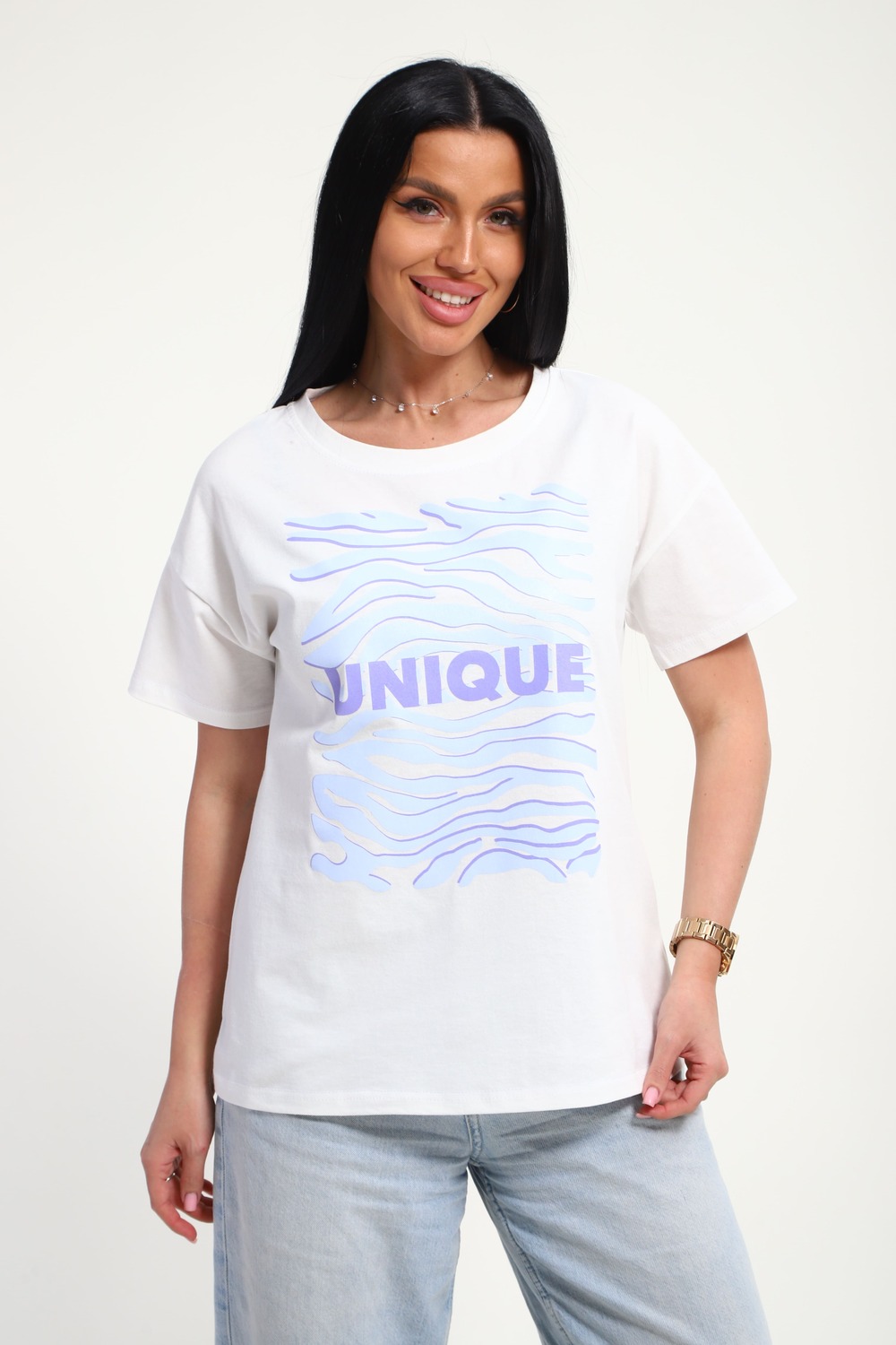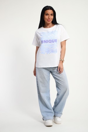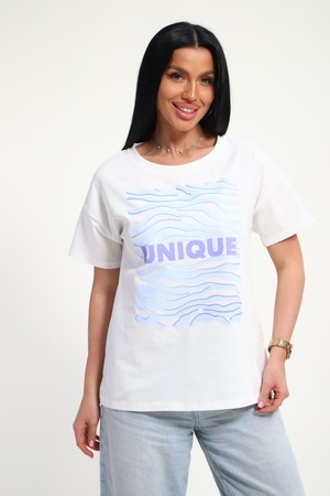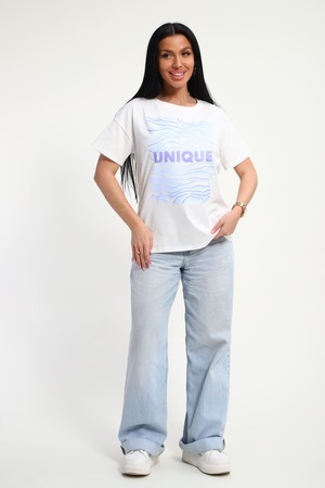 Футболка женская из гладкокрашенного трикотажа, хлопок 100%. Прямого силуэта, свободного облегания. горловина круглой формы. Рукав короткий. Низ изделия прямой. На полочке принт, шелкография.