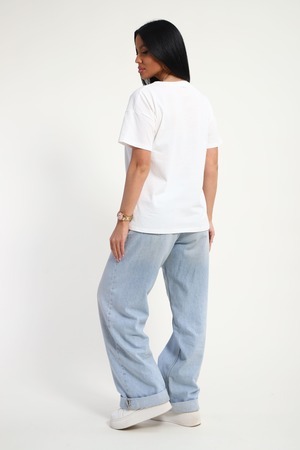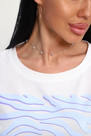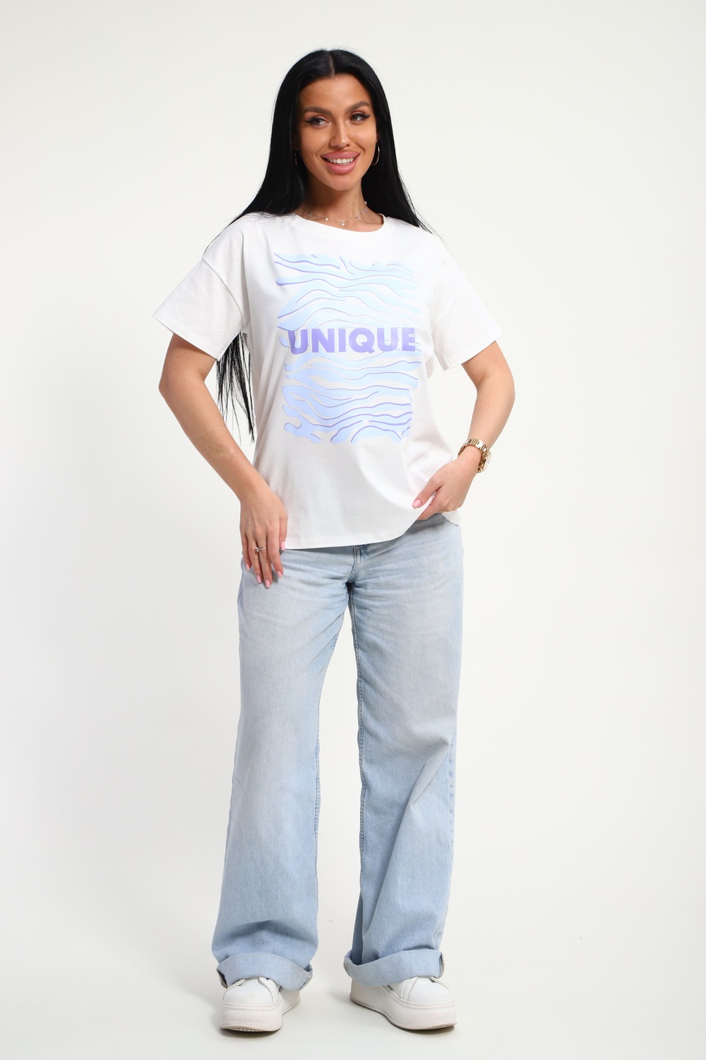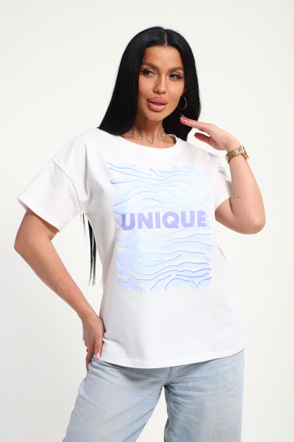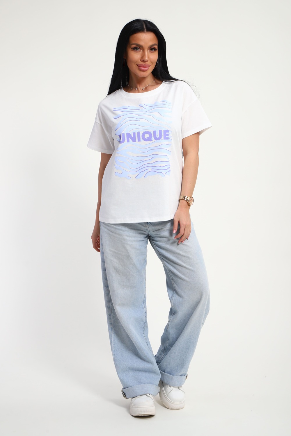 Футболка женская из гладкокрашенного трикотажа, хлопок 100%. Прямого силуэта, свободного облегания. горловина круглой формы. Рукав короткий. Низ изделия прямой. На полочке принт, шелкография.