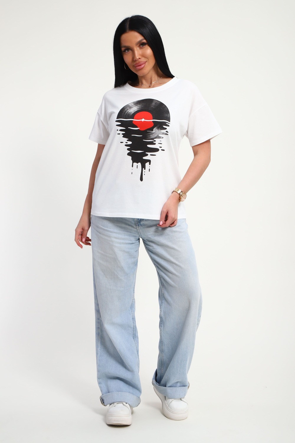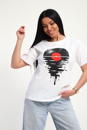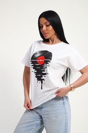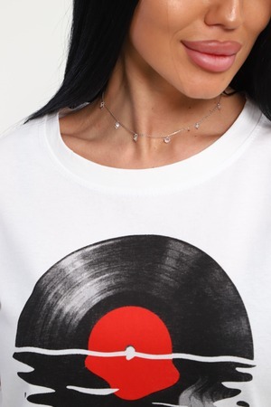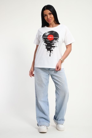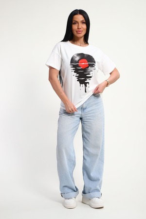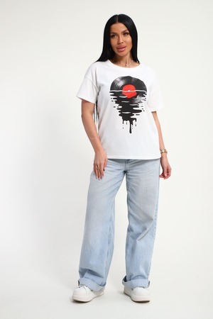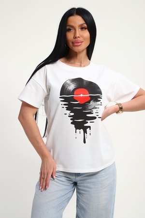 Футболка женская из гладкокрашенного трикотажа, хлопок 100%. Прямого силуэта, свободного облегания. горловина круглой формы. Рукав короткий. Низ изделия прямой. На полочке принт, шелкография.
