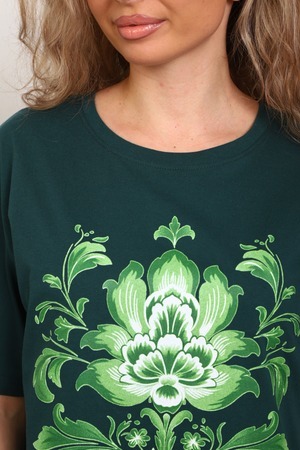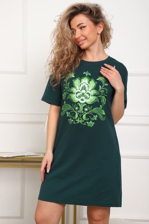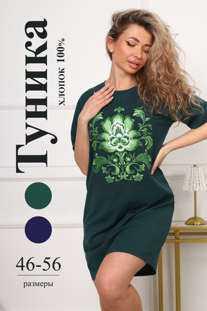Туника женская прямого силуэта. Низ изделия прямой. Длинна выше колена, плечо спущенное, рукав короткий. Горловина круглой формы, обработана планкой с отделочной строчкой по шву притачивания. Принт (шелкография) располагается по центру переда.