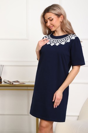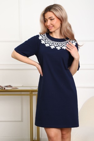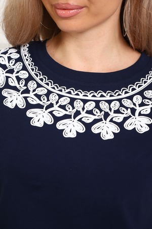 Туника женская прямого силуэта. Низ изделия прямой. Длинна выше колена, плечо спущенное, рукав короткий. Горловина круглой формы, обработана планкой с отделочной строчкой. Принт (шелкография пуф) в виде кружевного воротника.