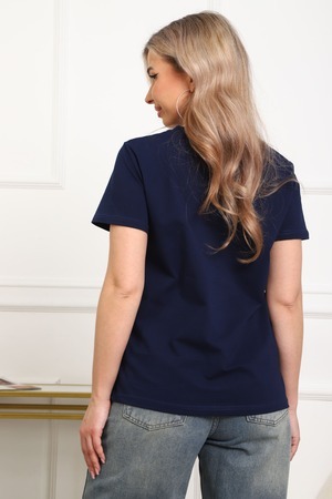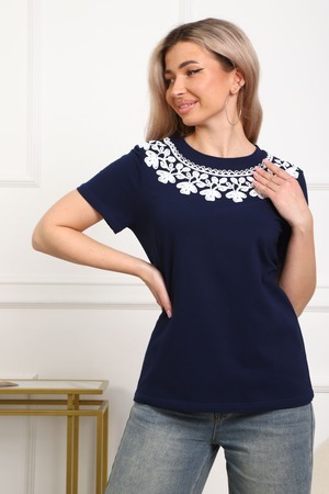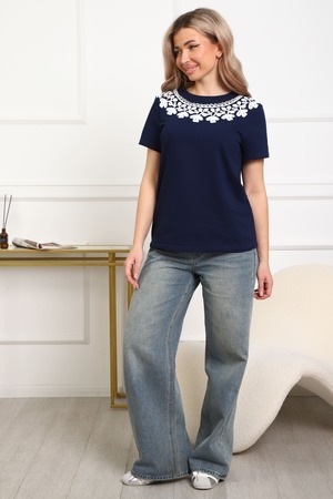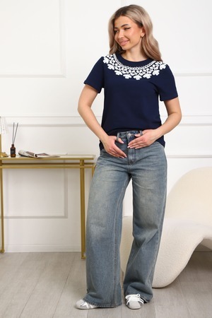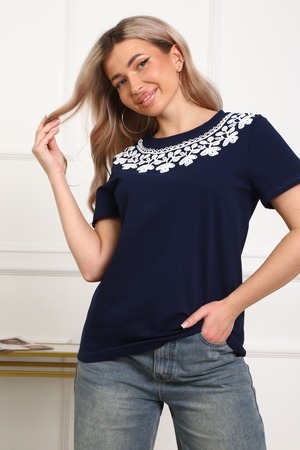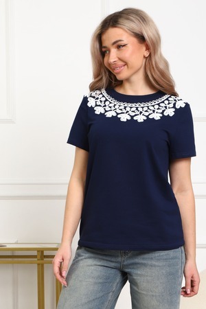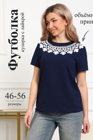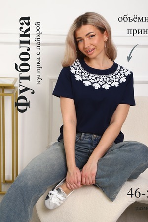 Футболка женская прямого силуэта. Низ изделия прямой. Длинна до середины бедра, плечо на естественном месте, рукав короткий. Горловина круглой формы, обработана планкой . Принт (шелкография пуф) в виде кружевного воротника.
