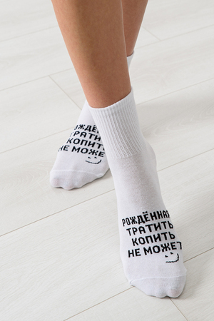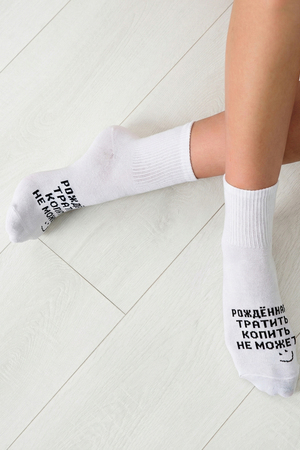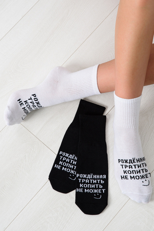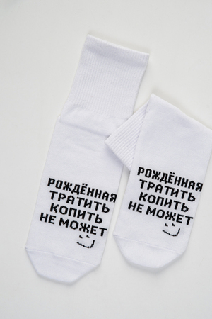 Выбери носки для тех, кто знает: жизнь одна, а удовольствие — в каждой покупке! Яркий принт “Рождённая тратить, копить не может” поднимет настроение тебе и всем вокруг. Мягкий хлопок, отличная посадка, долговечность и нескучный дизайн — именно то, что нужно для максимального комфорта и самовыражения.