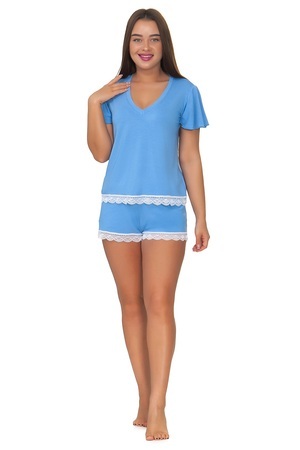Пижама женская: футболка с кружевной отделкой и с рукавами-крылышками; шорты с кружевом по низу. Материал: очень нежная и комфортная вискоза, тонкое мягкое кружево.