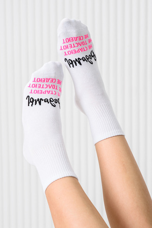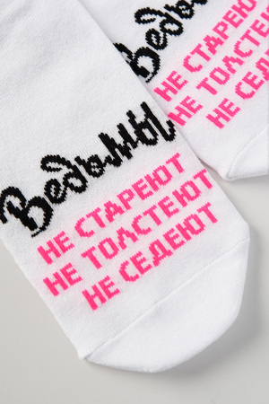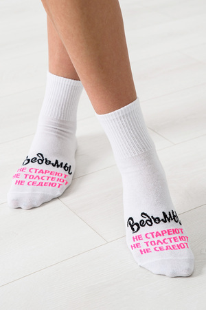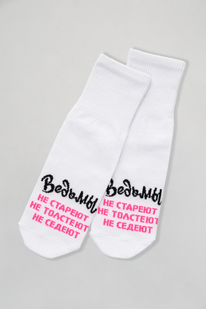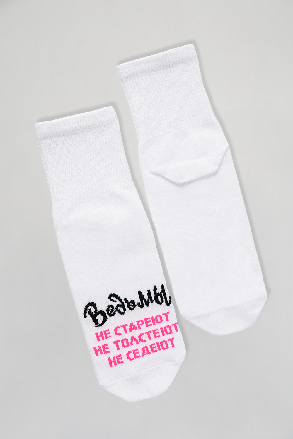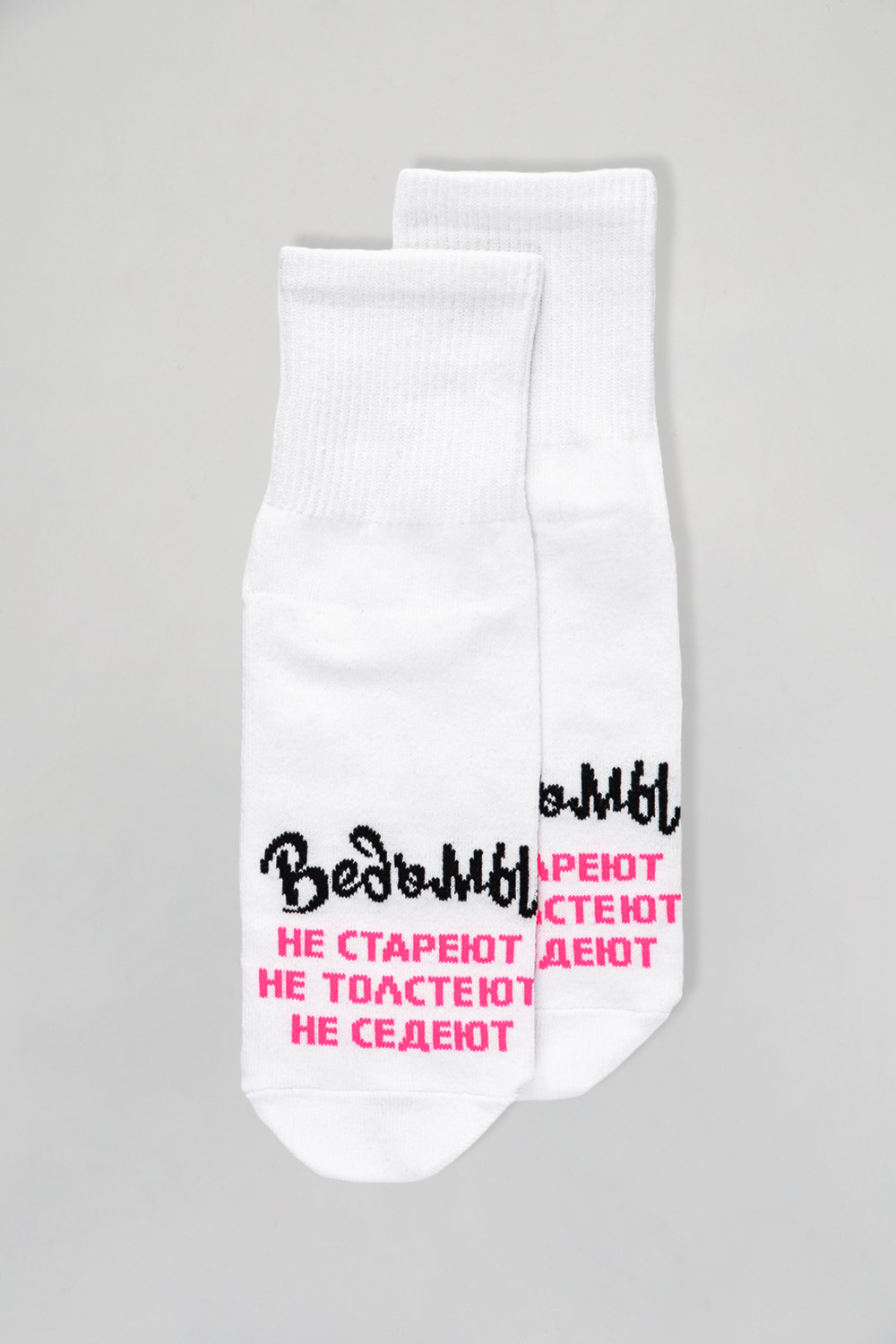 Добавьте в свой образ чуточку магии и юмора с этими стильными носками! Белые носки с яркой надписью «Ведьмы не стареют, не толстеют, не седеют» созданы для тех, кто любит быть в центре внимания и всегда верит в маленькие чудеса. Мягкий и приятный к телу материал подарит комфорт на весь день, а оригинальный дизайн подчеркнёт вашу индивидуальность. Отличный подарок для себя или подруги, которая уверена: всё волшебство — в ней самой!