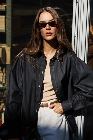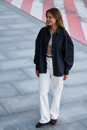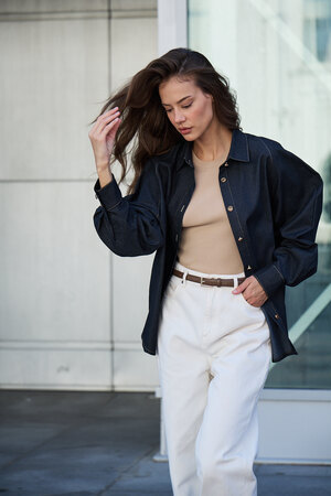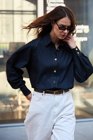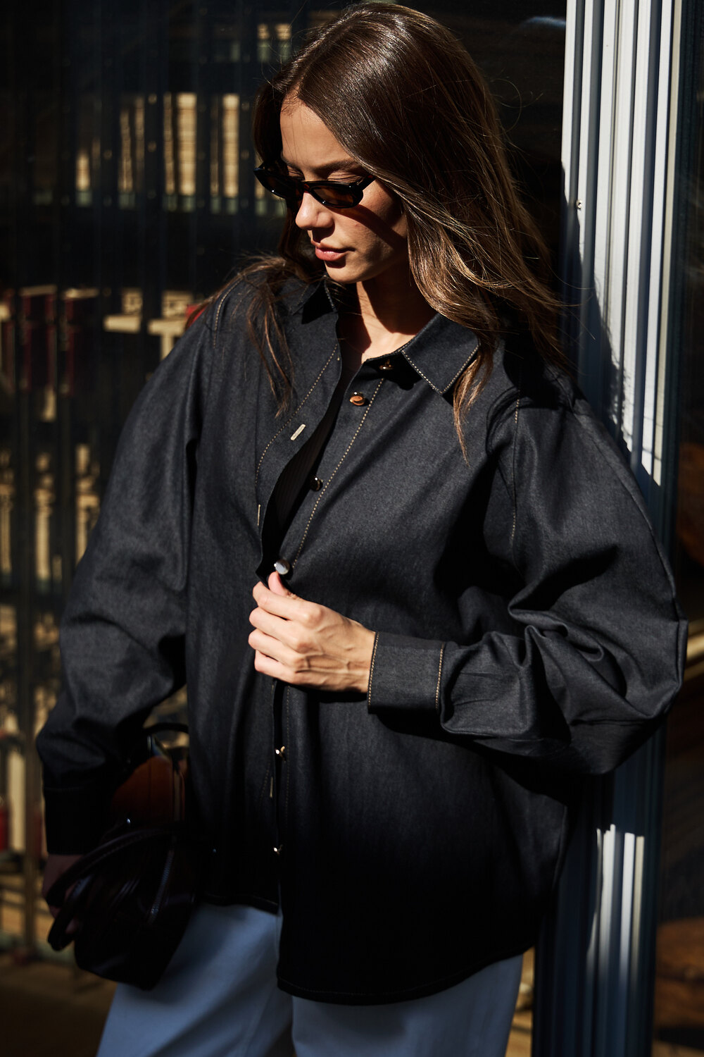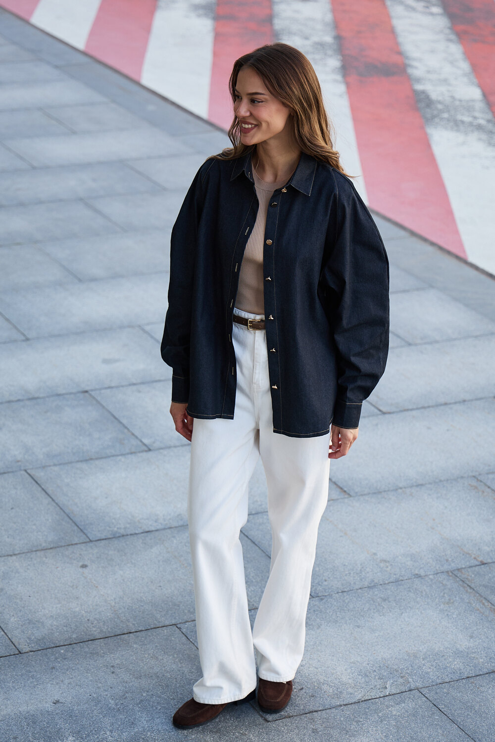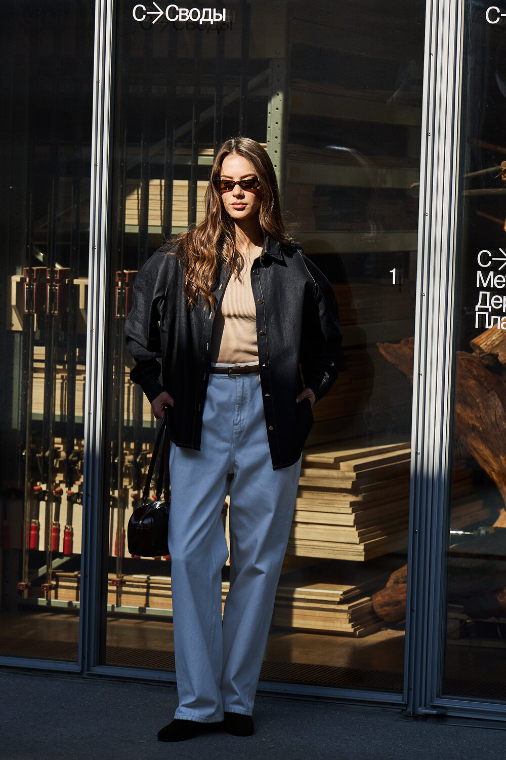 Свободный крой oversize позволяет носить рубашку как самостоятельный предмет гардероба, так и в качестве стильного второго слоя, накинув ее поверх топа или футболки. Универсальность модели подчеркивается возможностью экспериментировать с образом, подвернув рукава или завязав рубашку узлом на талии, создавая акцент на силуэте.