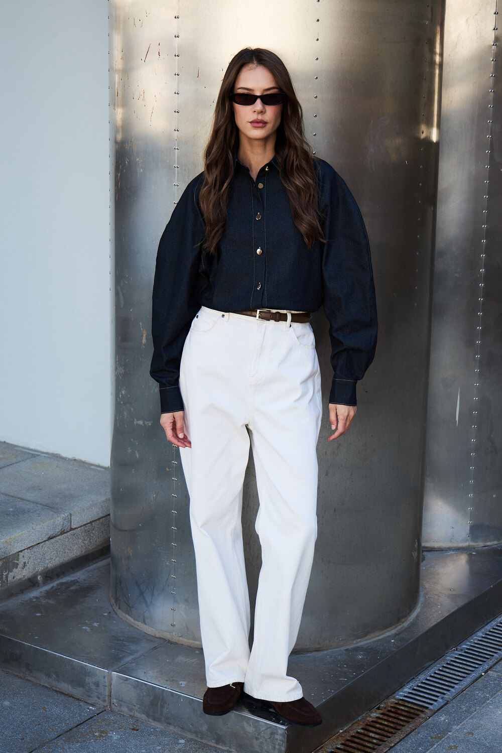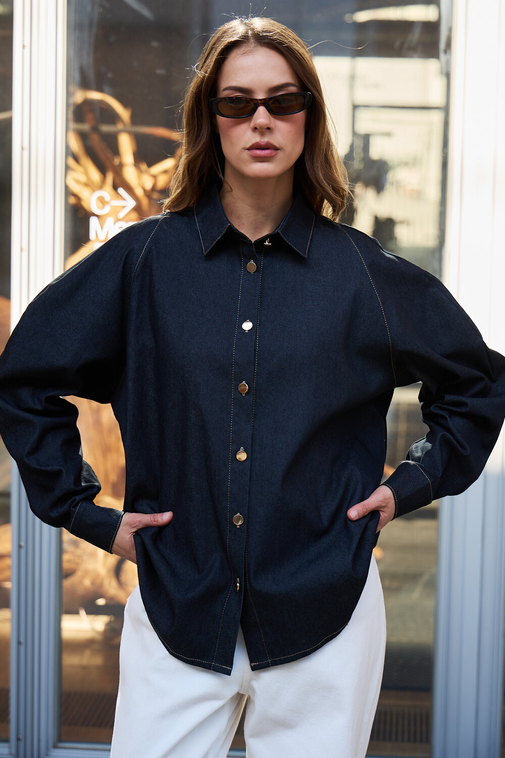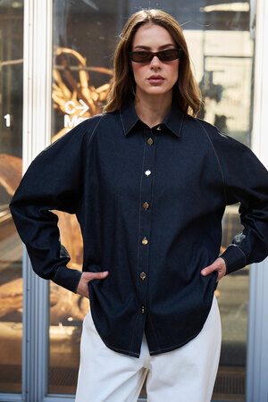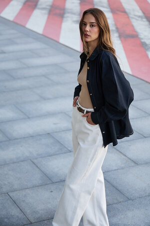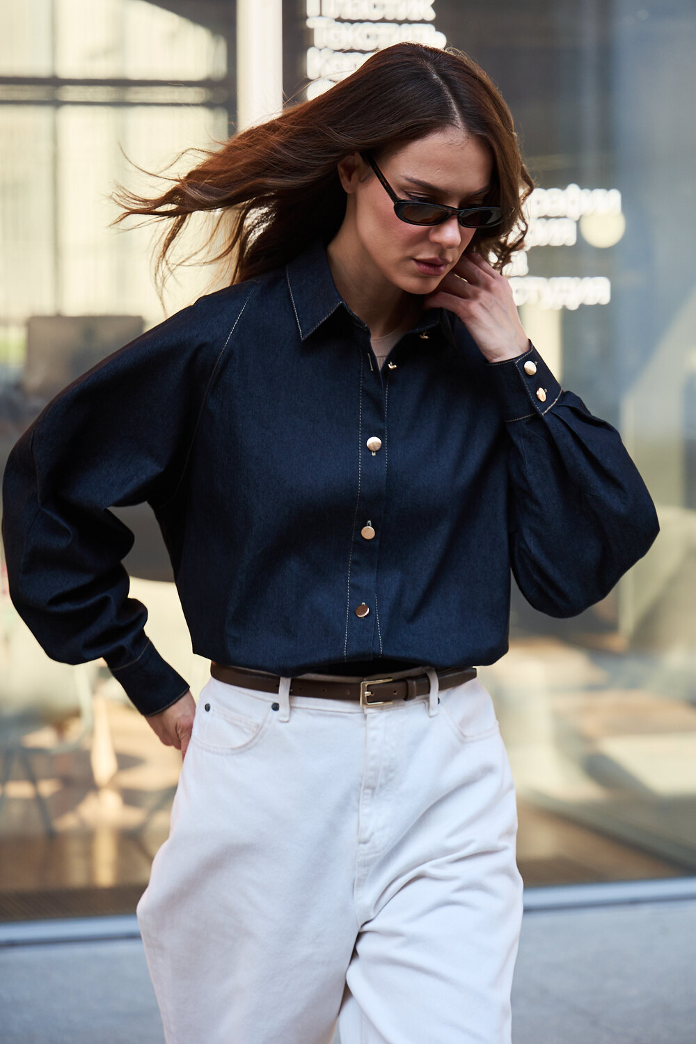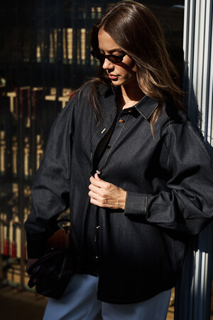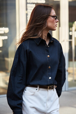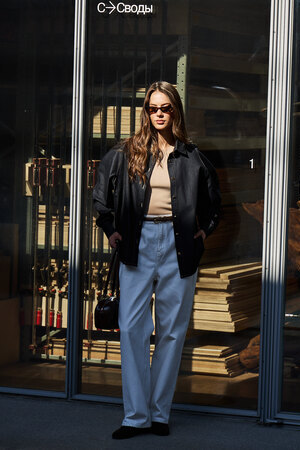 Свободный крой oversize позволяет носить рубашку как самостоятельный предмет гардероба, так и в качестве стильного второго слоя, накинув ее поверх топа или футболки. Универсальность модели подчеркивается возможностью экспериментировать с образом, подвернув рукава или завязав рубашку узлом на талии, создавая акцент на силуэте.