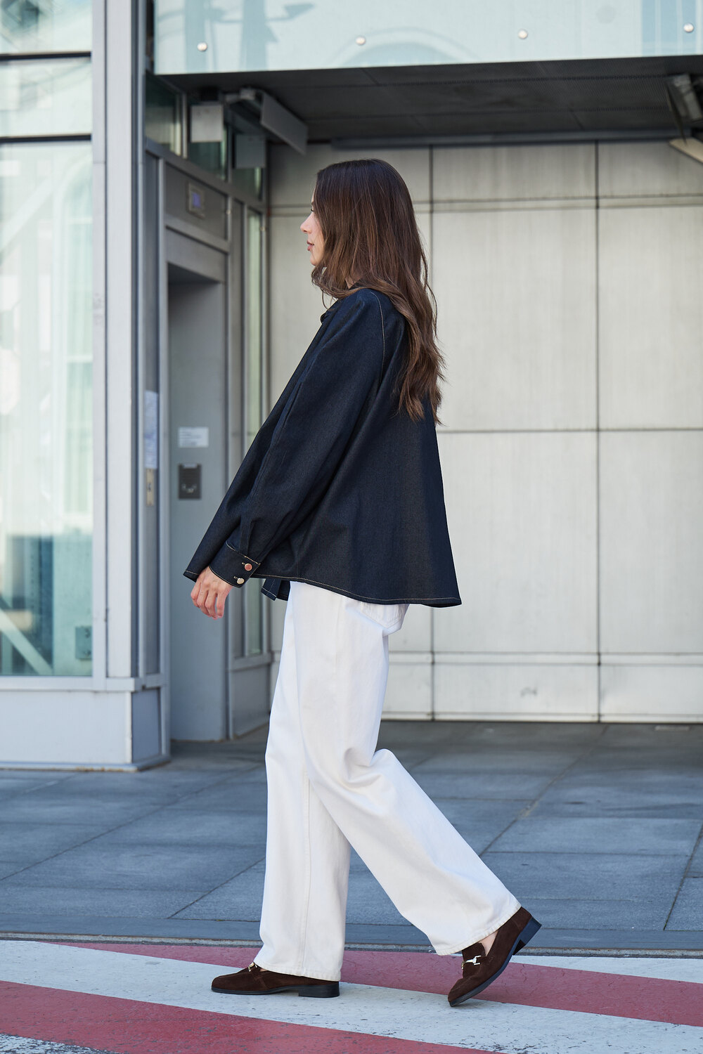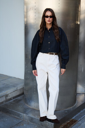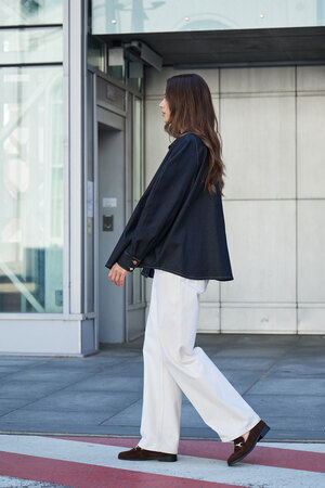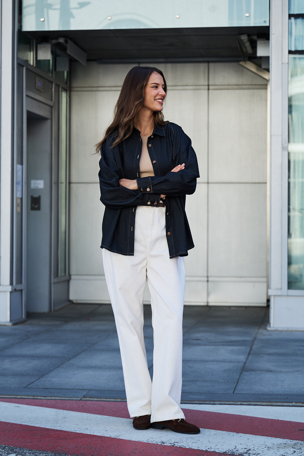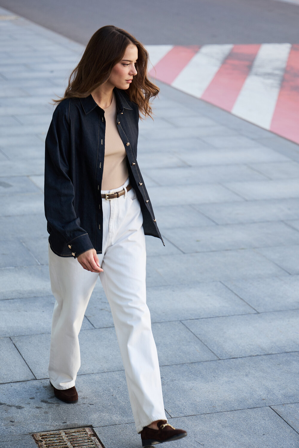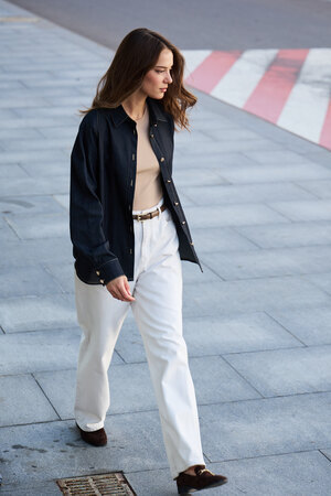Свободный крой oversize позволяет носить рубашку как самостоятельный предмет гардероба, так и в качестве стильного второго слоя, накинув ее поверх топа или футболки. Универсальность модели подчеркивается возможностью экспериментировать с образом, подвернув рукава или завязав рубашку узлом на талии, создавая акцент на силуэте.