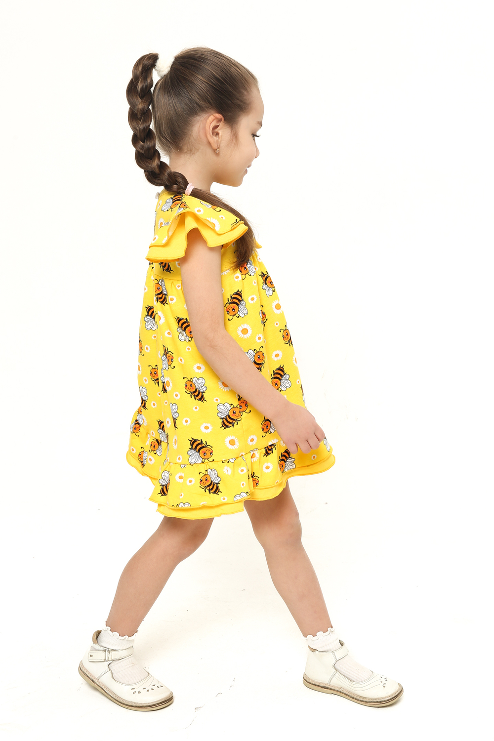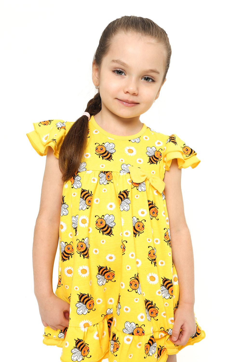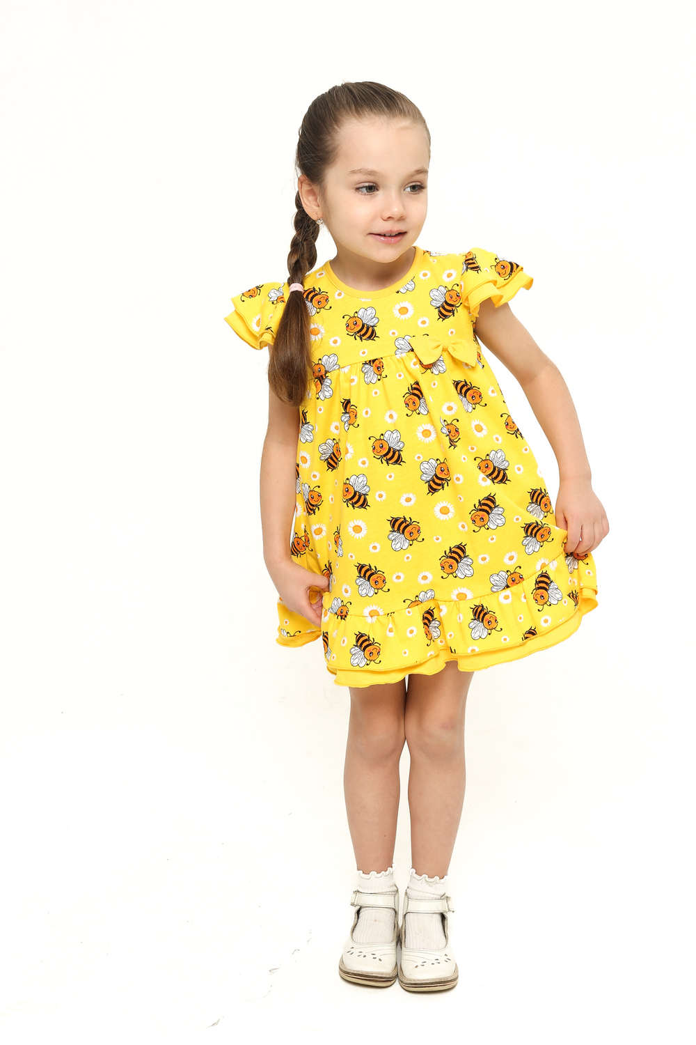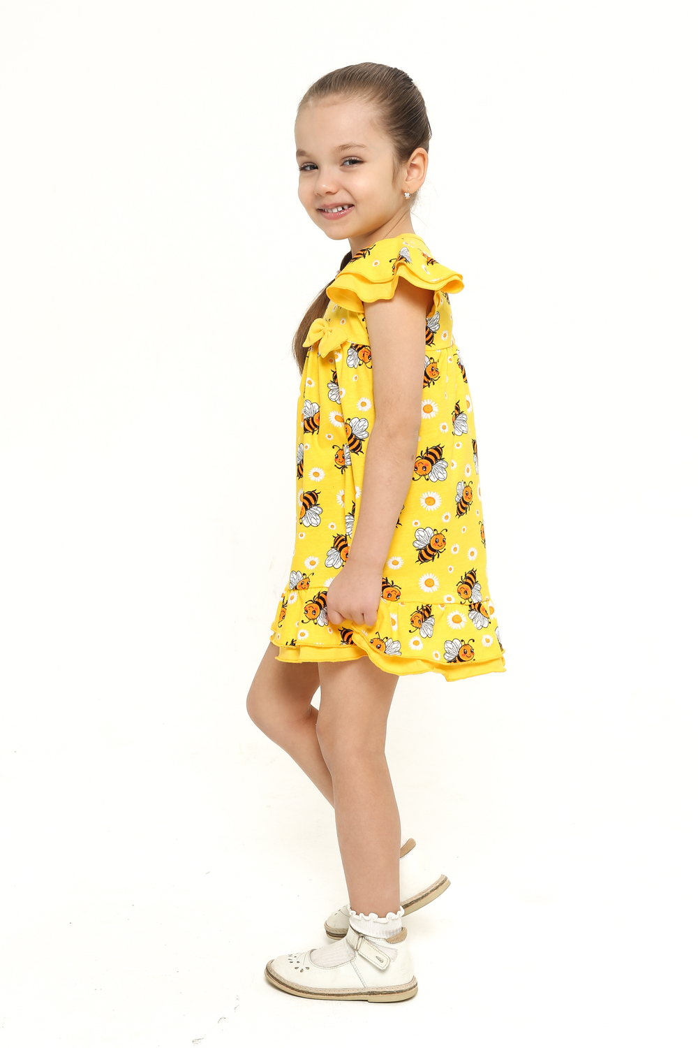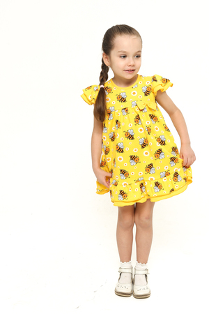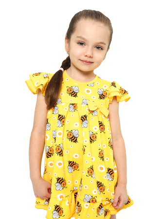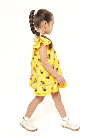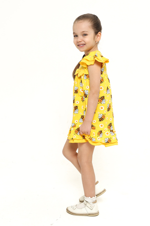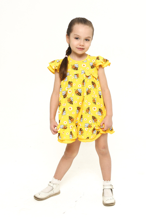 Платье выполнено из легкой и приятной к телу кулирки, украшенное веселым принтом с забавными пчелками и нежными ромашками на солнечном желтом фоне. Оно привлечет внимание своей свежестью и позитивностью, подчеркивая индивидуальность вашей малышки.
