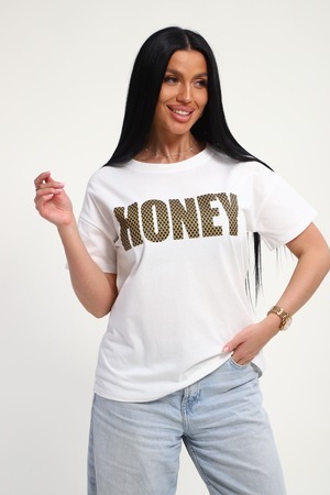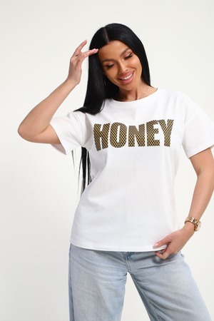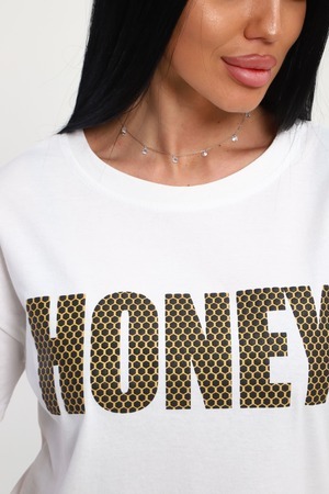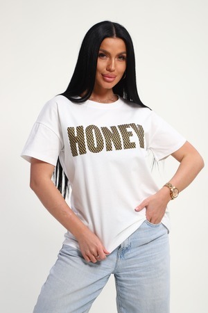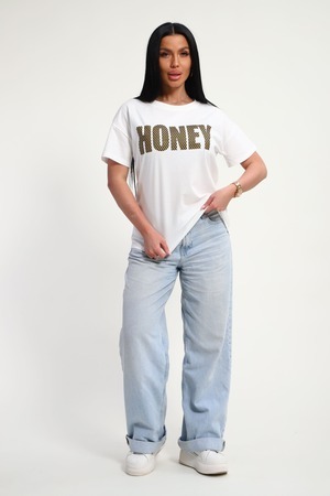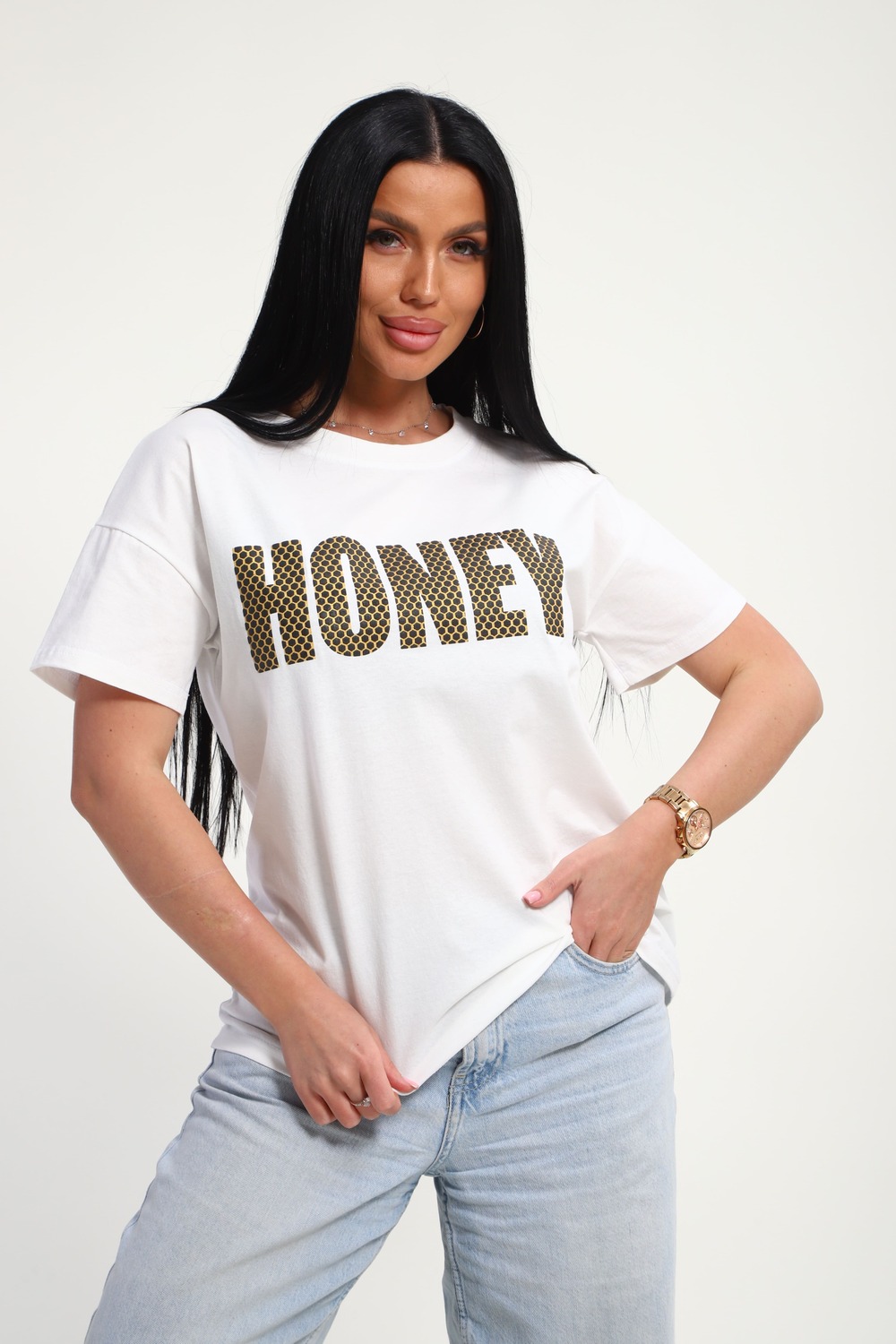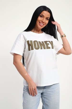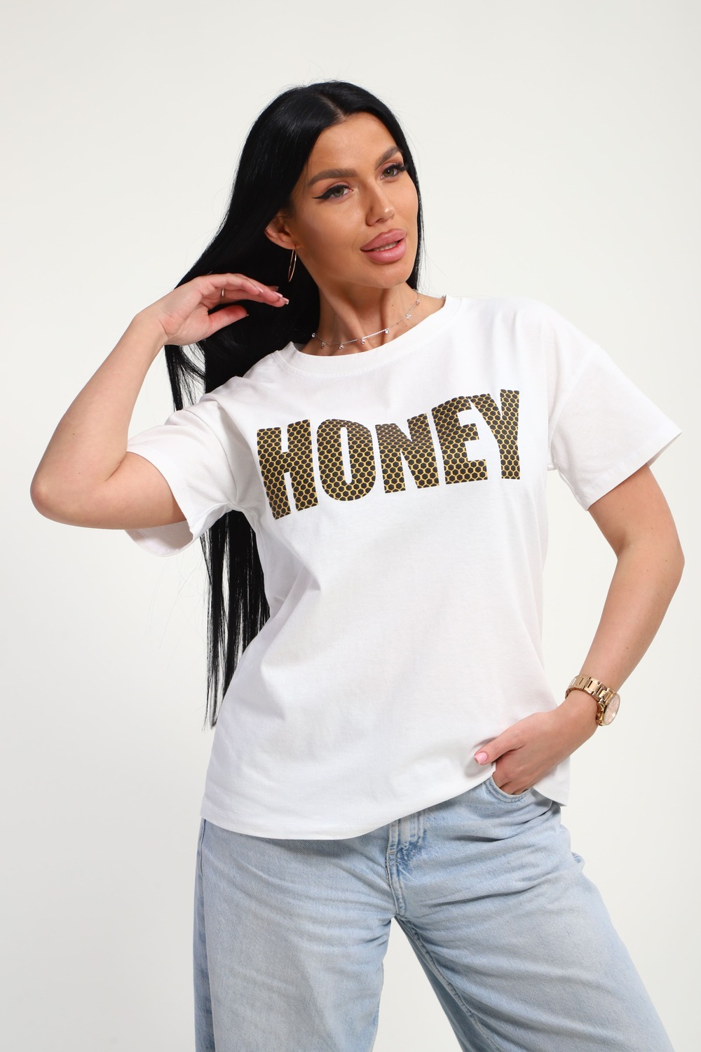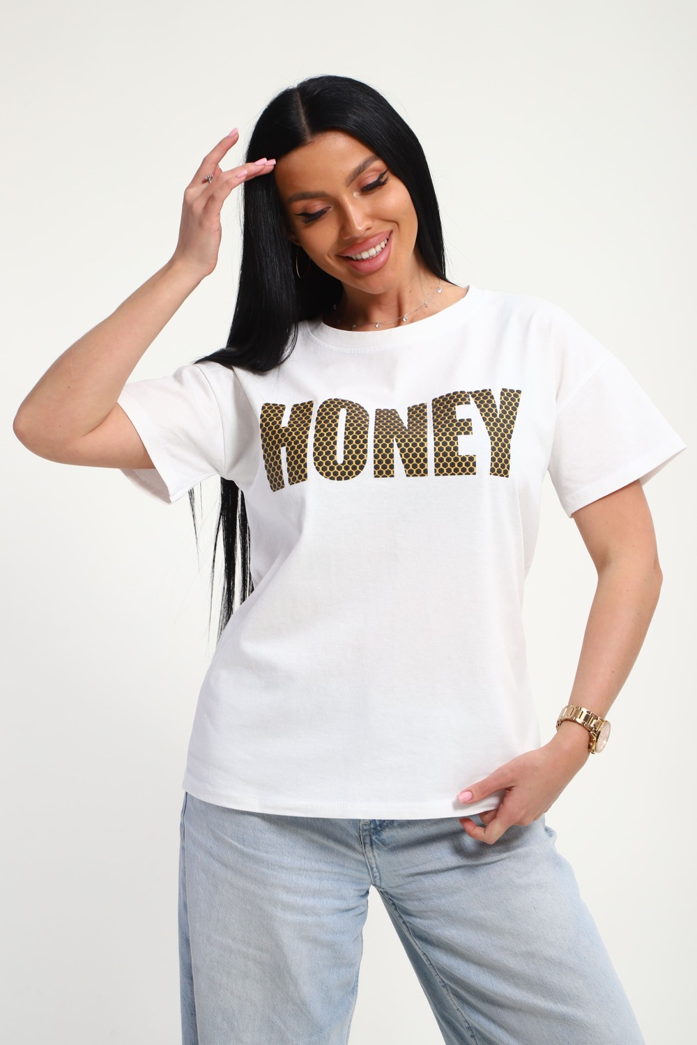 Футболка женская из гладкокрашенного трикотажа, хлопок 100%. Прямого силуэта, свободного облегания. горловина круглой формы. Рукав короткий. Низ изделия прямой. На полочке объемный принт, шелкография.