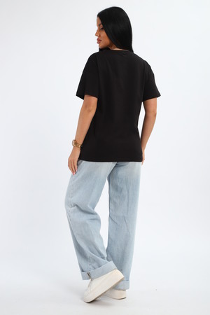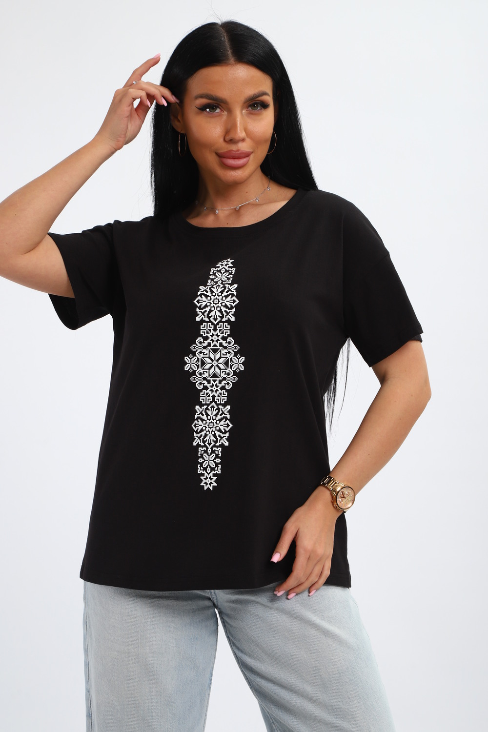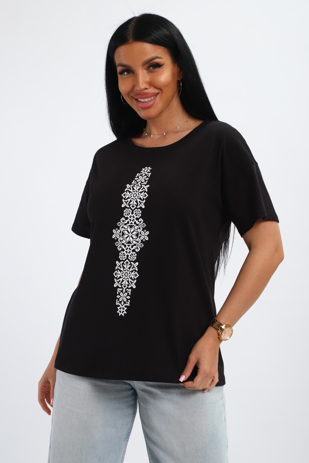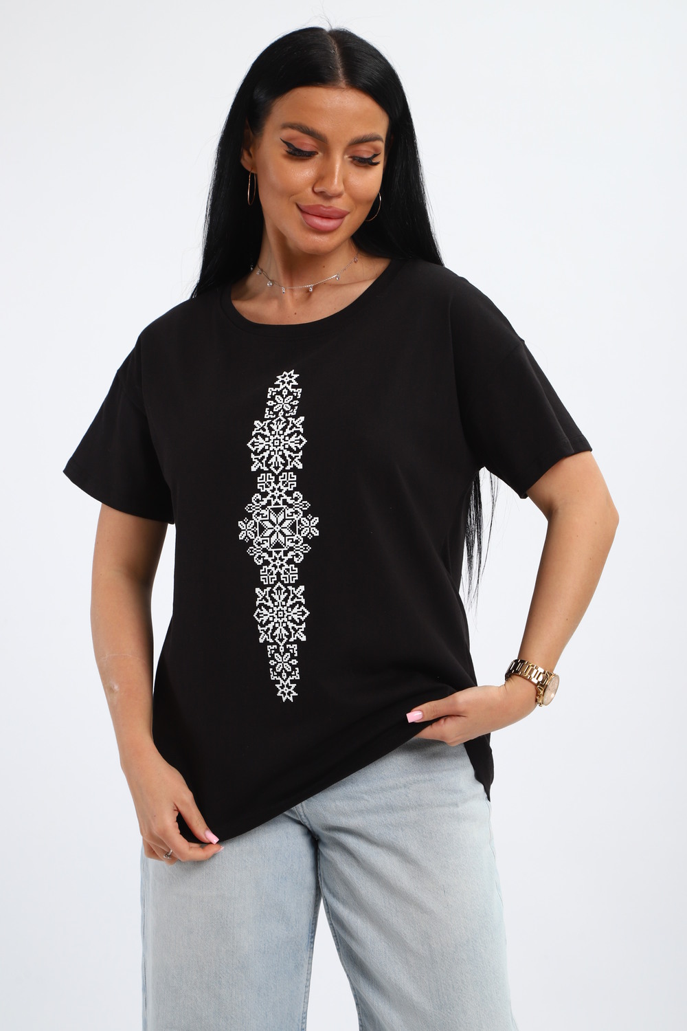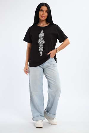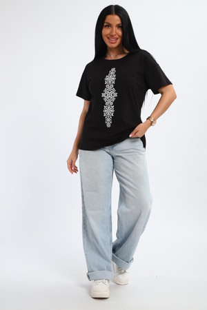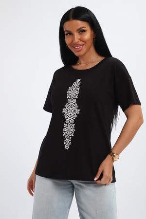 Футболка женская из гладкокрашенного трикотажа, хлопок 100%. Прямого силуэта, свободного облегания, горловина круглой формы. Рукав короткий. Низ изделия прямой. На полочке принт, шелкография.