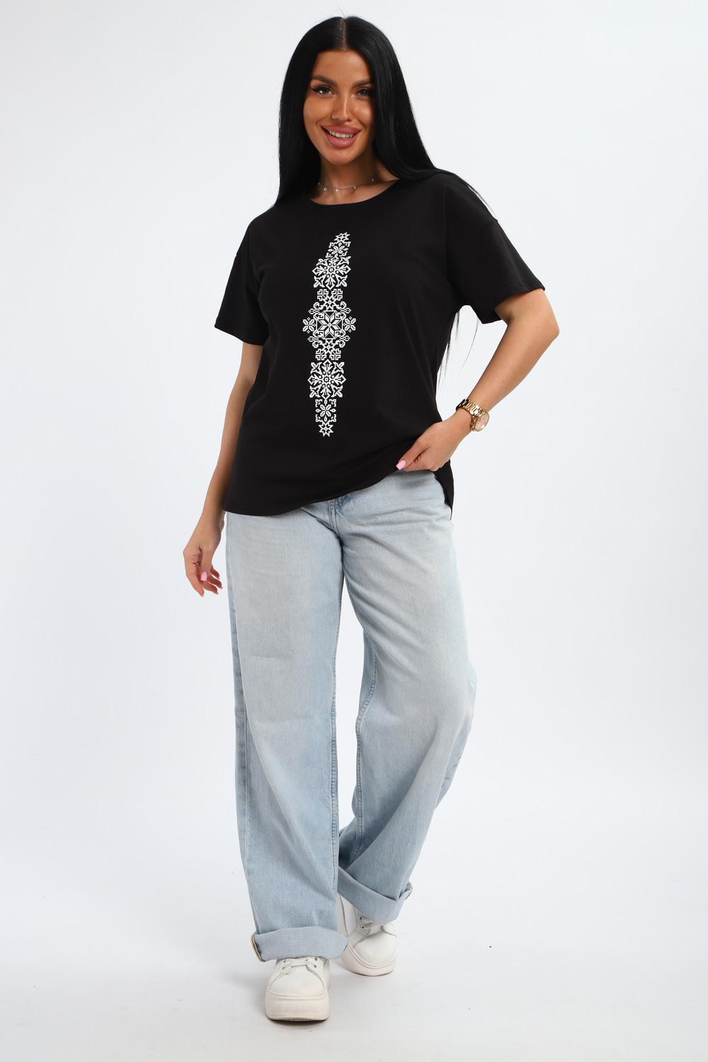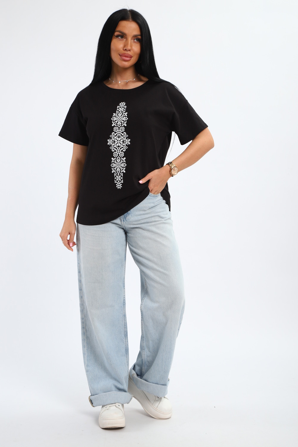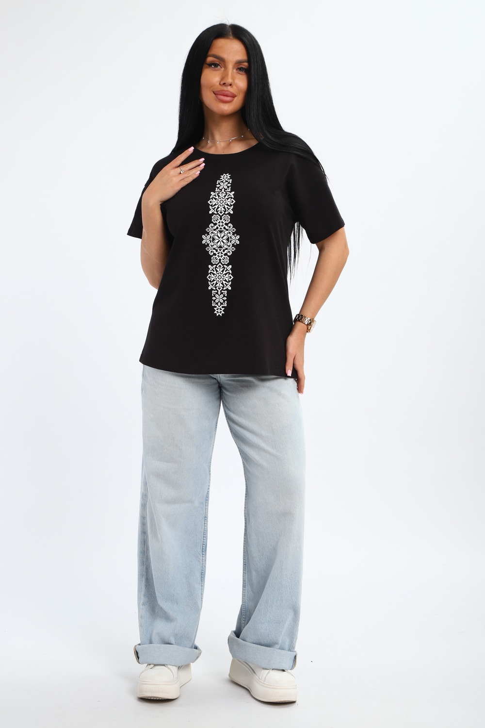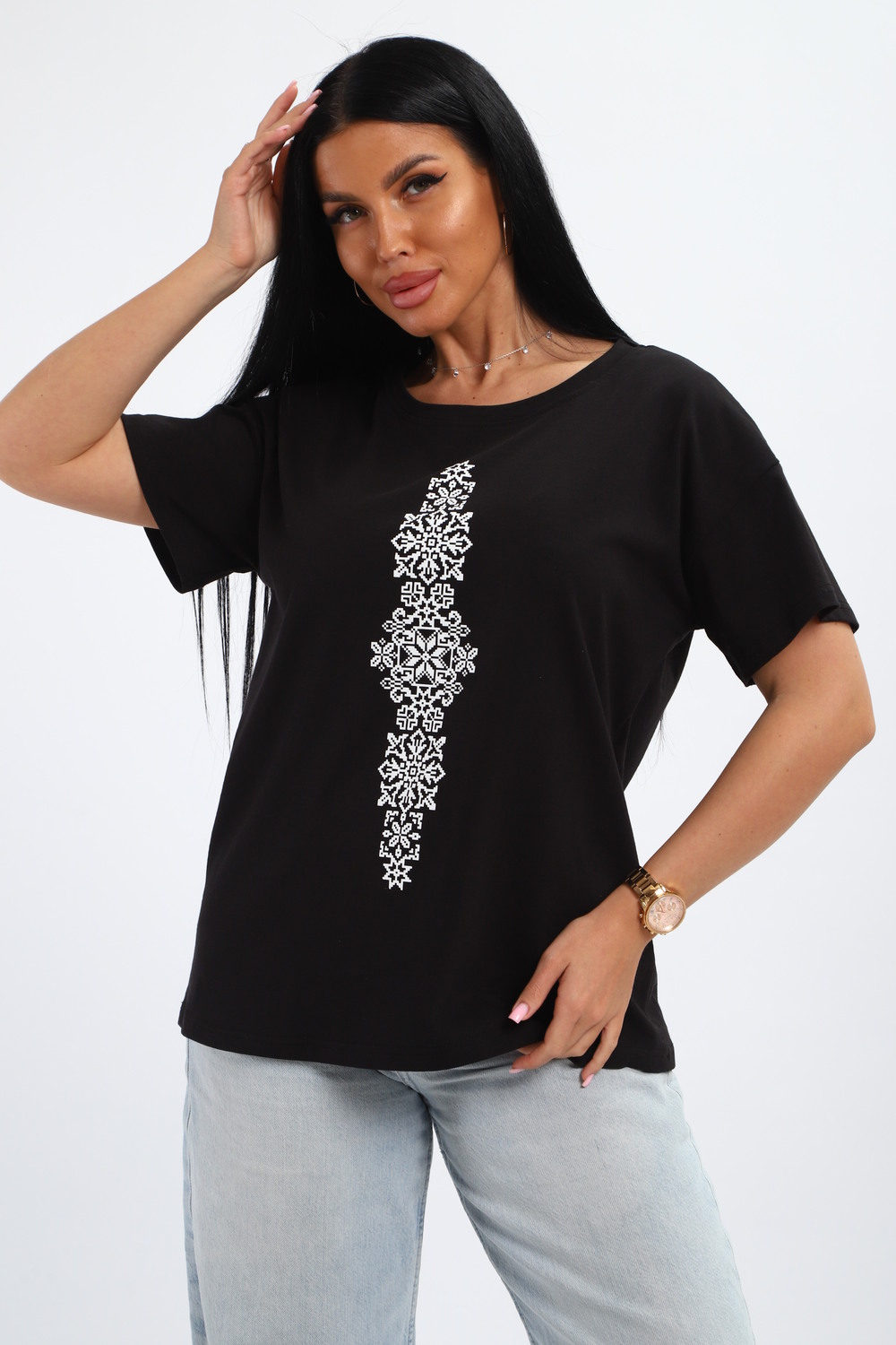 Футболка женская из гладкокрашенного трикотажа, хлопок 100%. Прямого силуэта, свободного облегания, горловина круглой формы. Рукав короткий. Низ изделия прямой. На полочке принт, шелкография.