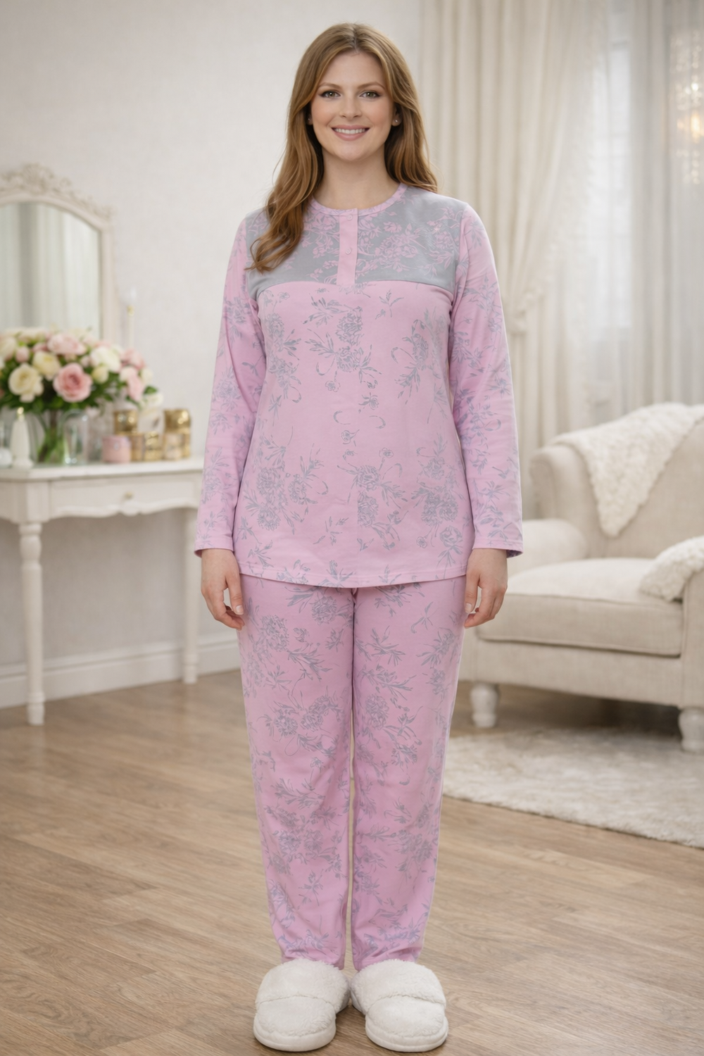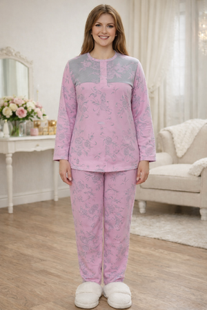 Женский домашний костюм выполнен из мягкого и приятного к телу трикотажа. Модель состоит из лонгслива с длинным рукавом и удобных брюк свободного кроя. Основной цвет — серый и розовый украшенный изящным цветочным принтом в пастельно-розовых оттенках. Верх костюма дополнен контрастной розовой вставкой в зоне груди, которая визуально освежает образ и делает его более женственным. Брюки с эластичным поясом обеспечивают комфортную посадку и свободу движений. Костюм идеально подходит для сна, отдыха и уютных домашних вечеров, сочетая в себе комфорт, практичность и элегантный внешний вид.