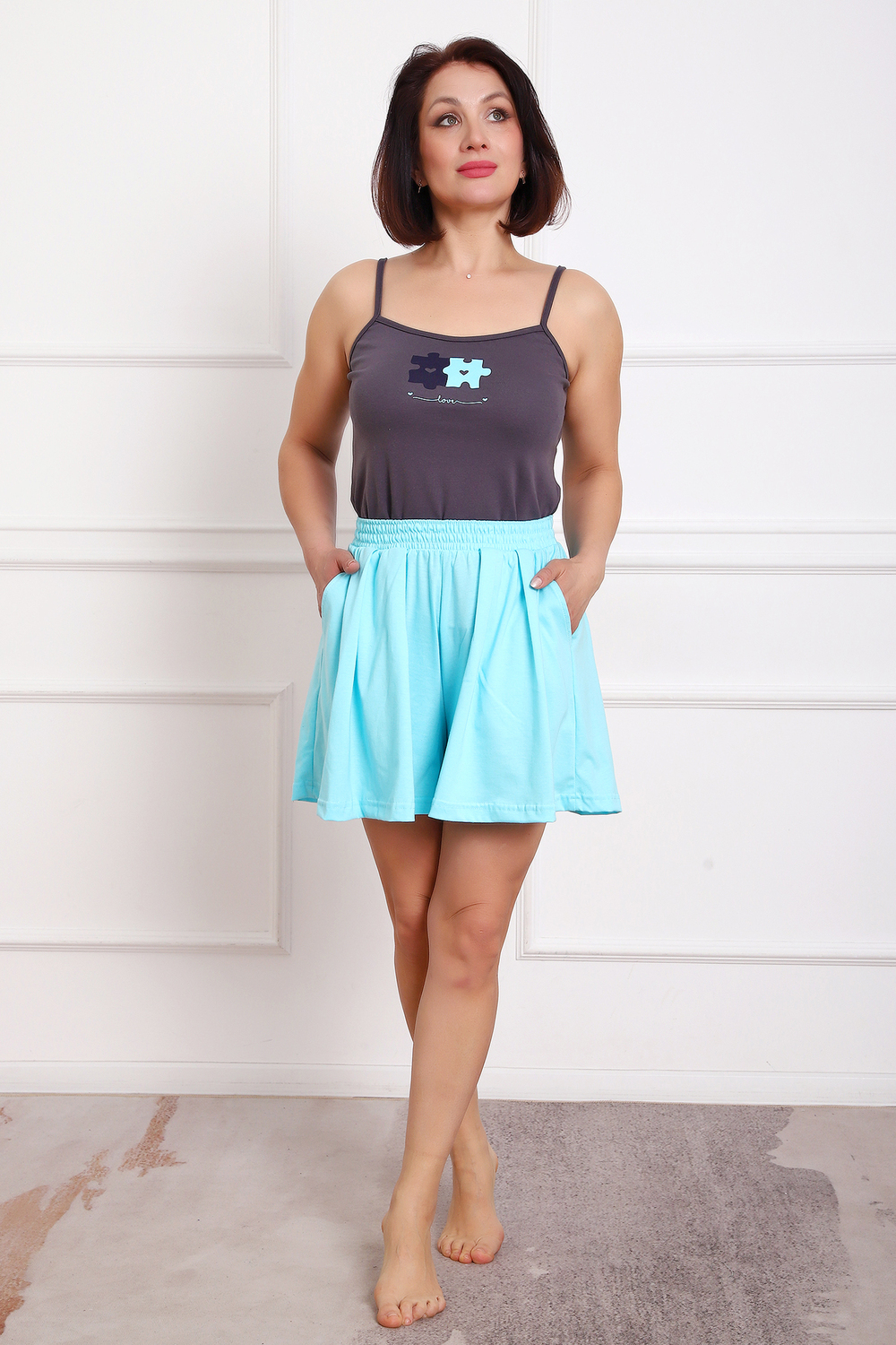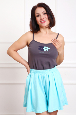Пижама женская топ и шорты-юбка. Топ данной модели выполнен из эластичного трикотажного полотна рибана с лайкрой (хлопок 94%, лайкра 6%). Шорты из трикотажного полотна кулирка (хлопок 100%). Шорты с карманами , поясом с широкой резинкой. Отличная модель , которая не стесняет движения, удобная и очень приятная.