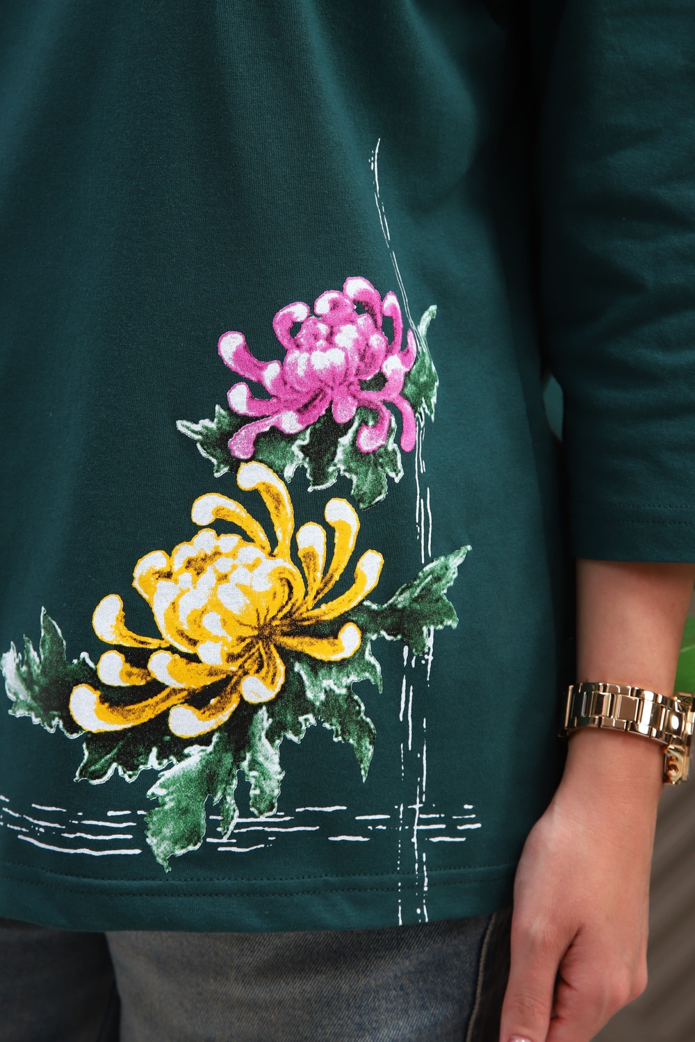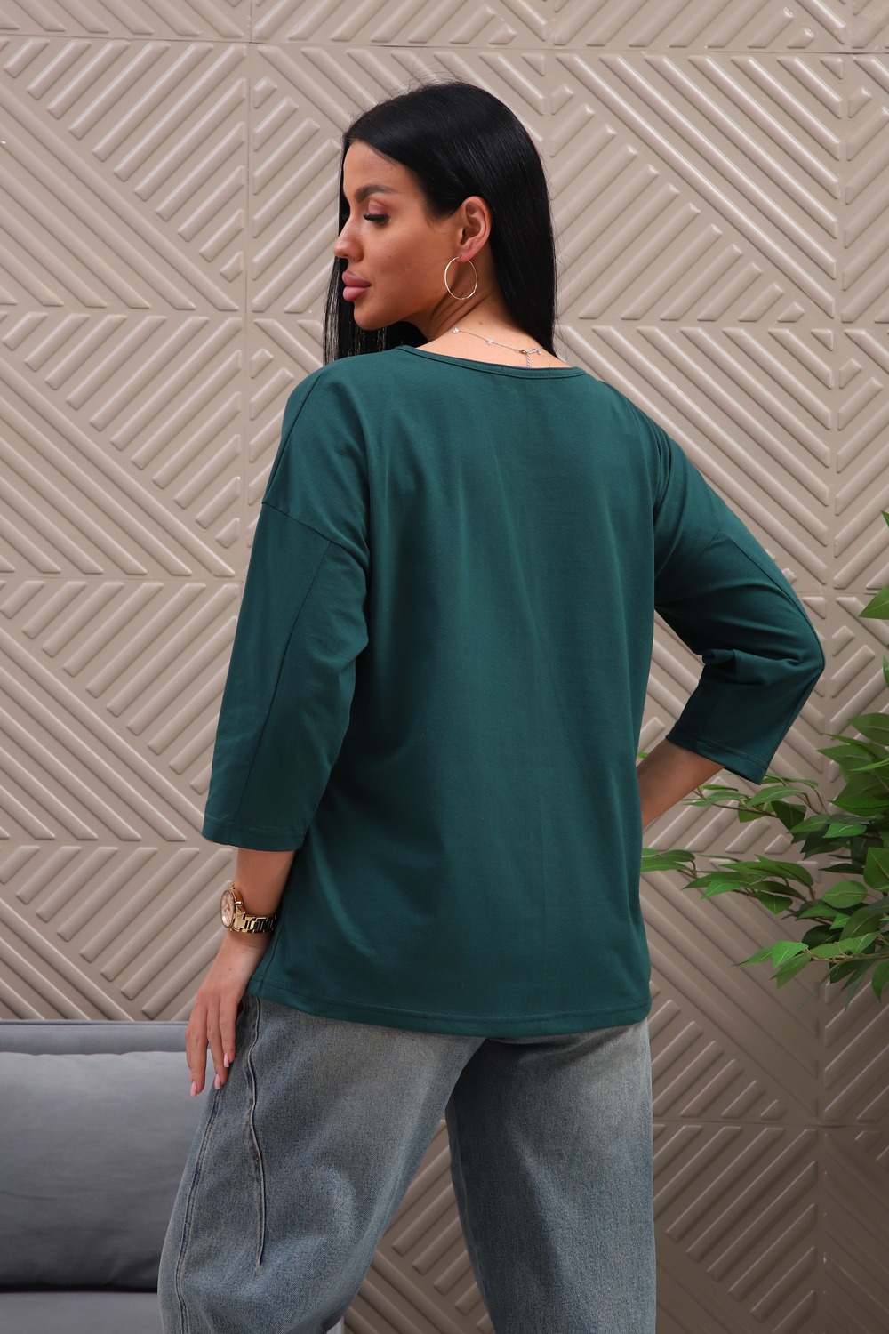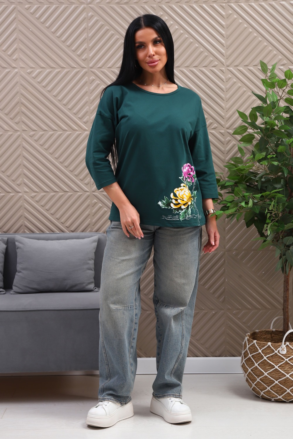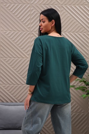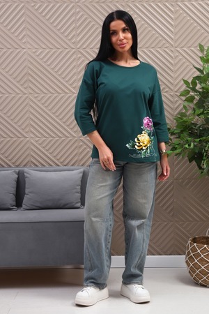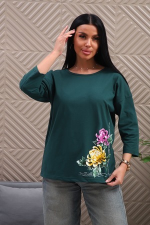 Туника женская. Ткань кулирка, хлопок 100%. Крой свободный, горловина круглой формы, обработана окантовкой. Линия плеч спущена. Длинна рукава 3/4, со швом по локтю. Низ изделия прямой. На полочке принт, шелкография.