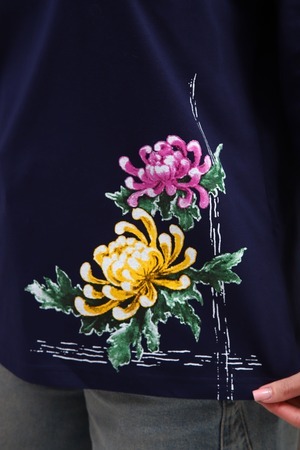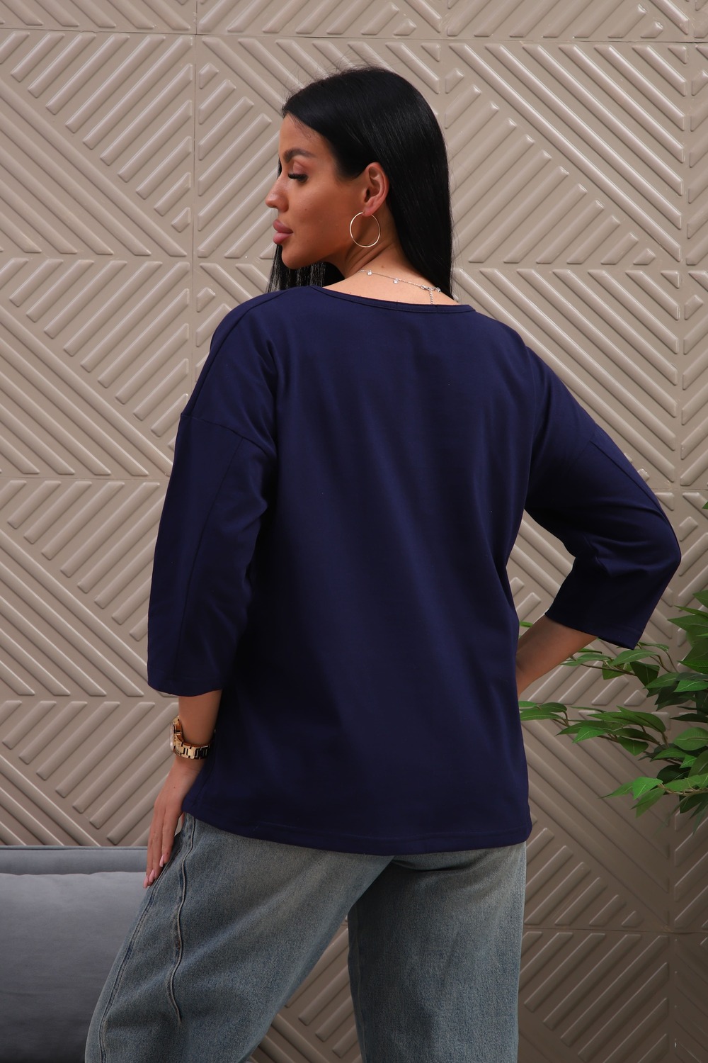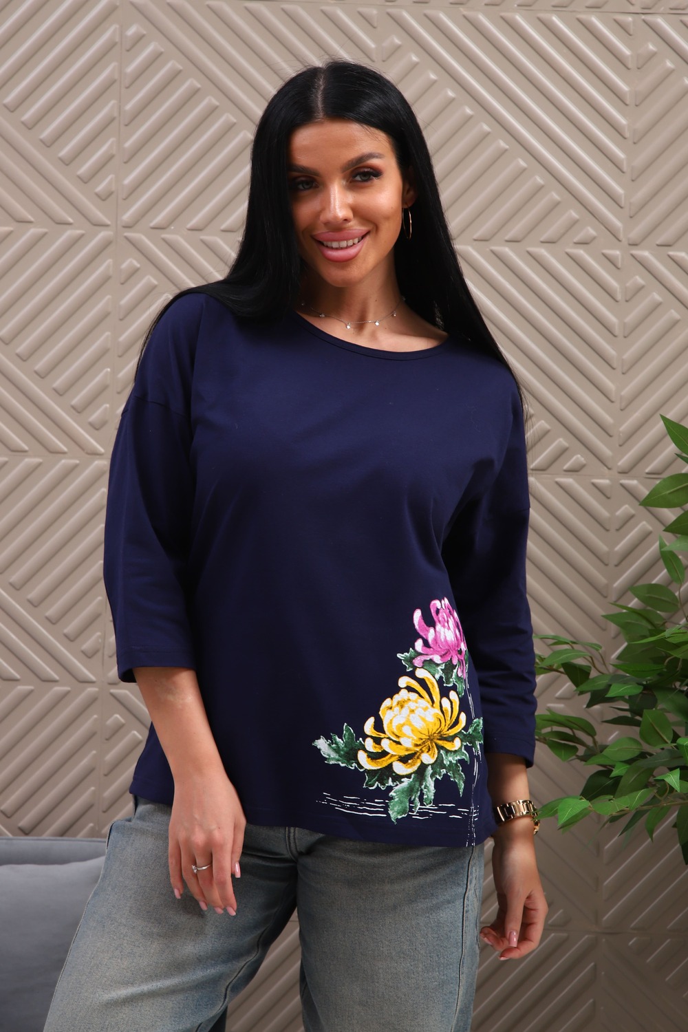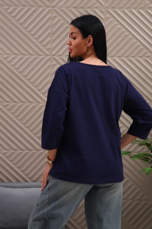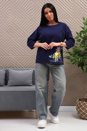 Туника женская. Ткань кулирка, хлопок 100%. Крой свободный, горловина круглой формы, обработана окантовкой. Линия плеч спущена. Длинна рукава 3/4, со швом по локтю. Низ изделия прямой. На полочке принт, шелкография.
