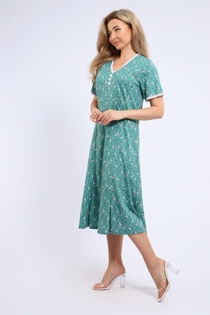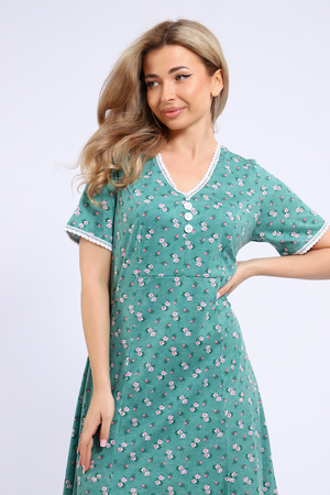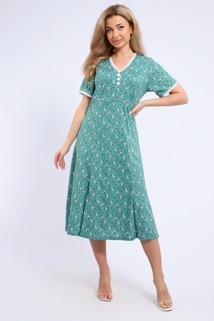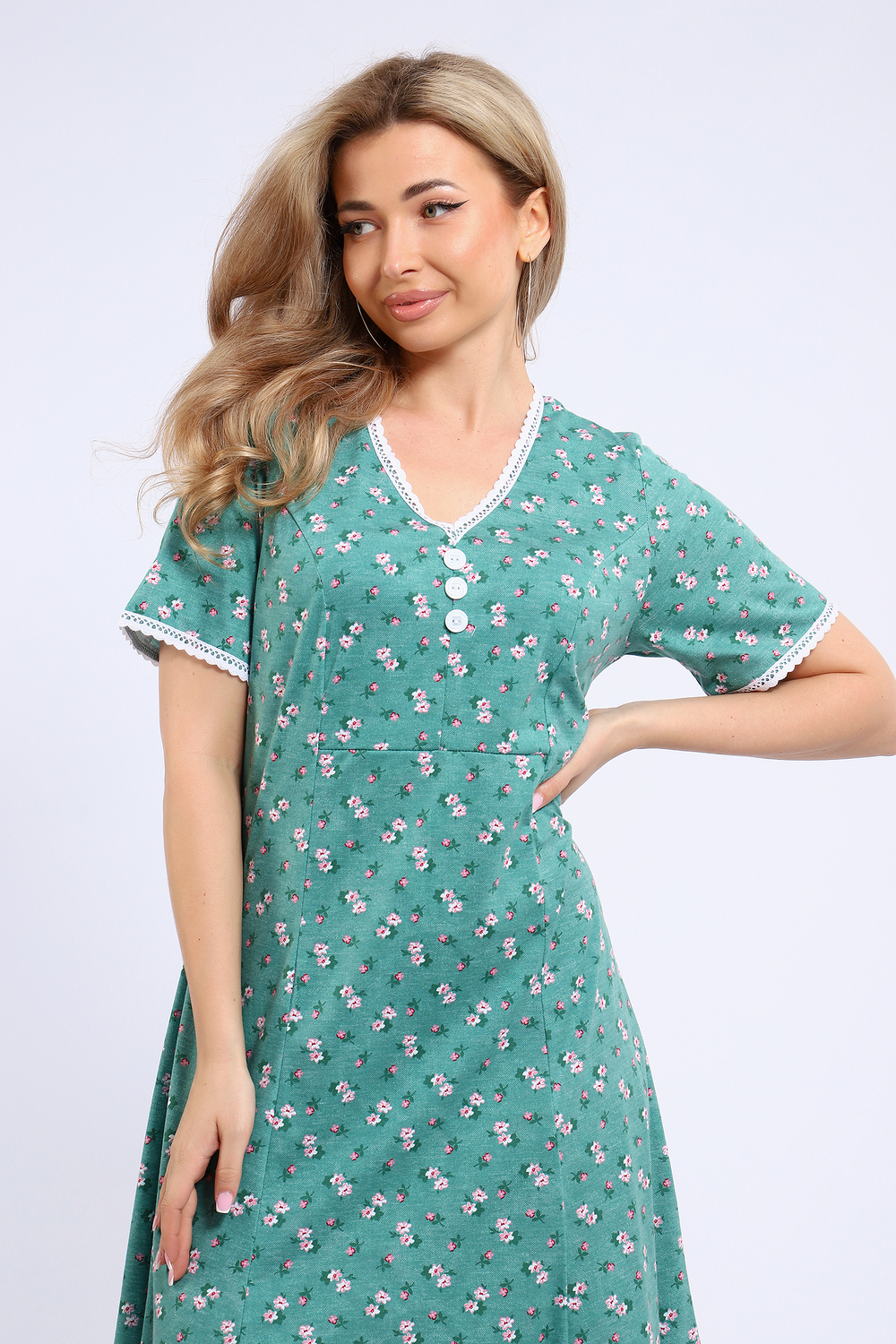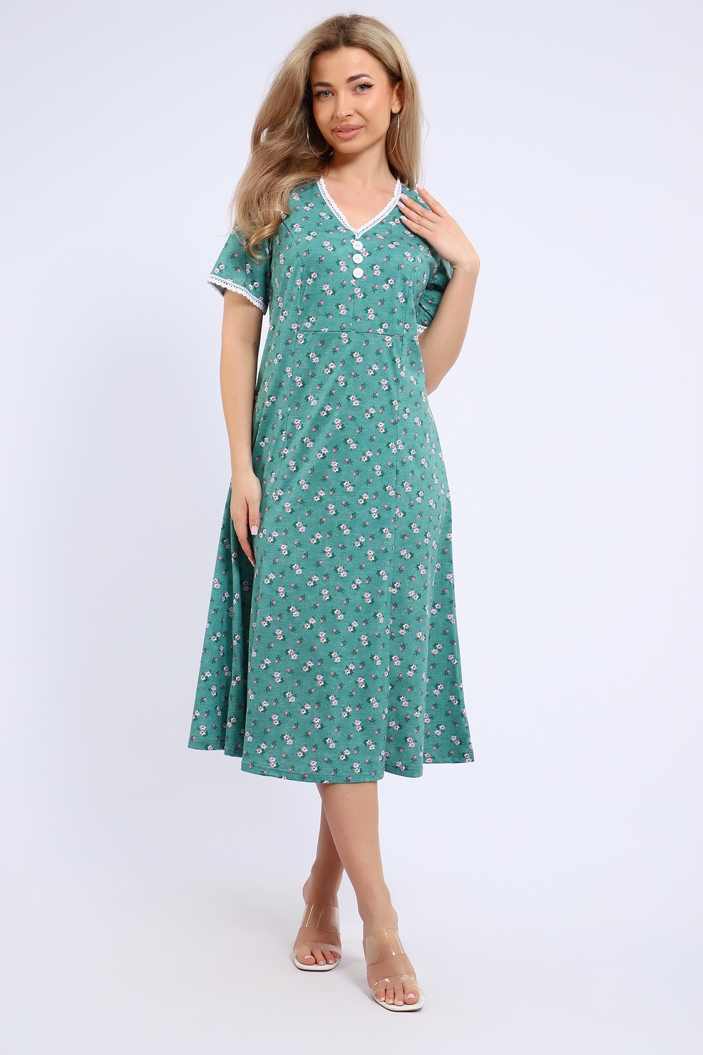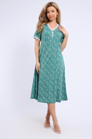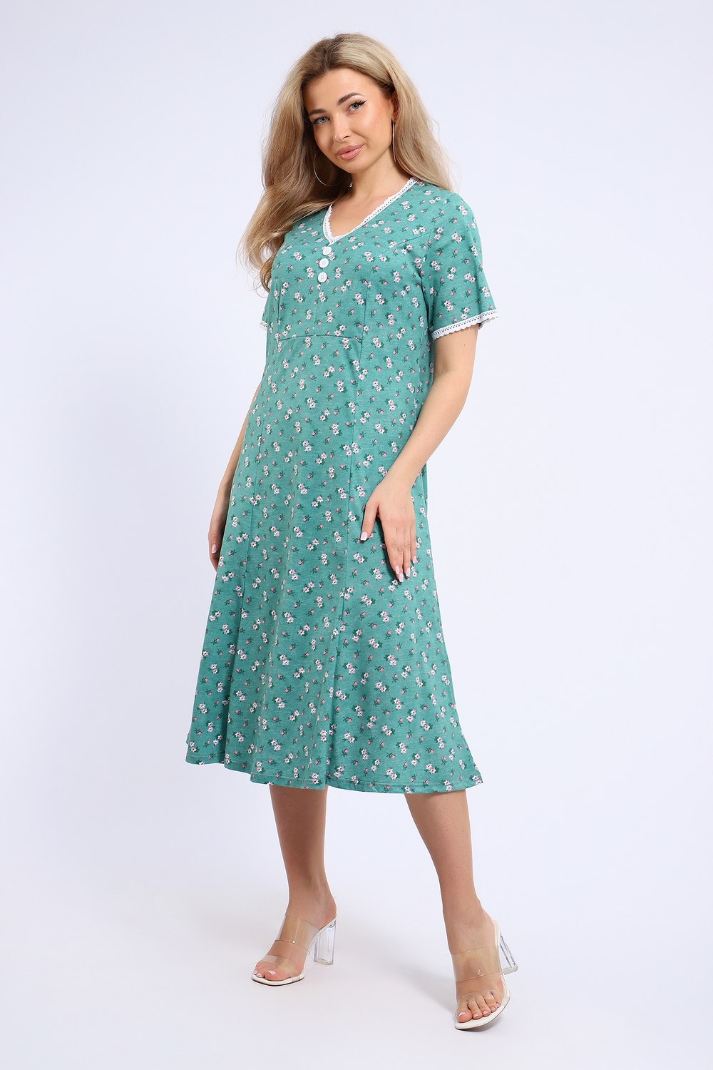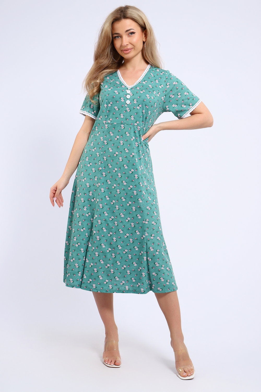 Платье женское выполнено в романтичном стиле из кулирки 100% хлопок. Платье с коротким рукавом, в области груди-подрез, горловина и края рукавов отделаны красивым х/б кружевом, пуговицы без петель. Платье очень женственное, комфортное, имеет отличную посадку по фигуре, подойдет для романтичных образов.