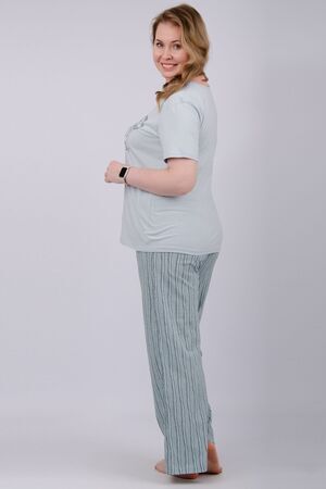 Наша пижама выполнена из мягкого и приятного на ощупь трикотажа, который обеспечивает максимальный комфорт во время сна и отдыха. Материал прекрасно дышит, не вызывает аллергии и раздражения кожи. Благодаря своей структуре он сохраняет тепло в холодное время года, и создает ощущение легкости и свежести в летнее время. Пижама представлена в нескольких размерах, включая большие, чтобы каждая женщина могла найти подходящий вариант, который подходит именно вам.