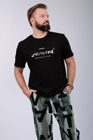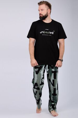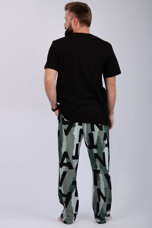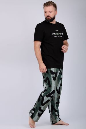 Пижама мужская: футболка прямого кроя с короткими рукавами с принтом на полочке, брюки прямые, с карманами в боковых швах.