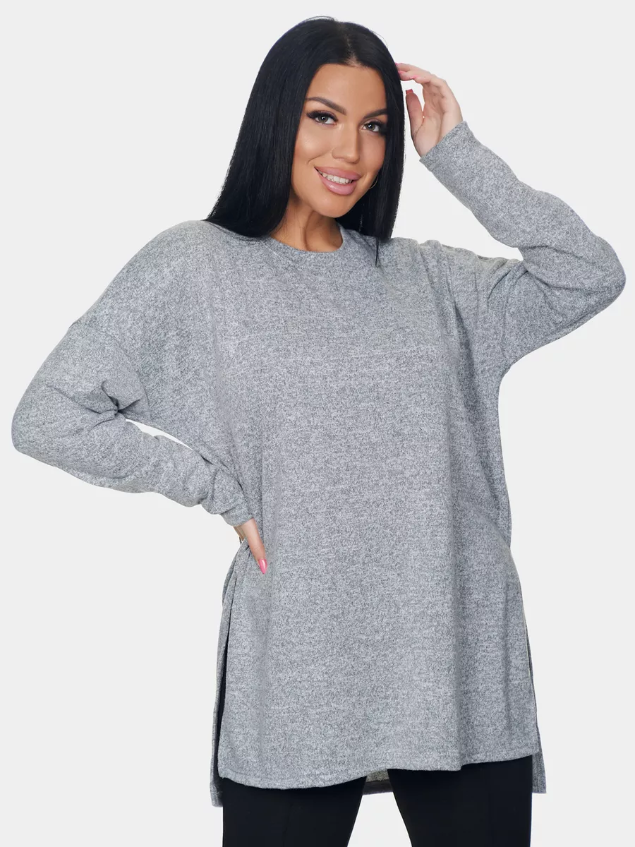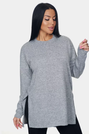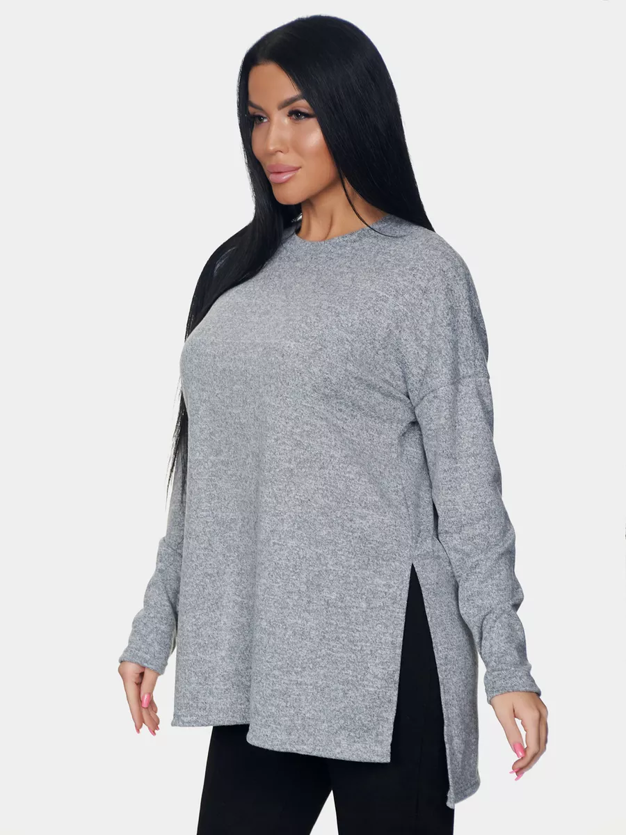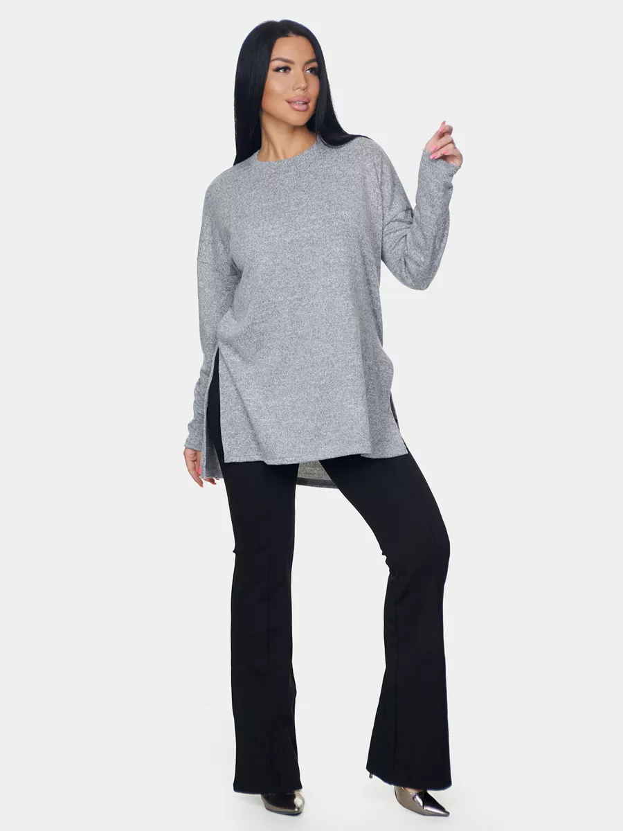 Длинный джемпер из ангоры софт обволакивает мягкостью, нежностью и теплом. Трикотажный пуловер меланжевый с длинными рукавами и с округлым вырезом горловины. Свободный крой и разрезы по бокам идеальны для любого типа фигуры. Трикотажный джемпер отлично подойдет для беременных и для женщин plus size.